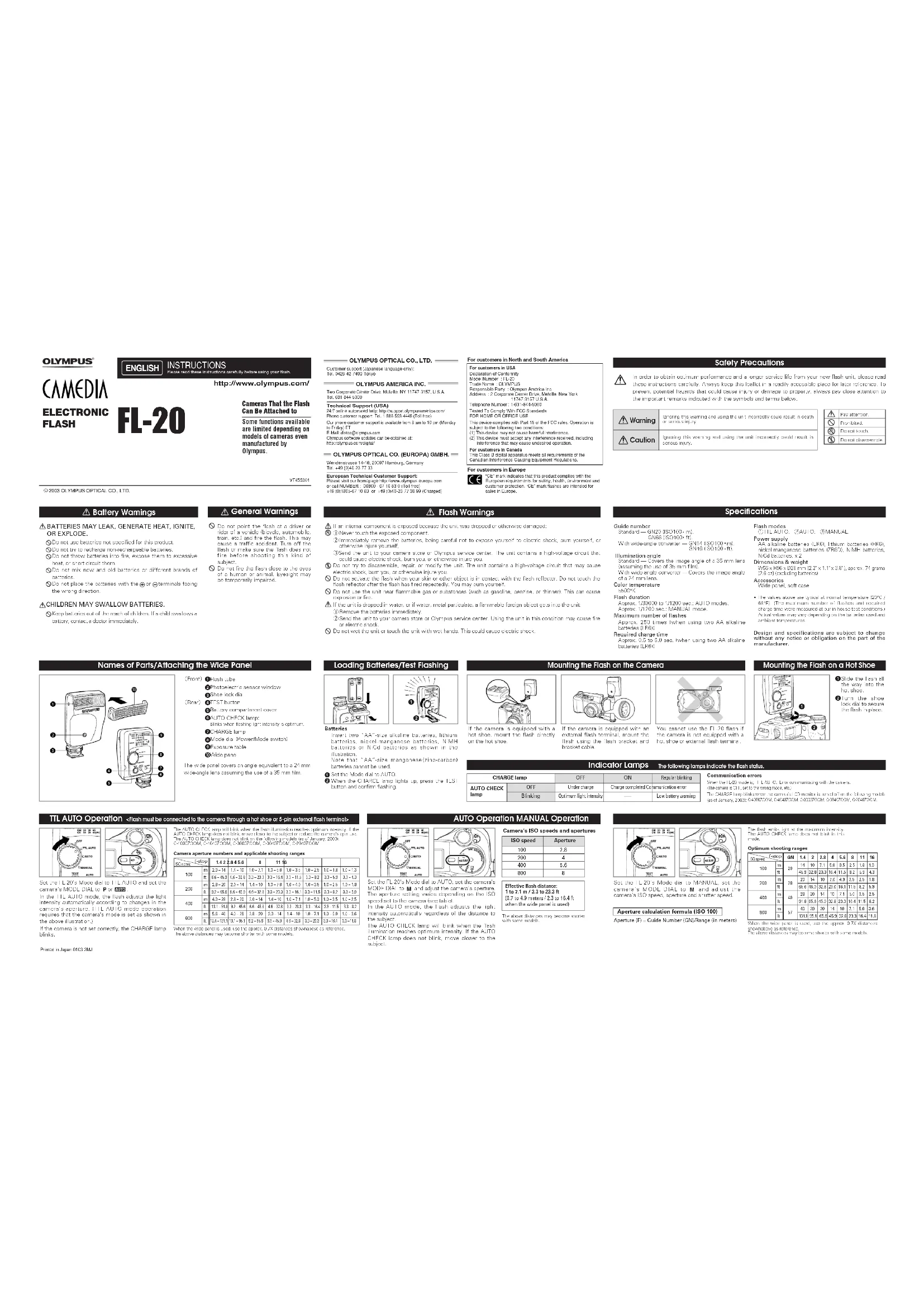 Aperture calculation formula (ISO 100) Aperture (F) = Guide Number (GN)/Range (in meters) Indicator Lamps The following lamps indicate the flash status. AUTO CHECK lamp Communication errorsWhen the FL-20 mode is; TTL AUTO: Error communicating with the camera.(The camera is OFF, set to the wrong mode, etc.) The CHARGE lamp blinks when the camera’s LCD monitor is turned off on the following models (as of January, 2003):C-4000ZOOM, C-4040ZOOM, C-3000ZOOM, C-3040ZOOM, C-2040ZOOM.CHARGE lamp OFF ONRegular blinking OFF Under charge Charge completed Communication errorBlinkingOptimum light intensity Low battery warningCustomer support (Japanese language only): Tel. 0426-42-7499 Tokyo OLYMPUS OPTICAL CO., LTD. Two Corporate Center Drive, Melville, NY 11747-3157, U.S.A. Tel. 631-844-5000Technical Support (USA)24/7 online automated help: http://support.olympusamerica.com/Phone customer support: Tel. 1-888-553-4448 (Toll-free)Our phone customer support is available from 8 am to 10 pm (Mondayto Friday) ETE-Mail: distec@olympus.comOlympus software updates can be obtained at:http://olympus.com/digital/For customers in North and South America OLYMPUS AMERICA INC. Wendenstrasse 14-18, 20097 Hamburg, Germany Tel. +49 (0)40-23 77 33European Technical Customer Support:Please visit our homepage http://www.olympus-europa.com or call NUMBER : 00800 - 67 10 83 0 (Toll-free)+49 (0)1805-67 10 83 or +49 (0)40-23 77 38 99 (Charged) OLYMPUS OPTICAL CO. (EUROPA) GMBH.VT455001The above distances may become shorterwith some models.Two Corporate Center Drive, Melville, NY 11747-3157, U.S.A. Tel. 631-844-5000Support technique (Etats-Unis)Aide en ligne 24/24H, 7/7 jours: http://support.olympusamerica.com/ Ligne téléphonique de support: Tél. 1-888-553-4448 (Appel gratuit) Notre support technique téléphonique est ouvert de 8 à 22 heures du lundi au vendrediE-Mail: distec@olympus.com Les mises à jour du logiciel Olympus sont disponibles à l’adresse suivante: http://olympus.com/digital/ MODE D'EMPLOI Nous vous recommandons de lire attentivement ce mode d'emploi avantd'utiliser votre flash. FRANÇAIS ELECTRONIC FLASH FL-20 http://www.olympus.com/ Appareils photos sur lesquels le flash peut être monté Certaines fonctionsdisponibles sont limitéesselon les modèlesd'appareils photos, mêmes'ils sont fabriqués parOlympus.© 2003 OLYMPUS OPTICAL CO., LTD.AvertissementPrécaution Précautions de sécurité Avant d'utiliser votre flash, veuillez lire attentivement ce mode d'emploi pour assurer une sécurité maximale et une durée de service plus longue. Après lecture, conservez ce livret dans un endroit toujours accessible pour une référence ultérieure. Des remarques importantes sont indiquées avec les symboles et termes ci-dessous. Veillez les respecter pour ne pas endommager le matériel et éviter tout danger corporal. Ignorer cet avertissement et utiliser le flash de façon incorrecte pourrait causer de sérieuses blessures. Ignorer cet avertissement et utiliser le flash de façon incorrecte pourrait entraîner la mort ou causer de sérieuses blessures. Avertissements concernant les piles LES PILES PEUVENT COULER, GÉNÉRER DE LA CHALEUR, PRENDRE FEU OU EXPLOSER. Ne pas utiliser des piles non spécifiées pour ce produit. Ne pas essayer de recharger des piles non rechargeables. Ne pas jeter les piles au feu, les exposer à une chaleur intense ni les court-circuiter. Ne pas mélanger des piles neuves avec des piles usagées ni différentes marques de piles. Ne pas installer les piles avec les bornes et placées dans le mauvais sens. LES ENFANTS PEUVENT AVALER DES PILES. Conserver les piles hors de la portée des enfants. Consulter immédiatement un médecin si un enfant avale une pile. Faire attention. Interdit Ne pas toucher. Ne pas démonter. Avertissements généraux Ne pas pointer l'appareil photo sur un conducteur ou pilote d'un véhicule (bicyclette, voiture, train, etc.) et déclencher le flash. Ce qui pourrait causer un accident de la circulation. Coupez le flash ou assurez-vous que le flash ne va pas se déclencher avant de prendre un tel sujet. Ne pas déclencher le flash à proximité des yeux d'un homme ou d'un animal. La vue pourrait être momentanément affaiblie. Avertissements concernant le flash Si une pièce interne est visible parce que le flash est tombé ou a été endommagé: ① Ne jamais toucher à la pièce visible. ② Retirer immédiatement les piles, faire attention de ne pas vous exposer à un choc électrique, ne pas vous brûler ni vous blesser d'une autre façon. ③Retourner le flash à votre magasin photo ou à un centre de service Olympus. Le flash contient un circuit haute tension qui peut causer des chocs électriques, vous brûler ou vous blesser d'une autre façon. Ne pas essayer de démonter, réparer ni modifier le flash. Le flash contient un circuit haute tension qui pourrait causer des chocs électriques, vous brûler ou vous blesser d'une autre façon. Ne pas activer le flash lorsque votre peau ou un objet quelconque est en contact avec le réflecteur du flash. Ne pas toucher au réflecteur du flash après que le flash a été déclenché plusieurs fois de suite. Vous pourriez vous brûler. Ne pas utiliser le flash près de gaz ou substances inflammables (comme l'essence, la benzine ou du diluant). Ce qui pourrait causer une explosion ou un incendie. Si le flash est tombé dans l'eau, ou si de l'eau, une pièce métallique ou un objet étranger inflammable est entré dans le flash: ① Retirer immédiatement les piles. ② Retourner le flash à votre magasin photo ou à un centre de service Olympus. Utiliser le flash dans ces conditions pourrait causer un incendie ou des chocs électriques. Ne pas mouiller le flash ni le toucher avec les mains humides. Ce qui pourrait causer des chocs électriques. Données techniques Nombre guide Standard — GN 20 (ISO100