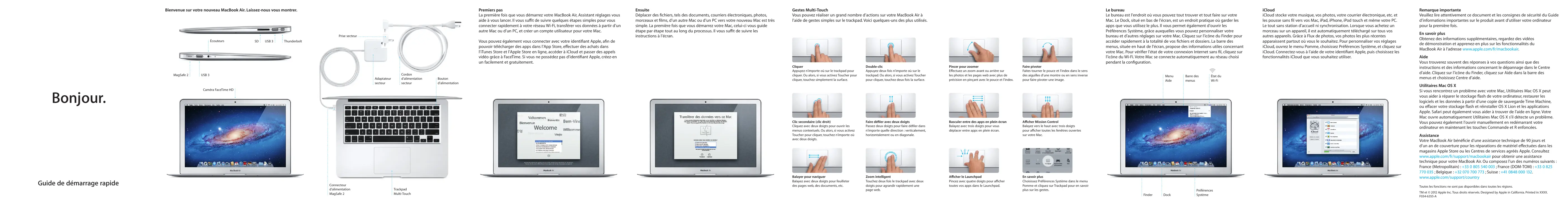 Veuillez lire attentivement ce document et les consignes de sécurité du Guide d’informations importantes sur le produit avant d’utiliser votre ordinateur pour la première fois. En savoir plus Obtenez des informations supplémentaires, regardez des vidéos de démonstration et apprenez-en plus sur les fonctionnalités du MacBook Air à l’adresse www.apple.com/fr/macbookair. Aide Vous trouverez souvent des réponses à vos questions ainsi que des instructions et des informations concernant le dépannage dans le Centre d’aide. Cliquez sur l’icône du Finder, cliquez sur Aide dans la barre des menus et choisissez Centre d’aide. Utilitaires Mac OS X Si vous rencontrez un problème avec votre Mac, Utilitaires Mac OS X peut vous aider à réparer le stockage flash de votre ordinateur, restaurer les logiciels et les données à partir d’une copie de sauvegarde Time Machine, ou effacer votre stockage flash et réinstaller OS X Lion et les applications Apple. Safari peut également vous aider à trouver de l’aide en ligne. Votre Mac ouvre automatiquement Utilitaires Mac OS X s’il détecte un problème. Vous pouvez également l’ouvrir manuellement en redémarrant votre ordinateur en maintenant les touches Commande et R enfoncées.