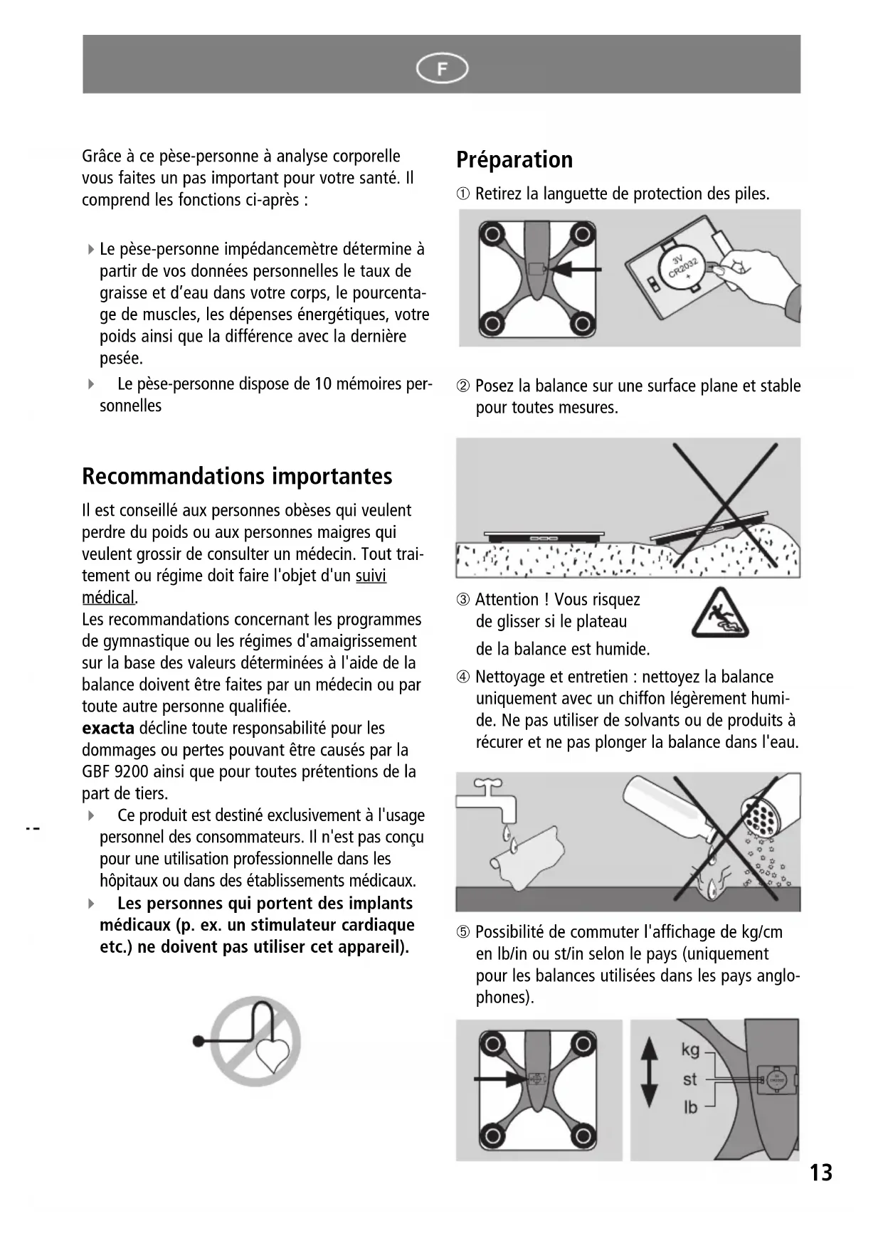 Les recommendations concernant les programmes de gymnastique ou les régimes d'amaigrissement sur la base des valeurs déterminées à l'aide de la balance doivent être faites par un medecin ou par toute autre personne qualifiée.