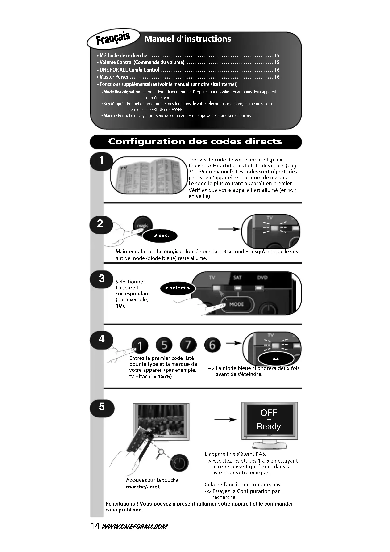 3 sec. < select > 3 sec. Appuyez sur la touchePOWER.Sélectionnez l'appareil correspondant (par exemple, dvd). < select > Sélectionnez l'appareil correspondant (par exemple, tv).Maintenez la touche magicenfoncée pendant 3 secondes.--> La diode bleu clignotera deux foisavant de s'éteindre.Quel est mon code de configuration ? Vous pouvez configurer votre télécommande ONE FOR ALL à l'aide d'une des méthodes suivantes :