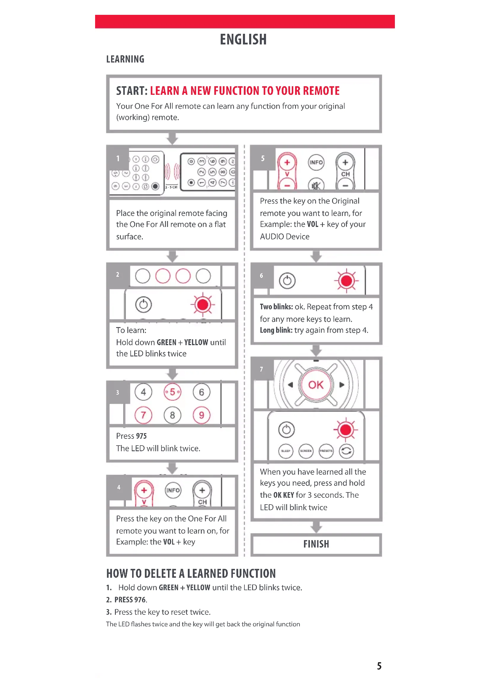 FRANÇAIS Deux clignotements: OK. Répétez la procédure à partir de l'étape4 pour associer d'autres touches. Clignotement long: réessayez en reprenant à partir de l'étape4. APPRENTISSAGE TERMINER Pour enregistrer une fonction: Maintenez les touches VERTE ET JAUNE enfoncées jusqu'à ce que le voyant clignote deux fois. Appuyez sur 975. Le voyant lumineux clignote deux fois. Lorsque vous avez enregistré toutes les touches de fonction nécessaires, maintenez la touche OK enfoncée pendant 3secondes. Le voyant lumineux clignote deux fois.