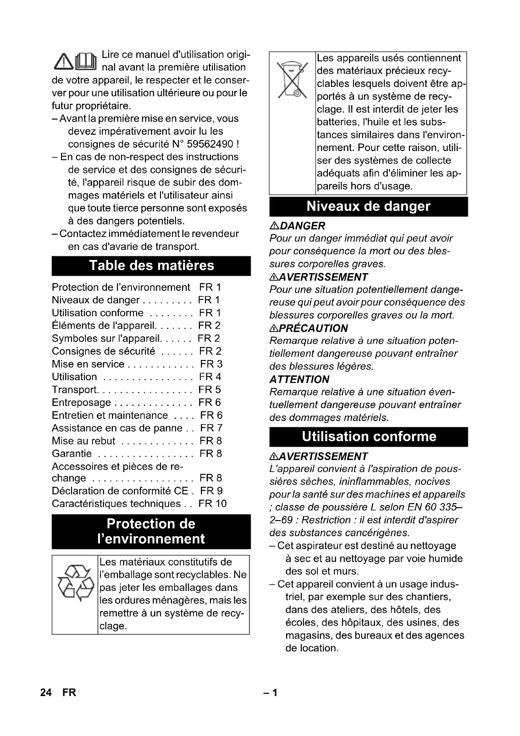 Part no.: Cable length EU 297.534 7.5 m 23EN– 1 Lire ce manuel d'utilisation origi- nal avant la première utilisation de votre appareil, le respecter et le conser- ver pour une utilisation ultérieure ou pour le futur propriétaire. – Avant la première mise en service, vous devez impérativement avoir lu les consignes de sécurité N° 59562490 ! – En cas de non-respect des instructions de service et des consignes de sécuri- té, l'appareil risque de subir des dom- mages matériels et l'utilisateur ainsi que toute tierce personne sont exposés à des dangers potentiels. – Contactez immédiatement le revendeur en cas d'avarie de transport. DANGER Pour un danger immédiat qui peut avoir pour conséquence la mort ou des bles- sures corporelles graves. 몇 AVERTISSEMENT Pour une situation potentiellement dange- reuse qui peut avoir pour conséquence des blessures corporelles graves ou la mort. 몇 PRÉCAUTION Remarque relative à une situation poten- tiellement dangereuse pouvant entraîner des blessures légères. ATTENTION Remarque relative à une situation éven- tuellement dangereuse pouvant entraîner des dommages matériels. 몇 AVERTISSEMENT L'appareil convient à l'aspiration de pous- sières sèches, ininflammables, nocives pour la santé sur des machines et appareils ; classe de poussière L selon EN 60 335– 2–69 : Restriction : il est interdit d'aspirer des substances cancérigènes. – Cet aspirateur est destiné au nettoyage à sec et au nettoyage par voie humide des sol et murs. – Cet appareil convient à un usage indus- triel, par exemple sur des chantiers, dans des ateliers, des hôtels, des écoles, des hôpitaux, des usines, des magasins, des bureaux et des agences de location. Table des matières Protection de l’environnement FR 1 Niveaux de danger ... FR 1 Utilisation conforme ... FR 1 Éléments de l'appareil... FR 2 Symboles sur l'appareil... FR 2 Consignes de sécurité ... FR 2 Mise en service ... FR 3 Utilisation ... FR 4 Transport... FR 5 Entreposage ... FR 6 Entretien et maintenance ... FR 6 Assistance en cas de panne ... FR 7 Mise au rebut ... FR 8 Garantie ... FR 8 Accessoires et pièces de re- change ... FR 8 Déclaration de conformité CE . FR 9 Caractéristiques techniques ... FR 10 Protection de l’environnement Les matériaux constitutifs de l’emballage sont recyclables. Ne pas jeter les emballages dans les ordures ménagères, mais les remettre à un système de recy- clage. Les appareils usés contiennent des matériaux précieux recy- clables lesquels doivent être ap- portés à un système de recy- clage. Il est interdit de jeter les batteries, l'huile et les subs- tances similaires dans l'environ- nement. Pour cette raison, utili- ser des systèmes de collecte adéquats afin d'éliminer les ap- pareils hors d'usage. Niveaux de danger Utilisation conforme 24 FR– 2 1 Electrodes 2 Flexible d’aspiration 3 Crochet de câble 4 Sortie d'air, air de travail 5 Verrouillage de la tête d'aspiration 6 Adaptateur universel 7 Entrée d'air, air de refroidissement du moteur 8 Récipient collecteur 9 Tête d'aspiration 10 Roues directionnelles 11 Raccord d'aspiration 12 Buse de sol (ne faisant pas partie de la fourniture) 13 Tube d'aspiration (ne faisant pas partie de la fourniture) 14 Poignée de transport 15 Recouvrement du filtre 16 Coude (ne faisant pas partie de la livrai- son) 17 Régulateur de puissance d'aspiration (continu) 18 Régulateur rotatif pour la puissance d'aspiration (mini-maxi) 19 Témoin de contrôle 20 Prise de courant 21 Nettoyage automatique du filtre 22 Interrupteur principal 23 Filtre plat de plis 24 Nettoyage du filtre 25 Support pour buse de sol 26 Support pour buse à joint 27 Support pour tubes d'aspiration 28 Câble d’alimentation 29 Plaque signalétique 몇 AVERTISSEMENT – Si l'air évacué est renvoyé dans la pièce, le taux de renouvellement d'air L dans la pièce doit être suffisant. Pour respecter les valeurs limites exigées, le débit volumétrique réintroduit doit re- présenter au maximum 50% du débit volumétrique d’air frais (Volume espace