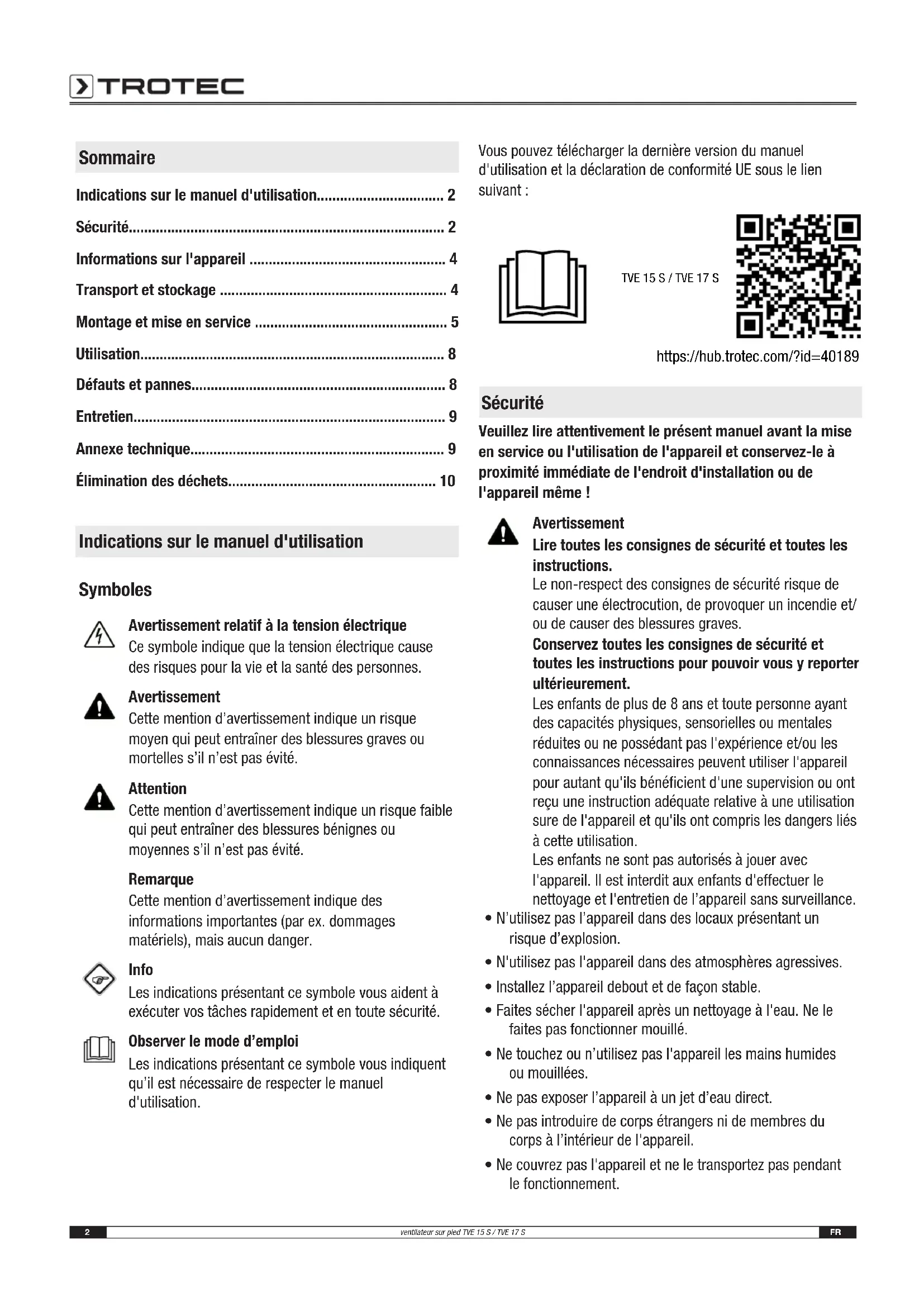 https://hub.trotec.com/?id=40189 Sécurité Veuillez lire attentivement le présent manuel avant la mise en service ou l'utilisation de l'appareil et conservez-le à proximité immédiate de l'endroit d'installation ou de l'appareil même! Avertissement Lire toutes les consignes de sécurité et toutes les instructions. Le non-respect des consignes de sécurité risque de causer une électrocution, de provoquer un incendie et/ ou de causer des blessures graves. Conservez toutes les consignes de sécurité et toutes les instructions pour pouvoir vous y reporter ultérieurement. Les enfants de plus de 8 ans et toute personne ayant des capacités physiques, sensorielles ou mentales réduites ou ne possédant pas l'expérience et/ou les connaissances nécessaires peuvent utiliser l'appareil pour autant qu'ils bénéficient d'une supervision ou ont reçu une instruction adéquate relative à une utilisation sure de l'appareil et qu'ils ont compris les dangers liés à cette utilisation. Les enfants ne sont pas autorisés à jouer avec l'appareil. Il est interdit aux enfants d'effectuer le nettoyage et l'entretien de l’appareil sans surveillance.