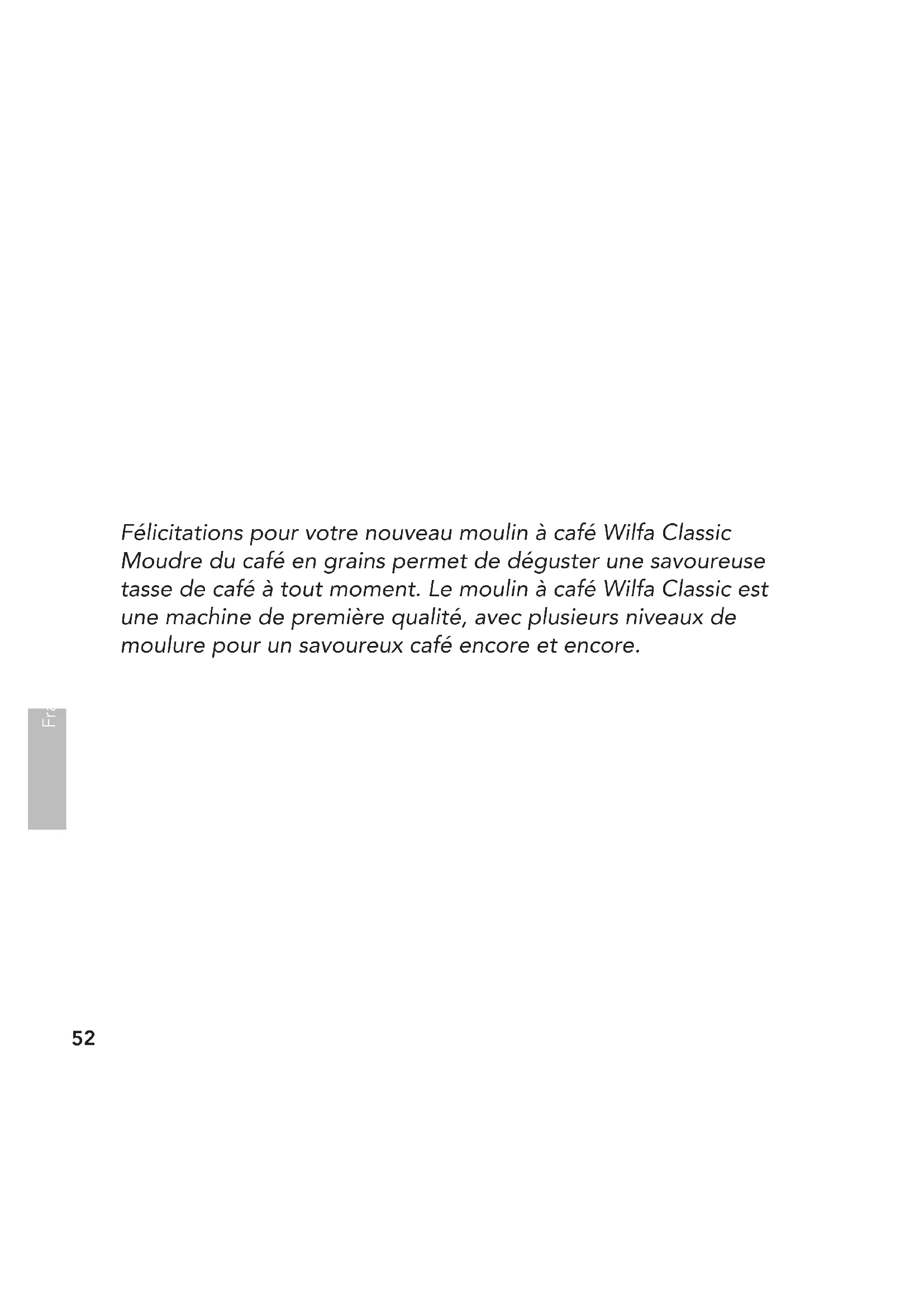 - Renoncer à tout nettoyage ou travail de maintenance tant que la machine est branchée au secteur. Guide de dépannage En cas de panne de la machine, en rechercher la cause dans le tableau suivant. Si le problème persiste, faire appel au revendeur ou à un atelier de réparation agréé. Français62 Problèmes Causes possibles Solution Le moulin à café ne fonctionne pas quand on appuie sur le bouton. La fiche n’est pas correctement branchée. Brancher la fiche correctement. La tension du secteur ne correspond pas à la norme d’alimentation. Vérifier que la tension du secteur est de 220 à 240 V. Le réservoir de grains n’est pas correctement insérée et le niveau de mouture n’est pas défini ; réglé sur «OFF». Réinsérer la tasse à grains et définir le niveau de mouture en faisant pivoter vers la droite. Le réservoir pour café fraîchement moulu n’est pas correctement inséré. Insérer le réservoir pour café fraîchement moulu en position adéquate. FinskFinskFrançais63 Ongelma Mahdollisia syitä Ratkaisu Le temps de mouture n’a pas été défini ; le minuteur affiche « 0 ». Faire pivoter le bouton du minuteur pour définir le temps de mouture. Le moteur s’arrête dû à une surcharge. Contacter le revendeur ou un technicien pour faire réparer ou remplacer la machine. Bruit aigu, aucun grain n’entre dans la machine ; aucun café moulu produit. Moulin bloqué. Éteindre la machine et retirer les grains. Vérifier qu’aucune matière dure n’a été mélangée aux grains de café et qu’aucun des composants n’est endommagé. Français64 Le fabricant se réserve le droit d’effectuer des modications techniques. Fabriqué et importé au nom d’AS Wilfa. GARANTIE Wilfa accorde sur ce produit une garantie de 5 ans à compter de la date d’achat. Cette garantie couvre les défauts de production ou les anomalies survenant durant la période de garantie. Le reçu du produit fait ofce de preuve d’achat. Pour tout recours en garantie, contacter le magasin où le produit a été acheté. La garantie n’est valide que sur les produits achetés et utilisés à titre privé. Elle n’est pas valide si le produit fait l’objet d’un usage commercial. La garantie est invalidée en cas de mauvaise utilisation du produit, de négligence, de non-respect des consignes de Wilfa, de modication ou de réparation non autorisée. La garantie n’est pas valide en cas d’usure naturelle du produit, de mauvaise utilisation, de défaut d’entretien ou de mise sous tension erronée ou en cas de: Surcharge du produit Pièces concernées par une usure naturelle Filtre, pile ou autres pièces à remplacer régulièrement Les consignes ci-présentes sont également disponibles sur notre site Internet www.wilfa.com FinskFinskFrançais65 Français66 FinskFinskFrançais67 Français Ce marquage indique que l’élimination de ce produit avec les déchets ménagers est proscrite dans toute l’Union européenne. Pour éviter tout dommage de l’environnement ou risque sur la santé de l’Homme dû à une élimination des déchets inadéquate, recycler en toute responsabilité pour encourager la réutilisation durable des ressources matérielles. Pour retourner le dispositif usagé, recourir aux systèmes de recueil et retour ou faire appel au fournisseur du produit. Ils pourront reprendre le produit pour un recyclage sécurisé environnemental. AS WILFA Nydalsveien 24 0484 Oslo Norge wilfa.comAS WILFA Nydalsveien 24 0484 Oslo, Norge Wilfa.com