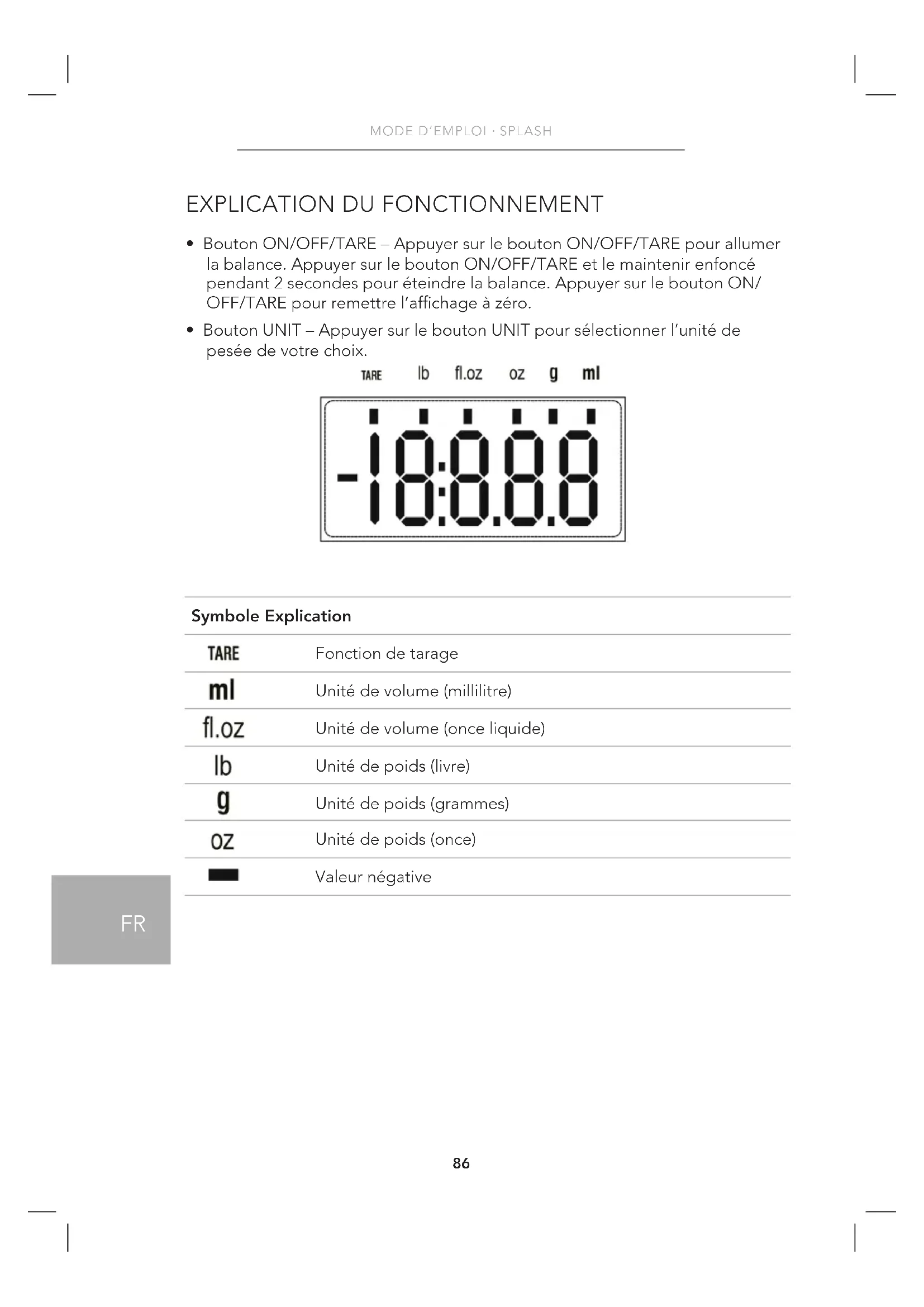 - Bouton UNIT – Appuyer sur le bouton UNIT pour sélectionner l’unité de pesée de votre choix. Symbole Explication Fonction de tarage Unité de volume (millilitre) Unité de volume (once liquide) Unité de poids (livre) Unité de poids (grammes) Unité de poids (once) Valeur négative87