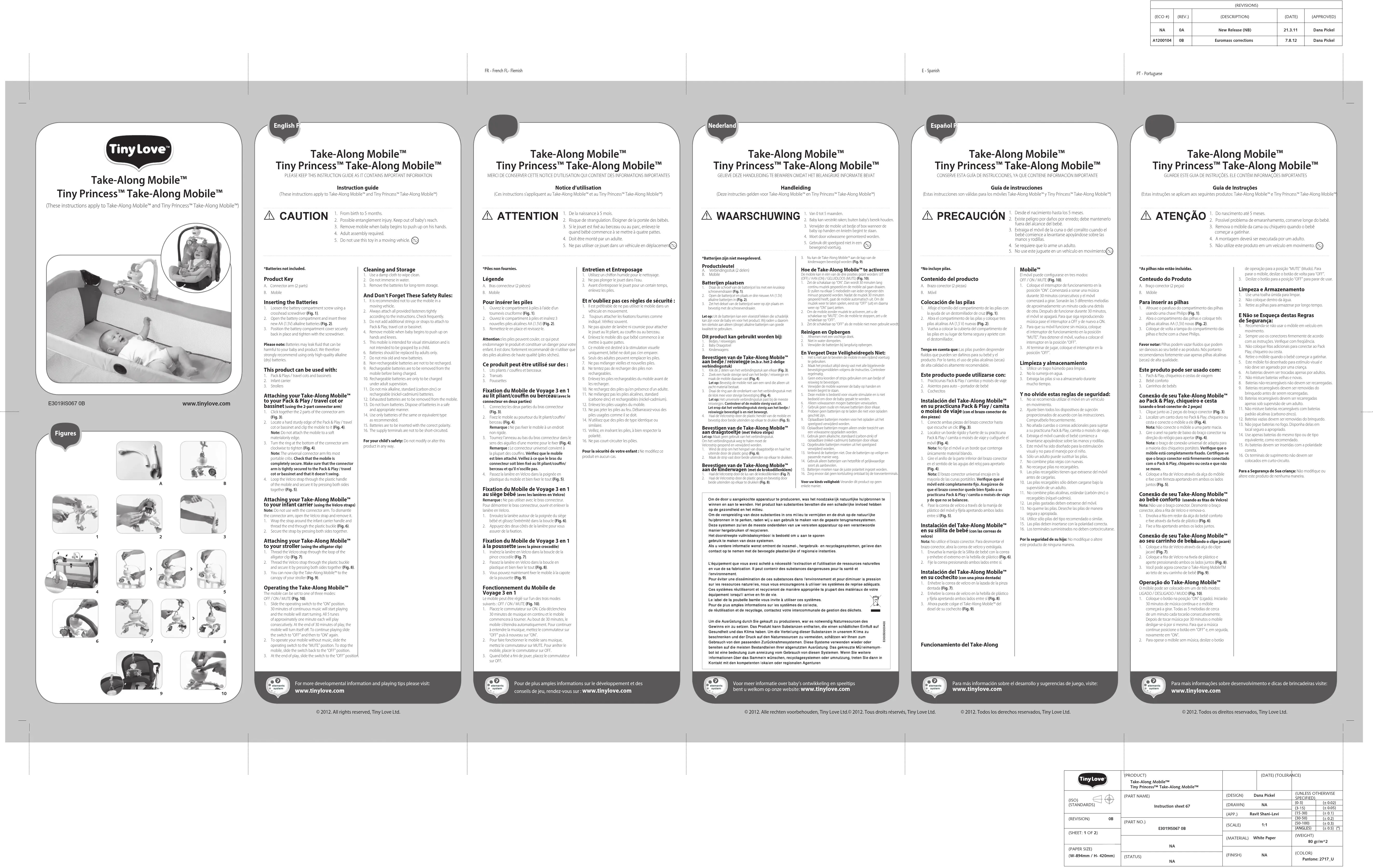 Fixation du Mobile de Voyage 3 en 1 au lit pliant/coun ou berceau (avec le connecteur en deux parties)1. Connectez les deux parties du bras connecteur (Fig. 3).2. Fixez le mobile au pourtour du lit pliant/coun/berceau (Fig. 4). Remarque : Ne pas xer le mobile à un endroit non rigide.3. Tournez l’anneau au bas du bras connecteur dans le sens des aiguilles d’une montre pour le xer (Fig. 4). Remarque : Le connecteur universel convient à la plupart des couns. Vériez que le mobile est bien attaché. Veillez à ce que le bras du connecteur soit bien xé au lit pliant/coun/berceau et qu’il n’oscille pas.4. Passez la lanière en Velcro dans la poignée en plastique du mobile et bien xer le tout (Fig. 5). Fixation du Mobile de Voyage 3 en 1 au siège bébé (avec les lanières en Velcro)Remarque : Ne pas utiliser avec le bras connecteur.Pour démontrer le bras connecteur, ouvrir et enlever lalanière en Velcro.1. Enroulez la lanière autour de la poignée du siège bébé et glissez l’extrémité dans la boucle (Fig. 6).2. Appuyez des deux côtés de la lanière pour vous assurer de la xation. Fixation du Mobile de Voyage 3 en 1 à la poussette (avec la pince crocodile)1. Insérez la lanière en Velcro dans la boucle de la pince crocodile (Fig. 7).2. Passez la lanière en Velcro dans la boucle en plastique et bien xer le tout (Fig. 8).3. Vous pouvez maintenant xer le mobile à la capote de la poussette (Fig. 9). Fonctionnement du Mobile de Voyage 3 en 1 Le mobile peut être réglé sur l’un des trois modessuivants : OFF / ON / MUTE (Fig. 10).1. Placez le commutateur sur ON. Cela déclenchera 30 minutes de musique en continu et le mobile commencera à tourner. Au bout de 30 minutes, le mobile s’éteindra automatiquement. Pour continuer à entendre la musique, mettez le commutateur sur “OFF” puis à nouveau sur “ON”. 2. Pour faire fonctionner le mobile sans musique, mettez le commutateur sur MUTE. Pour arrêter le mobile, placer le commutateur sur OFF.3. Quand bébé a ni de jouer, placez le commutateur sur OFF. Entretien et Entreposage 1. Utilisez un chion humide pour le nettoyage.2. Ne pas plonger le jouet dans l’eau.3. Avant d’entreposer le jouet pour un certain temps, enlevez les piles. Et n’oubliez pas ces règles de sécurité : 1. Il est préférable de ne pas utiliser le mobile dans un véhicule en mouvement.2. Toujours attacher les xations fournies comme indiqué. Vériez souvent.3. Ne pas ajouter de lanière ni courroie pour attacher le jouet au lit pliant, au coun ou au berceau.4. Enlevez le mobile dès que bébé commence à se mettre à quatre pattes.5. Ce mobile est destiné à la stimulation visuelle uniquement, bébé ne doit pas s’en emparer.6. Seuls des adultes peuvent remplacer les piles.7. Ne pas mélanger vieilles et nouvelles piles.8. Ne tentez pas de recharger des piles non rechargeables.9. Enlevez les piles rechargeables du mobile avant de les recharger.10. Ne rechargez des piles qu’en présence d’un adulte.11. Ne mélangez pas les piles alcalines, standard (carbone-zinc) et rechargeables (nickel-cadmium).12. Enlevez les piles usagées du mobile.13. Ne pas jeter les piles au feu. Débarrassez-vous des piles usagées comme il se doit.14. N’utilisez que des piles de type identique ou similaire.15. Veillez, en insérant les piles, à bien respecter la polarité.16. Ne pas court-circuiter les pôles.Pour la sécurité de votre enfant : Ne modiez ce produit en aucun cas.1. From birth to 5 months.2. Possible entanglement injury. Keep out of baby’s reach.3. Remove mobile when baby begins to push up on his hands. 4. Adult assembly required.5. Do not use this toy in a moving vehicle.1. Do nascimento até 5 meses.2. Possível problema de emaranhamento, conserve longe do bebê.3. Remova o móbile da cama ou chiqueiro quando o bebê começar a gatinhar. 4. A montagem deverá ser executada por um adulto.5. Não utilize este produto em um veículo em movimento.*As pilhas não estão incluídas. Conteudo do Produto A. Braço conector (2 peças)B. Móbile Para inserir as pilhas 1. Afrouxe o parafuso do compartimento das pilhas usando uma chave Philips (Fig. 1).2. Abra o compartimento das pilhas e coloque três pilhas alcalinas AA (1,5V) novas (Fig. 2).3. Coloque de volta a tampa do compartimento das pilhas e feche com a chave Philips.Favor notar: Pilhas podem vazar uidos que podem ser danosos ao seu bebê e ao produto. Nós portanto recomendamos fortemente usar apenas pilhas alcalinas (secas) de alta qualidade. Este produto pode ser usado com:
