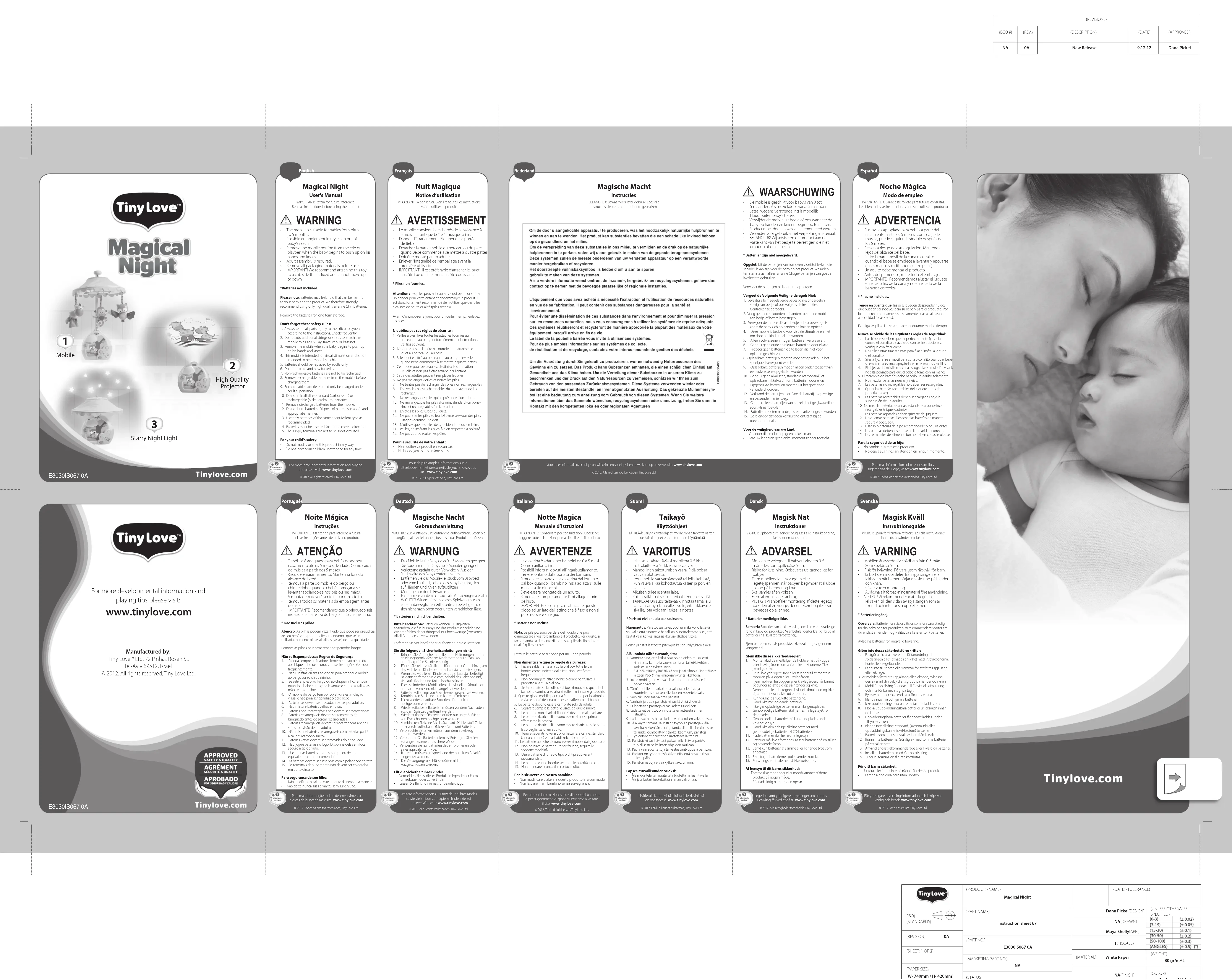 - Le mobile convient à des bébés de la naissance à 5 mois. En tant que boîte à musique 5+m.• Danger d’étranglement. Éloigner de la portée de Bébé.• Détachez la partie mobile du berceau ou du parc quand Bébé commence à se mettre à quatre pattes.• Doit être monté par un adulte.• Enlever l’intégralité de l’emballage avant la première utilisatio.• IMPORTANT ! Il est préférable d’attacher le jouet au côté fixe du lit et non au côté coulissant.* Piles non fournies.Attention : Les piles peuvent couler, ce qui peut constituer un danger pour votre enfant et endommager le produit. Il est donc fortement recommandé de n’utiliser que des piles alcalines de haute qualité (piles sèches).Avant d’entreposer le jouet pour un certain temps, enlevez les piles.N’oubliez pas ces règles de sécurité :1. Veillez à bien fixer toutes les attaches fournies au berceau ou au parc, conformément aux instructions. Vérifiez souvent.2. N’ajoutez pas de lanière ni courroie pour attacher le jouet au berceau ou au parc.3. Si le jouet est fixé au berceau ou au parc, enlevez-le quand Bébé commence à se mettre à quatre pattes.4. Ce mobile pour berceau est destiné à la stimulation visuelle et non pas à être attrapé par l’enfant.5. Seuls des adultes peuvent remplacer les piles.6. Ne pas mélanger vieilles et nouvelles piles.7. Ne tentez pas de recharger des piles non rechargeables.8. Enlevez les piles rechargeables du jouet avant de les recharger.9. Ne rechargez des piles qu’en présence d’un adulte.10. Ne mélangez pas les piles alcalines, standard (carbone-zinc) et rechargeables (nickel-cadmium).11. Enlevez les piles usées du jouet.12. Ne pas jeter les piles au feu. Débarrassez-vous des piles usagées comme il se doit.13. N’utilisez que des piles de type identique ou similaire.14. Veillez, en insérant les piles, à bien respecter la polarité.15. Ne pas court-circuiter les pôles.Pour la sécurité de votre enfant : • Nemodiezceproduitenaucuncas.• Nelaissezjamaisdesenfantsseuls. Magische Macht InstructiesBELANGRIJK: Bewaar voor later gebruik. Lees alle instructies alvorens het product te gebruikenNederlandEspañol Noche Mágica Modo de empleoIMPORTANTE: Guarde este folleto para futuras consultas. Lea bien todas las instrucciones antes de utilizar el producto ADVERTENCIA