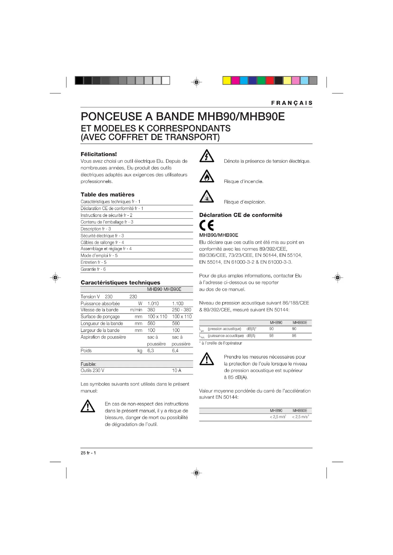(puissance acoustique) dB(A) 98 98* à l’oreille de l’opérateur Prendre les mesures nécessaires pour la protection de l’ouïe lorsque le niveau de pression acoustique est supérieur à 85 dB(A). Valeur moyenne pondérée du carré de l’accélération suivant EN 50144: MHB90 MHB90E< 2,5 m/s < 2,5 m/s 2FRANÇAIS fr - 2 26 Directeur de développement produits Horst Großmann Elu International, Richard-Klinger-Straße 40, D-65510, Idstein, Allemagne Instructions de sécurité Afin de réduire le risque de décharge électrique, de blessure et d’incendie lors de l’utilisation d’outils électriques, observer les consignes de sécurité fondamentales en vigueur. Lire et observer les instructions avant d’utiliser l’outil. Conserver ces instructions de sécurité! Généralités 1 Tenir votre aire de travail propre et bien rangée Le désordre augmente les risques d’accident. 2 Tenir compte des conditions ambiantes Ne pas exposer les outils électriques à l’humidité. Veiller à ce que l’aire de travail soit bien éclairée. Ne pas utiliser d’outils électriques en présence de liquides ou de gaz inflammables. 3 Attention aux décharges électriques Eviter le contact corporel avec des éléments reliés à la terre, comme par exemple tuyaux, radiateurs, cuisinières électriques et réfrigérateurs. Sous des conditions de travail extrêmes (par exemple: humidité élevée, dépôt de poussières métalliques, etc.) la sécurité électrique peut être augmentée en insérant un transformateur d’isolation ou un disjoncteur différentiel (FI). 4 Tenir les enfants éloignés Ne pas permettre que d’autres personnes touchent l’outil ou le câble de rallonge. La supervision est obligatoire pour les moins de 16 ans. 5 Câble de rallonge pour l’extérieur A l’extérieur, n’utiliser que des câbles de rallonge homologués portant le marquage correspondant. 6 Ranger vos outils dans un endroit sûr Ranger les outils non utilisés dans un endroit sec, fermé à clé et hors de la portée des enfants. 7 Porter des vêtements de travail appropriés Ne pas porter de vêtements flottants ou de bijoux. Ils pourraient être happés par les pièces en mouvement. Lors de travaux à l’extérieur, il est recommandé de porter des gants en caoutchouc et des chaussures à semelle anti- dérapante. Le cas échéant, porter une garniture convenable retenant les cheveux longs. 8 Porter des lunettes de protection Utiliser aussi un masque si le travail exécuté produit de la poussière ou des copeaux volants. 9 Attention au niveau de pression acoustique Prendre les mesures nécessaires pour la protection de l’ouïe lorsque le niveau de pression acoustique est supérieur à 85 dB(A). 10 Bien fixer la pièce à travailler Pour plus de sécurité, fixer la pièce à travailler avec un dispositif de serrage ou un étau. Ainsi, vous aurez les deux mains libres pour manier l’outil. 11 Adopter une position confortable Toujours tenir les deux pieds à terre et garder l’équilibre. 12 Eviter tout démarrage involontaire Ne pas porter l’outil en ayant un doigt placé sur l’interrupteur. Mettre l’interrupteur en position d’arrêt avant de mettre la fiche dans la prise. 13 Faire preuve de vigilance Observer votre travail. Faire preuve de bon sens. Ne pas employer l’outil en cas de fatigue. 14 Enlever la fiche de la prise Débrancher l’outil et attendre qu’il soit complètement immobilisé avant de le laisser, de procéder à l’entretien ou au changement d’accessoires. 15 Enlever les clés de réglage Avant de mettre l’outil en marche, retirer les clés et outils de réglage. 16 Utiliser l’outil adéquat Le domaine d’utilisation de l’outil est décrit dans le présent manuel. Ne pas utiliser d’outils ou d’accessoires de trop faible puissance pour exécuter des travaux lourds. Ne pas utiliser des outils à des fins et pour des travaux pour lesquels ils n’ont pas été conçus. Attention! L’utilisation d’accessoires autres que ceux recommandés dans le présent manuel pourrait entraîner un risque de blessure. Utiliser l’outil conformément à sa destination. 17 Préserver le câble d’alimentation Ne pas porter l’outil par le câble et ne pas tirer sur celui-ci pour débrancher la fiche de la prise.27 fr - 3 FRANÇAIS Préserver le câble de la chaleur, de l’huile et des arêtes vives. 18 Entretenir vos outils avec soin Maintenir vos outils affûtés et propres afin de travailler mieux et plus sûrement. Observer les instructions d’entretien et de changement d’accessoires. Vérifier régulièrement l’état du câble d’alimentation et, s’il est endommagé, le faire changer par votre Service Elu agréé. Vérifier périodiquement le câble de rallonge et le remplacer s’il est endommagé. Maintenir les poignées sèches et exemptes d’huile et de graisse. 19 Contrôler si votre outil est endommagé Avant d’utiliser l’outil, vérifier qu’il n’est pas endommagé. Pour cela, contrôler l’alignement des pièces en mouvement et leur grippage éventuel. Tous les composants doivent être montés correctement et remplir les conditions pour garantir le fonctionnement impeccable de l’outil. Faire réparer ou échanger tout dispositif de sécurité et toute pièce endommagée conformément aux instructions. Ne pas utiliser l’outil quand l’interrupteur est défectueux. Faire remplacer l’interrupteur par un Service Elu agréé. 20 Faire réparer votre outil par un Service Elu agréé Cet outil est conforme aux consignes de sécurité en vigueur. La réparation des outils électriques est strictement réservée aux personnes qualifiées. Ponçage de peinture Respecter les règles en vigueur pour le ponçage de peintures en prêtant une attention particulière à ce qui suit: 1 Si possible, utiliser un aspirateur de poussière. 2 Lors du ponçage de peintures présumées à base de plomb:
