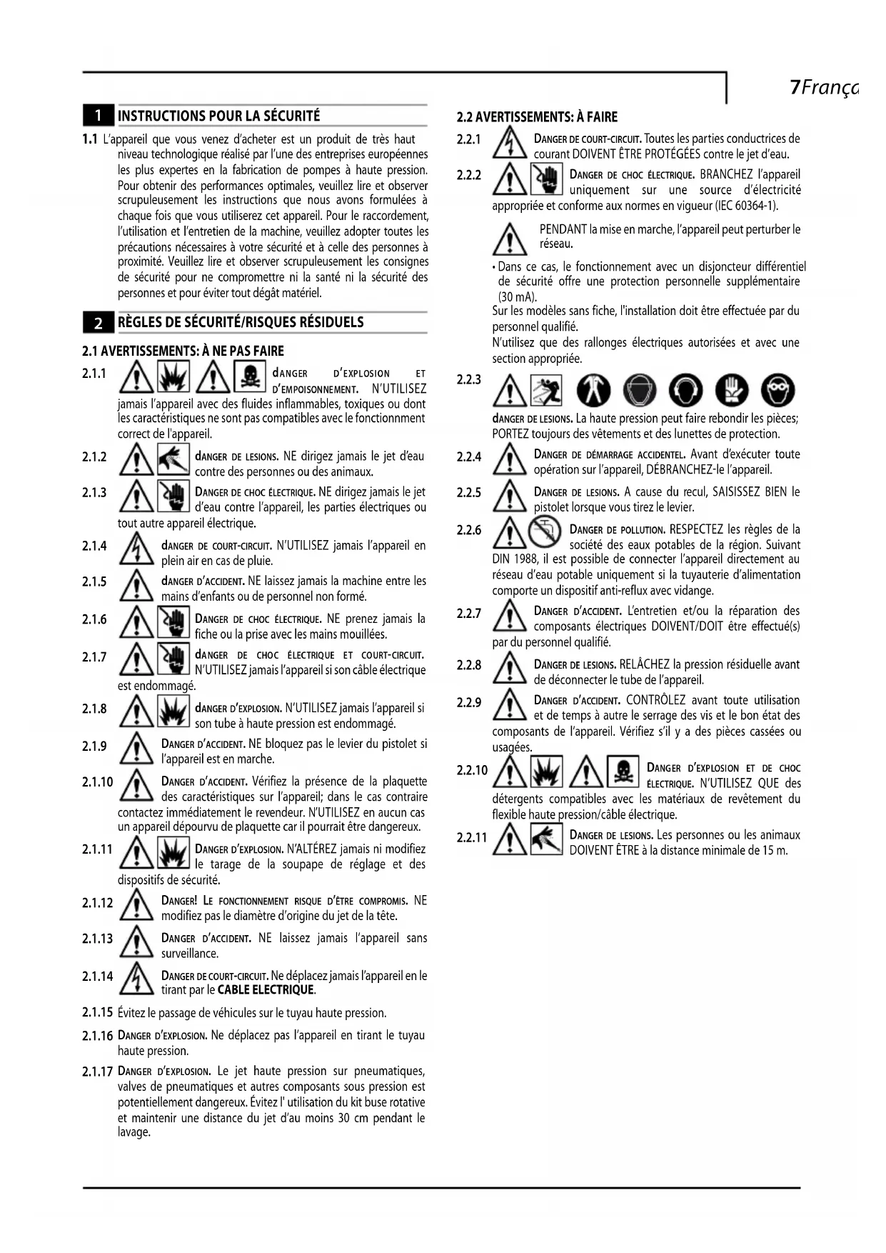 niveau technologique réalisé par l’une des entreprises européennes les plus expertes en la fabrication de pompes à haute pression. Pour obtenir des performances optimales, veuillez lire et observer scrupuleusement les instructions que nous avons formulées à chaque fois que vous utiliserez cet appareil. Pour le raccordement, l’utilisation et l’entretien de la machine, veuillez adopter toutes les précautions nécessaires à votre sécurité et à celle des personnes à proximité. Veuillez lire et observer scrupuleusement les consignes de sécurité pour ne compromettre ni la santé ni la sécurité des personnes et pour éviter tout dégât matériel.