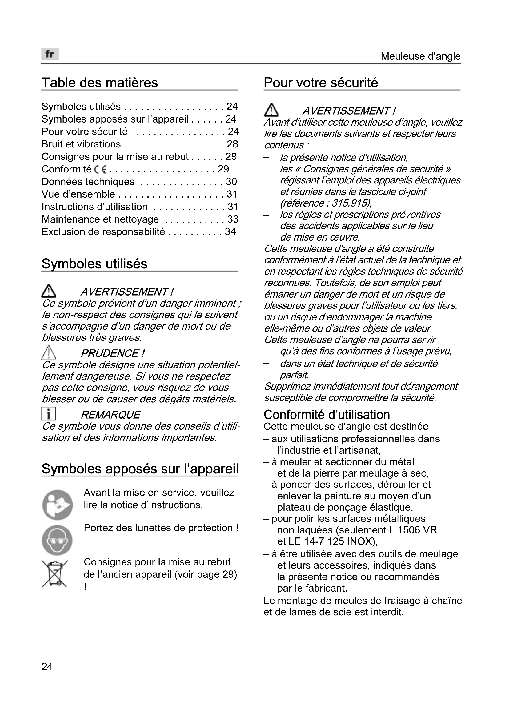 dans un état technique et de sécurité parfait. Supprimez immédiatement tout dérangement susceptible de compromettre la sécurité. Conformité d’utilisation Cette meuleuse d’angle est destinée – aux utilisations professionnelles dans l’industrie et l’artisanat, – à meuler et sectionner du métal et de la pierre par meulage à sec, – à poncer des surfaces, dérouiller et enlever la peinture au moyen d’un plateau de ponçage élastique. – pour polir les surfaces métalliques non laquées (seulement L 1506 VR et LE 14-7 125 INOX), – à être utilisée avec des outils de meulage et leurs accessoires, indiqués dans la présente notice ou recommandés par le fabricant. Le montage de meules de fraisage à chaîne et de lames de scie est interdit.Meuleuse d’angle