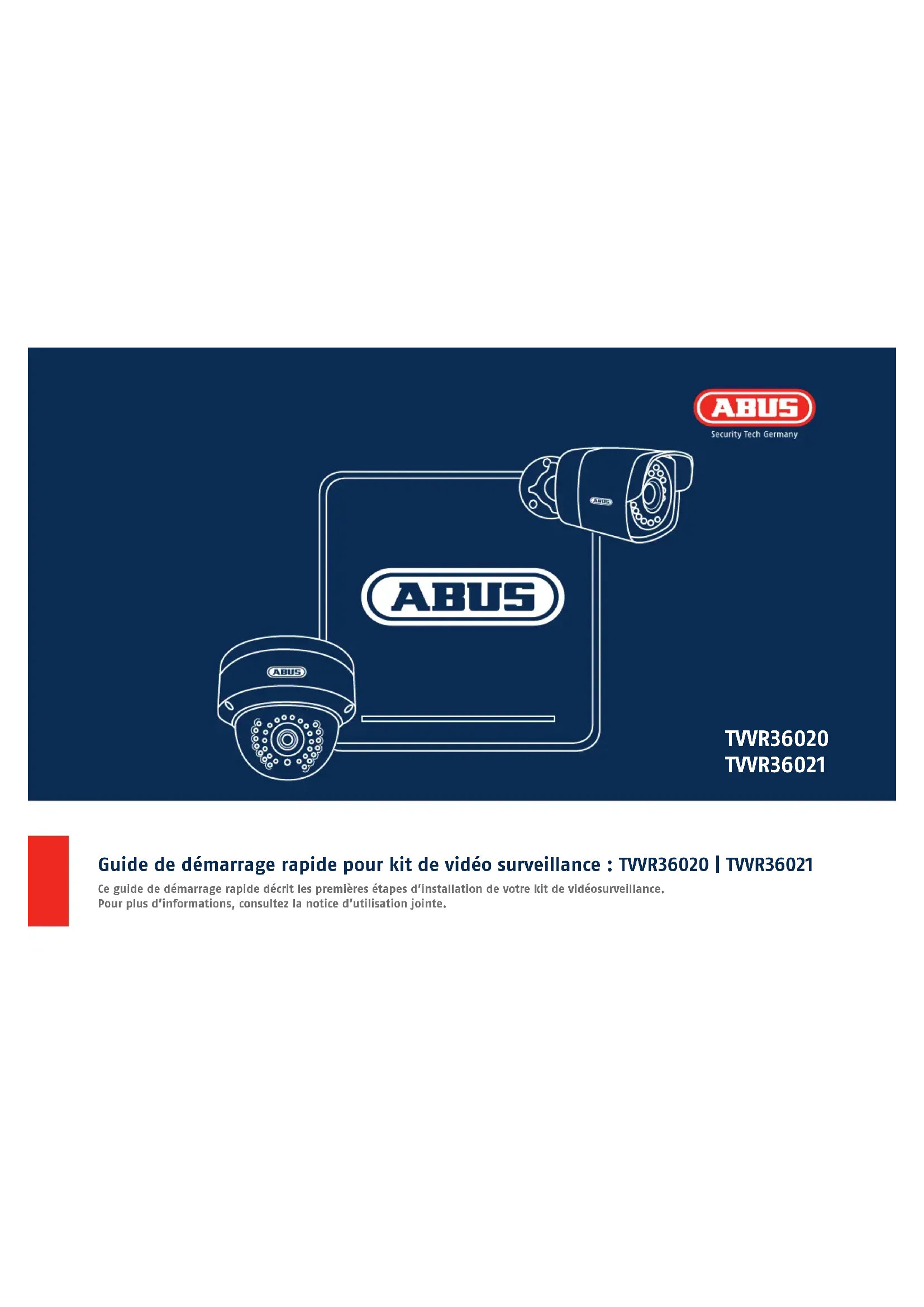 160218-Quick-Guide-TVVR36020-RRo-BUCH.indb 39 03.03.16 13:36160218-Quick-Guide-TVVR36020-RRo-BUCH.indb 40 03.03.16 13:36Guide de démarrage rapide pour kit de vidéo surveillance : TVVR36020 | TVVR36021 Ce guide de démarrage rapide décrit les premières étapes d’installation de votre kit de vidéosurveillance. Pour plus d’informations, consultez la notice d’utilisation jointe. TVVR36020 TVVR36021 160218-Quick-Guide-TVVR36020-RRo-BUCH.indb 41 03.03.16 13:3642 Français Chère cliente, cher client, Nous vous remercions de l‘achat de ce produit. Ce produit réalise les exigences des directives européennes et nationales en vigueur. La conformité est prouvée, les déclarations et documents correspondants sont consultables auprès du fabricant (ABUS Security-Center GmbH & Co. KG, Linker Kreuthweg 5, 86444 Ang, Germany). An de maintenir cet état et d’assurer un usage sans danger, vous devez absolument respecter ce mode d’emploi en tant qu’utilisateur! Lisez avant la mise en service du produit le mode d’emploi complet, respectez toutes les consignes de commande et de sécurité! Tous les noms de rme et de produit sont des marques du fabricant respectif. Tous droits réservés. Pour plus de renseignements, adressez-vous à votre partenaire revendeur spécialisé. 160218-Quick-Guide-TVVR36020-RRo-BUCH.indb 42 03.03.16 13:3643 Français Avertissements Utilisez la caméra réseau seulement si les conditions d’utilisation conseil- lées par le fabricant sont réunies. Veillez à ce que la ventilation soit toujours susante. Veillez à ce que l’alimentation électrique ne soit pas interrompue en utilisant une source de tension permanente. La caméra ne doit pas être exposée à des champs magnétiques puissants. Ne renversez pas de liquides sur l’enregistreur. Veillez à ce que la caméra réseau soit correctement montée. Utilisez la caméra réseau uniquement avec une source d’alimentation appropriée. N’insérez aucun objet dans la caméra (p. ex. aiguilles). 160218-Quick-Guide-TVVR36020-RRo-BUCH.indb 43 03.03.16 13:3644 Français