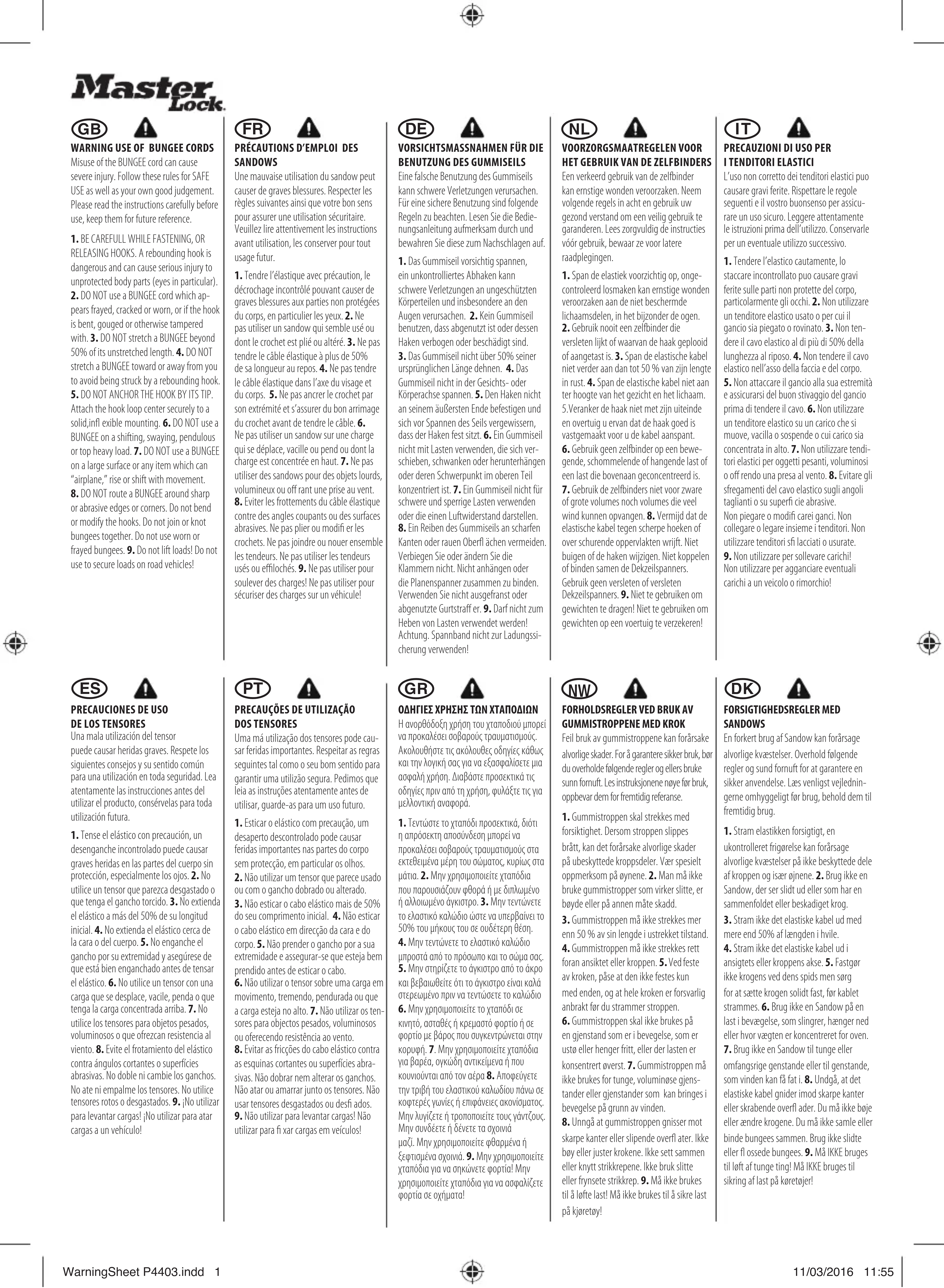 - Tendre l'élastique avec précaution, le décrochage incontrôlé pouvant causer de graves blessures aux parties non protégées du corps, en particulier les yeux. 2. Ne pas utiliser un sandow qui semble usé ou dont le crochet est plié ou altéré. 3. Ne pas tendre le câble élastique à plus de 50% de sa longueur au repos. 4. Ne pas tendre le câble élastique dans l'axe du visage et du corps. 5. Ne pas ancrer le crochet par son extrémité et s'assurer du bon arrimage du crochet avant de tendre le câble. 6. Ne pas utiliser un sandow sur une charge qui se déplace, vacille ou penche ou dont la charge est concentrée en haut. 7. Ne pas utiliser des sandows pour des objets lourds, volumineux ou offrant une prise au vent.