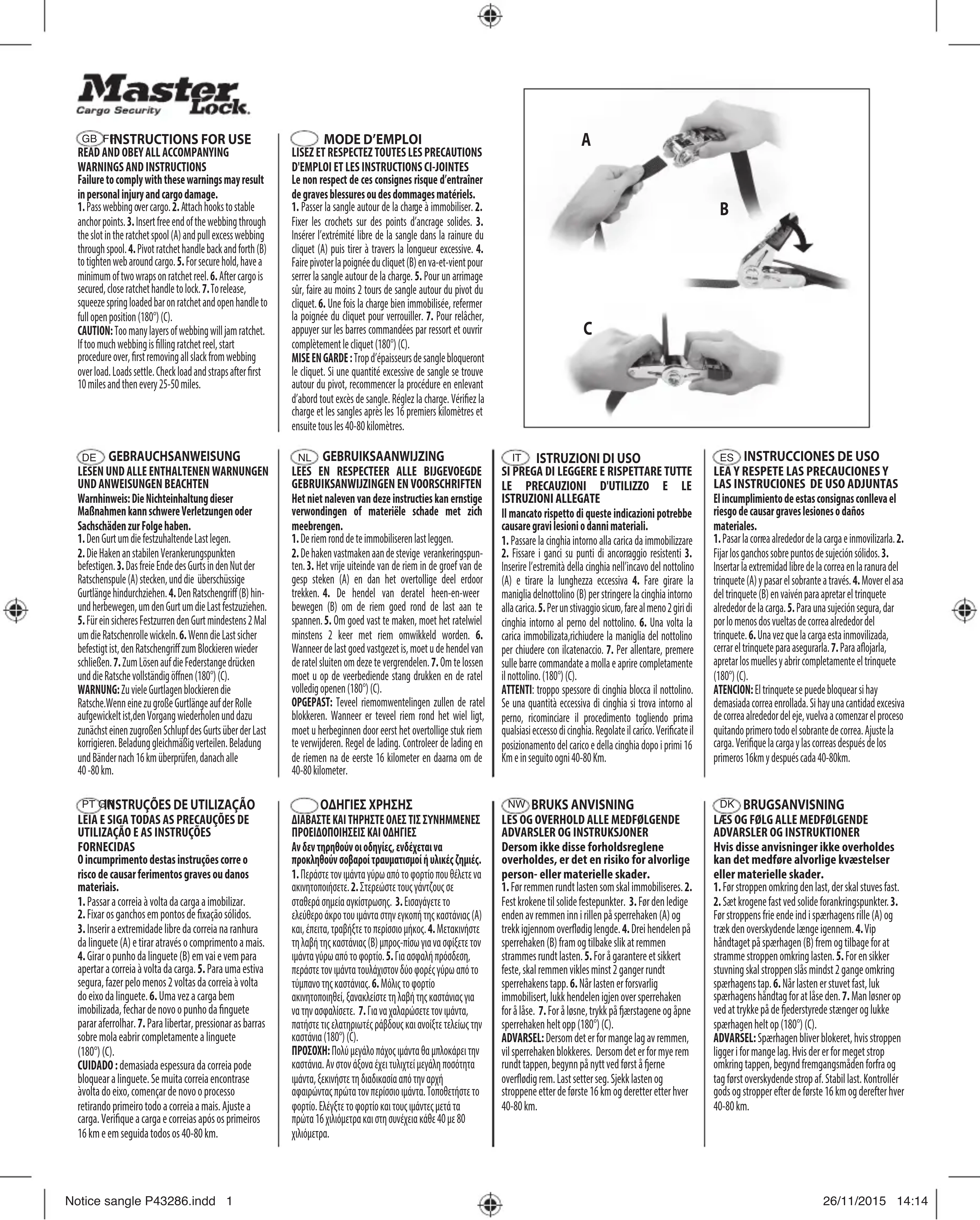 - Passer la sangle autour de la charge à immobiliser. 2. Fixer les crochets sur des points d'ancrage solides. 3. Insérer l'extrémité libre de la sangle dans la rainure du cliquet (A) puis tirer à travers la longueur excessive. 4. Faire pivoter la poignée du cliquet (B) en va-et-vient pour serrer la sangle autour de la charge. 5. Pour un arrimage sûr, faire au moins 2 tours de sangle autour du pivot du cliquet. 6. Une fois la charge bien immobilisée, refermer la poignée du cliquet pour verrouiller. 7. Pour relâcher, appuyer sur les barres commandées par ressort et ouvrir complètement le cliquet (180°) (C).