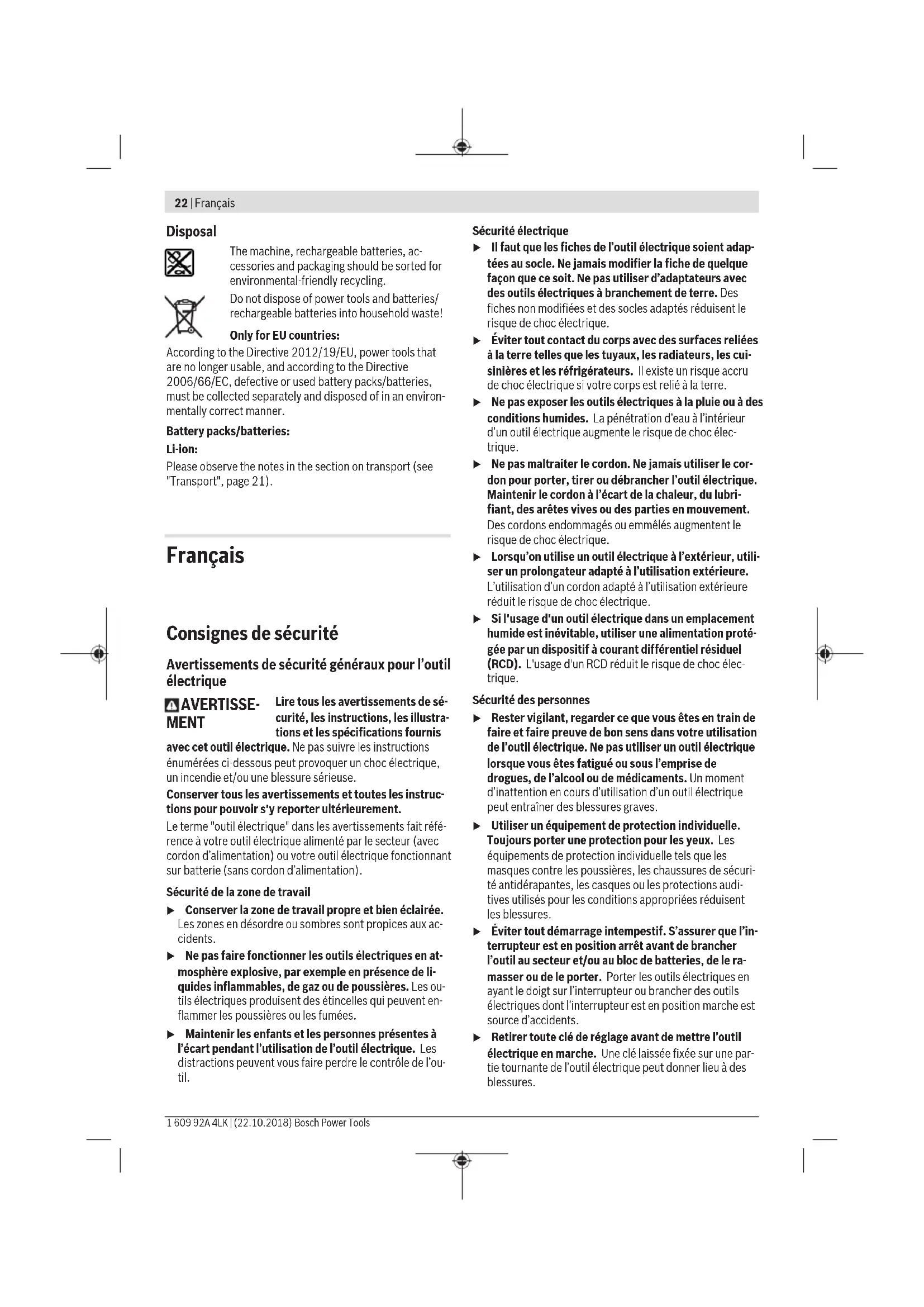 Les accessoires décrits ou illustrés ne sont pas tous compris dans la fourniture. Vous trouverez les accessoires complets dans notre gamme d’accessoires. Caractéristiques techniques Scie circulaire GKS 12V-26 Référence 3 601 FA1 0.. Tension nominale V 12 Régime à vide tr/min 1 400 Profondeur de coupe maxi – pour un angle d’inclinai- son de 0° mm 26,5 – pour un angle d’inclinai- son de 45° mm 17,0 Blocage de broche ● Dimensions de la plaque de base mm 167 x 88 Diamètre maxi de la de lame de scie mm 85 Diamètre mini de la de lame de scie mm 85 Épaisseur de lame maxi mm 0,7 Épaisseur/avoyage maxi des dents mm 1,1 Épaisseur/avoyage mini des dents mm 1,0 Alésage mm 15 Poids selon EPTA-Procedure 01:2014 kg 1,3 – 1,6