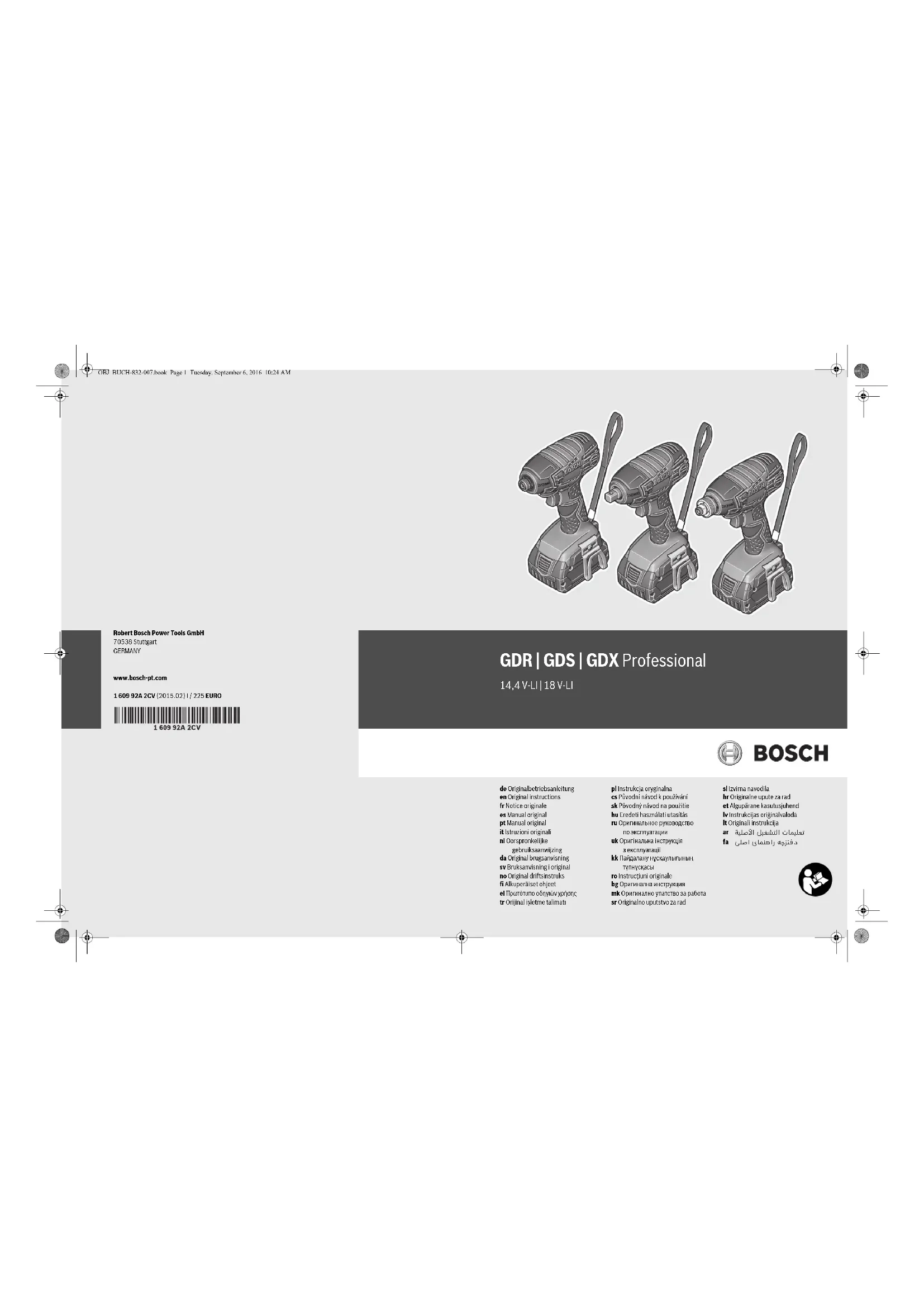 - selon l’accumulateur utilisé ** Performances réduites à des températures <à 0 °C OBJ_BUCH-832-007.book Page 23 Thursday, September 8, 2016 9:07 AM24 | Français 1 609 92A 2CV | (8.9.16) Bosch Power Tools Pour une estimation précise de la charge vibratoire, il est re- commandé de prendre aussi en considération les périodes pendant lesquelles l’appareil est éteint ou en fonctionnement, mais pas vraiment utilisé. Ceci peut réduire considérable- ment la charge vibratoire pendant toute la durée de travail. Déterminez des mesures de protection supplémentaires pour protéger l’utilisateur des effets des vibrations, telles que par exemple : Entretien de l’outil électrique et des outils de tra- vail, maintenir les mains chaudes, organisation des opéra- tions de travail. Déclaration de conformité Nous déclarons sous notre propre responsabilité que le pro- duit décrit sous « Caractéristiques techniques » est en confor- mité avec toutes les dispositions des directives 2009/125/CE (règlement 1194/2012), 2011/65/UE, 2014/30/CE, 2006/42/CE et leurs modifications ainsi qu’avec les normes suivantes : EN 60745-1, EN 60745-2-2, EN 50581. Dossier technique (2006/42/CE) auprès de : Robert Bosch Power Tools GmbH, PT/ECS, 70538 Stuttgart, GERMANY Robert Bosch Power Tools GmbH 70538 Stuttgart, GERMANY Stuttgart, 01.01.2017 Montage Chargement de l’accu N’utilisez que les chargeurs indiqués sur la page des ac- cessoires. Seuls ces chargeurs sont adaptés à l’accu à ions lithium utilisé dans votre outil électroportatif. Note : L’accu est fourni en état de charge faible. Afin de garan- tir la puissance complète de l’accu, chargez complètement l’accu dans le chargeur avant la première mise en service. La batterie Lithium-ion peut être rechargée à tout moment, sans que sa durée de vie n’en soit réduite. Le fait d’inter- rompre le processus de charge n’endommage pas la batterie. Grâce à la Protection Electronique des Cellules « Electronic Cell Protection (ECP) », l’accu à ions lithium est protégé contre une décharge profonde. Lorsque l’accumulateur est déchargé, l’outil électroportatif s’arrête grâce à un dispositif d’arrêt de protection : L’outil de travail ne tourne plus. Après la mise hors fonctionnement automatique de l’outil électroportatif, n’appuyez plus sur l’interrupteur Marche/Arrêt. Ceci pourrait endommager l’accu. Respectez les indications concernant l’élimination. Retirer l’accu L’accu 5 dispose de 2 positions de verrouillage qui doivent éviter que l’accu puisse sortir si l’on appuie sur la touche de déverrouillage de l’accu 6 par mégarde. Tant que l’accu reste en place dans l’outil électroportatif, un ressort le maintient en position. Pour sortir l’accu 5, appuyez sur la touche de déverrouillage 6 et sortez l’accu par l’avant de l’outil électroportatif. Ne forcez pas. Changement d’outil (voir figure A–C) Avant d’effectuer des travaux sur l’appareil (p.ex. tra- vaux d’entretien, changement d’outils, etc.) et pour le transporter ou le stocker, retirez l’accu de l’appareil électroportatif. Il y a risque de blessure lorsqu’on appuie par mégarde sur l’interrupteur Marche/Arrêt. Nettoyer régulièrement les orifices d’aération de l’outil électrique. Le ventilateur du moteur attirera la poussière à l’intérieur du boîtier et une accumulation excessive de poudre de métal peut provoquer des dangers électriques. GDR14,4V-LI/GDR18V-LI/GDX14,4V-LI/GDX18V-LI: Montage des outils de travail Tirez la douille de verrouillage 2 vers l’avant, enfoncez l’outil de travail à fond dans le porte-outil 1 et relâchez la douille de verrouillage 2 afin de bloquer l’outil de travail. N’utilisez que des embouts de vissage avec loqueteau à billes 11 (DIN 3126-E6.3). D’autres embouts de vissage 13 peuvent être montés à l’aide d’un porte-embout universel avec loqueteau à billes 12. Sortir l’outil de travail Tirez la douille de verrouillage 2 vers l’avant et sortez l’outil de travail. GDS14,4V-LI/GDS18 V-LI/GDX14,4V-LI/GDX 18V-LI : Lors du montage de l’outil de travail, veillez à ce qu’il soit bien monté sur le porte-outil. Si l’outil de travail n’est pas fermement monté sur le porte-outil, il peut se détacher lors de l’opération de vissage. Poussez l’outil de travail