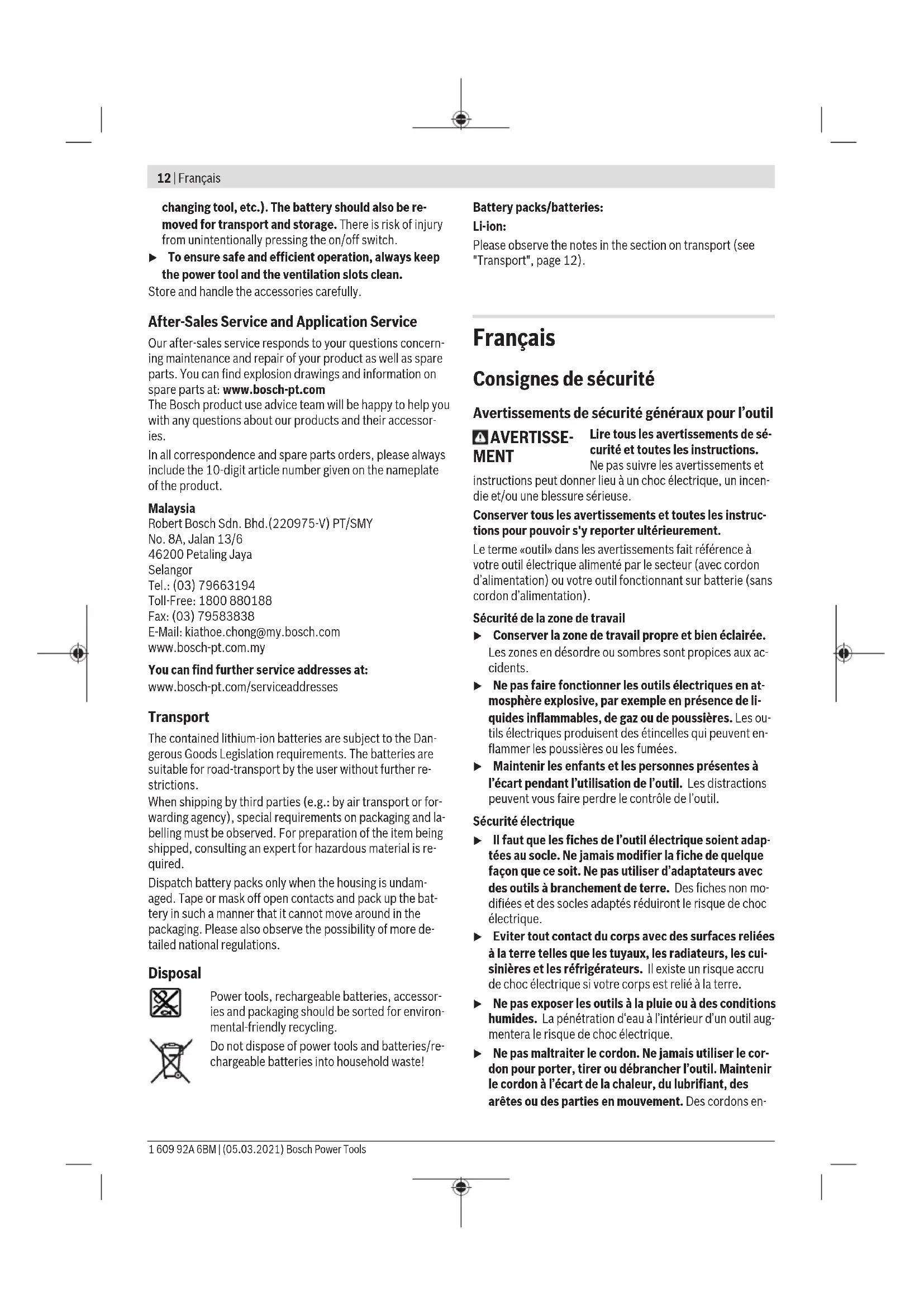 in order to avoid damaging the workpiece and application tool. Practical advice Detailed work can be carried out best if you hold the power tool as a pen between the thumb and index finger (seefigureF). For heavy work such as cutting or grinding, use the "golf grip method" (seefigureG). Move the cutting disc or grinding accessory with light pres- sure to achieve an optimum work result. Too much pressure will reduce the performance of the power tool and lead to faster wear of the application tool. u Ensure that grinding tools and cutting discs are pro- tected against impact when stored. Recommended Cutting Methods – Board materials (seefigureH) – Rods (seefigureI) – Pipes (seefigureJ) Blockage Protection The built-in blockage protection protects the motor and bat- tery in case of a blockage. If the application tool becomes jammed in the workpiece or if too much pressure is exerted on the workpiece, the motor will stop. – Determine the cause of the blockage and eliminate it. Recommendations for optimal handling of the battery Protect the battery against moisture and water. Only store the battery only within a temperature range of -20 to 50 °C. Do not leave the battery in your car in the summer, for example. Occasionally clean the ventilation slots on the battery using a soft brush that is clean and dry. A significantly reduced operating time after charging indic- ates that the battery has deteriorated and must be replaced. Follow the instructions on correct disposal. Maintenance and Service Maintenance and Cleaning u Remove the battery from the power tool before carry- ing out work on the power tool (e.g. maintenance, Bosch Power Tools 1 609 92A 6BM | (05.03.2021)12 | Français changing tool, etc.). The battery should also be re- moved for transport and storage. There is risk of injury from unintentionally pressing the on/off switch. u To ensure safe and efficient operation, always keep the power tool and the ventilation slots clean. Store and handle the accessories carefully. After-Sales Service and Application Service Our after-sales service responds to your questions concern- ing maintenance and repair of your product as well as spare parts. You can find explosion drawings and information on spare parts at: www.bosch-pt.com The Bosch product use advice team will be happy to help you with any questions about our products and their accessor- ies. In all correspondence and spare parts orders, please always include the 10‑digit article number given on the nameplate of the product. Malaysia Robert Bosch Sdn. Bhd.(220975-V) PT/SMY No. 8A, Jalan 13/6 46200 Petaling Jaya Selangor Tel.: (03) 79663194 Toll-Free: 1800 880188 Fax: (03) 79583838 E-Mail: kiathoe.chong@my.bosch.com www.bosch-pt.com.my You can find further service addresses at: www.bosch-pt.com/serviceaddresses Transport The contained lithium-ion batteries are subject to the Dan- gerous Goods Legislation requirements. The batteries are suitable for road-transport by the user without further re- strictions. When shipping by third parties (e.g.: by air transport or for- warding agency), special requirements on packaging and la- belling must be observed. For preparation of the item being shipped, consulting an expert for hazardous material is re- quired. Dispatch battery packs only when the housing is undam- aged. Tape or mask off open contacts and pack up the bat- tery in such a manner that it cannot move around in the packaging. Please also observe the possibility of more de- tailed national regulations. Disposal Power tools, rechargeable batteries, accessor- ies and packaging should be sorted for environ- mental-friendly recycling. Do not dispose of power tools and batteries/re- chargeable batteries into household waste! Battery packs/batteries: Li-ion: Please observe the notes in the section on transport (see "Transport", page12). Français Consignes de sécurité Avertissements de sécurité généraux pour l’outil AVERTISSE- MENT Lire tous les avertissements de sé- curité et toutes les instructions. Ne pas suivre les avertissements et instructions peut donner lieu à un choc électrique, un incen- die et/ou une blessure sérieuse. Conserver tous les avertissements et toutes les instruc- tions pour pouvoir s'y reporter ultérieurement. Le terme «outil» dans les avertissements fait référence à votre outil électrique alimenté par le secteur (avec cordon d’alimentation) ou votre outil fonctionnant sur batterie (sans cordon d’alimentation). Sécurité de la zone de travail u Conserver la zone de travail propre et bien éclairée. Les zones en désordre ou sombres sont propices aux ac- cidents. u Ne pas faire fonctionner les outils électriques en at- mosphère explosive, par exemple en présence de li- quides inflammables, de gaz ou de poussières. Les ou- tils électriques produisent des étincelles qui peuvent en- flammer les poussières ou les fumées. u Maintenir les enfants et les personnes présentes à l’écart pendant l’utilisation de l’outil. Les distractions peuvent vous faire perdre le contrôle de l’outil. Sécurité électrique u Il faut que les fiches de l’outil électrique soient adap- tées au socle. Ne jamais modifier la fiche de quelque façon que ce soit. Ne pas utiliser d’adaptateurs avec des outils à branchement de terre. Des fiches non mo- difiées et des socles adaptés réduiront le risque de choc électrique. u Eviter tout contact du corps avec des surfaces reliées à la terre telles que les tuyaux, les radiateurs, les cui- sinières et les réfrigérateurs. Il existe un risque accru de choc électrique si votre corps est relié à la terre. u Ne pas exposer les outils à la pluie ou à des conditions humides. La pénétration d‘eau à l’intérieur d’un outil aug- mentera le risque de choc électrique. u Ne pas maltraiter le cordon. Ne jamais utiliser le cor- don pour porter, tirer ou débrancher l’outil. Maintenir le cordon à l’écart de la chaleur, du lubrifian