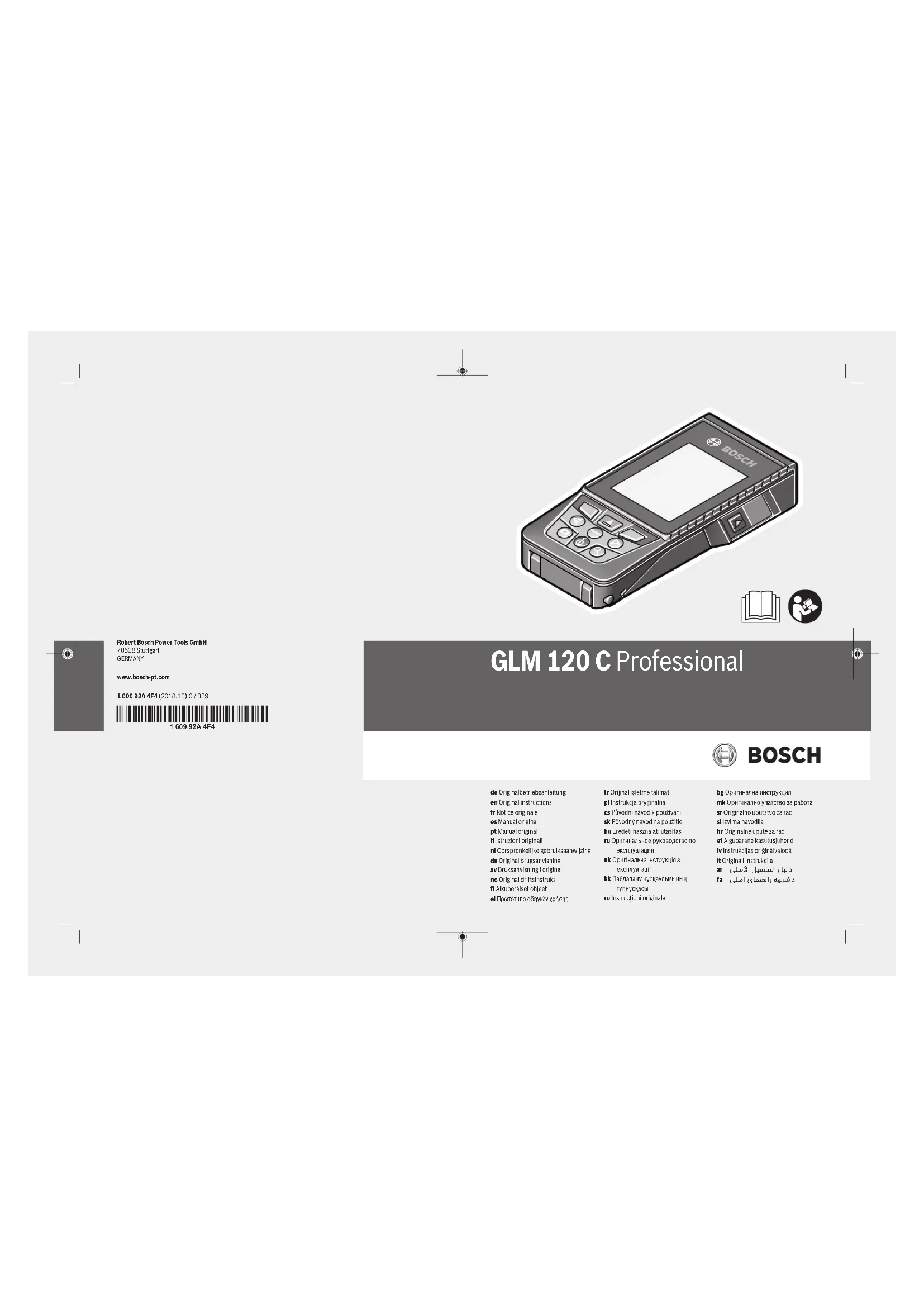Divisez le calcul en étapes in- termédiaires. Affichage de «CAL» et affichage de «ERROR» à l'écran Le calibrage de la mesure d'inclinaison n'a pas été ef- fectué dans l'ordre correct ou dans les positions cor- rectes. Répétez le calibrage confor- mément aux indications don- nées sur l'écran et dans la no- tice d'utilisation. Les surfaces utilisées pour le calibrage n'étaient pas exac- tement horizontales ou verti- cales. Répétez le calibrage sur une surface horizontale ou verti- cale et, le cas échéant, contrôlez les surfaces préala- blement au moyen d'un ni- veau à bulle. L'appareil de mesure a été bougé ou basculé au moment Répétez le calibrage et main- tenez l'appareil de mesure Cause Remède où vous avez appuyé sur une touche. immobile sur la surface pen- dant que vous appuyez sur une touche. Voyant de charge de la batterie (g), alerte de tempéra- ture et affichage de «ERROR» à l'écran La température de l'appareil de mesure se trouve en de- hors de la plage de tempéra- ture de charge admissible. Attendez jusqu'à ce que la plage de température de charge soit atteinte. Voyant de charge de la batterie (g) et affichage de «ER- ROR» à l'écran Tension de charge de la bat- terie incorrecte. Contrôlez si la connexion est correctement branchée et si le chargeur fonctionne cor- rectement. Si le symbole cli- gnote, la batterie est défec- tueuse et doit être remplacée par le Service Après-Vente Bosch. Résultat de mesure peu vraisemblable La surface cible ne réfléchit pas de manière unidirection- nelle (parex. eau, verre). Couvrir la surface cible. La sortie du faisceau laser (18), la cellule de réception (20) ou l'appareil photo (19) sont couverts. Dégager la sortie du faisceau laser (18), la cellule de ré- ception (20) ou l'appareil photo (19). Mauvais réglage du niveau de référence. Choisissez le niveau de réfé- rence approprié pour la me- sure. Obstacle sur le parcours du faisceau laser. Le point laser doit atteindre entièrement la surface cible. Bluetooth® non activable La batterie est trop déchar- gée. Rechargez la batterie de l'ap- pareil de mesure. Pas de connexion Bluetooth® Connexion Bluetooth® per- turbée Désactivez puis réactivez le Bluetooth® sur l'appareil de mesure et le terminal mobile. Vérifiez l'application sur votre terminal mobile. Vérifiez si le Bluetooth® est activé sur votre appareil de mesure et sur votre terminal mobile. Vérifiez si votre terminal mo- bile n'est pas surchargé. Réduisez la distance entre l'appareil de mesure et votre terminal mobile. Evitez tout obstacle (par ex. béton armé, porte métal- Français | 45 Bosch Power Tools 1 609 92A 4F4 | (22.10.2018)46 | Français 1 609 92A 4F4 | (22.10.2018) Bosch Power Tools Cause Remède lique) entre l'appareil de me- sure et votre terminal mo- bile. Gardez à distance les sources de perturbations électromagnétiques (par ex. émetteurs WiFi). Transmission de données impossible via le port USB Câble micro-USB Vérifiez si le câble micro-USB est correctement enfiché des deux côtés. Contrôlez l'état du câble mi- cro-USB. L'appareil de mesure surveille le bon fonction- nement à chaque mesure. S'il détecte un dé- faut, l'écran n'affiche plus que le symbole re- présenté ci-contre. En pareil cas ou si les pré- conisations mentionnées plus haut ne per- mettent pas d'éliminer le défaut, adressez-vous à votre Re- vendeur pour qu'il renvoie l'appareil de mesure au Service Après-vente Bosch. Entretien et Service après‑vente Nettoyage et entretien Maintenez l’appareil de mesure propre. N’immergez jamais l’appareil de mesure dans de l’eau ou dans d’autres liquides. Nettoyez l’appareil à l’aide d’un chiffon doux et humide. N’utilisez pas de détergents ou de solvants. Nettoyez soigneusement la lentille de réception (20), l'ori- fice de sortie du faisceau laser (18) et l'appareil photo (19): veillez à ne pas déposer de saletés sur la lentille de récep- tion, l'orifice de sortie du faisceau laser ou l'appareil photo. Ne nettoyez la lentille de réception, l'orifice de sortie du fais- ceau laser et la caméra qu'au moyen de produits spéciale- ment conçus pour les objectifs d'appareils photo. N'essayez pas d'enlever les saletés présentes sur la lentille de récep- tion, l'orifice de sortie du faisceau laser ou la caméra avec un objet pointu et ne les essuyez pas (risque de rayure). Si l'appareil de mesure a besoin d'être réparé, renvoyez-le dans sa housse de protection (24). Service après-vente et conseil utilisateurs Notre Service après-vente répond à vos questions concer- nant la réparation et l’entretien de votre produit et les pièces de rechange. Vous trouverez des vues éclatées et des infor- mations sur les pièces de rechange sur le site : www.bosch- pt.com L’équipe de conseil utilisateurs Bosch se tient à votre dispo- sition pour répondre à vos questions concernant nos pro- duits et leurs accessoires. Pour toute demande de renseignement ou commande de pièces de rechange, précisez impérativement la référence à 10chiffres figurant sur l’étiquette signalétique du produit. France Passez votre commande de pièces détachées directement en ligne sur notre site www.bosch-pt.fr. Vous êtes un utilisateur, contactez : Le Service Clientèle Bosch Outillage Electroportatif Tel. : 0811 360122 (coût d'une communication locale) Fax : (01) 49454767 E-Mail : contact.outillage-electroportatif@fr.bosch.com Vous êtes un revendeur, contactez : Robert Bosch (France) S.A.S. Service Après-Vente Electroportatif 126, rue de Stalingrad 93705 DRANCY Cédex Tel. : (01) 43119006 Fax : (01) 43119033 E-Mail : sav.outillage-electroportatif@fr.bosch.com Belgique, Luxembourg Tel. : +32 2 588 0589 Fax : +32 2 588 0595 E-Mail : outillage.gereedschap@be.bosch.com Suisse Passez votre commande de pièces détachées directement en ligne sur notre site www.bosch-pt.com/ch/fr. Tel. : (044) 8471512 Fax : 