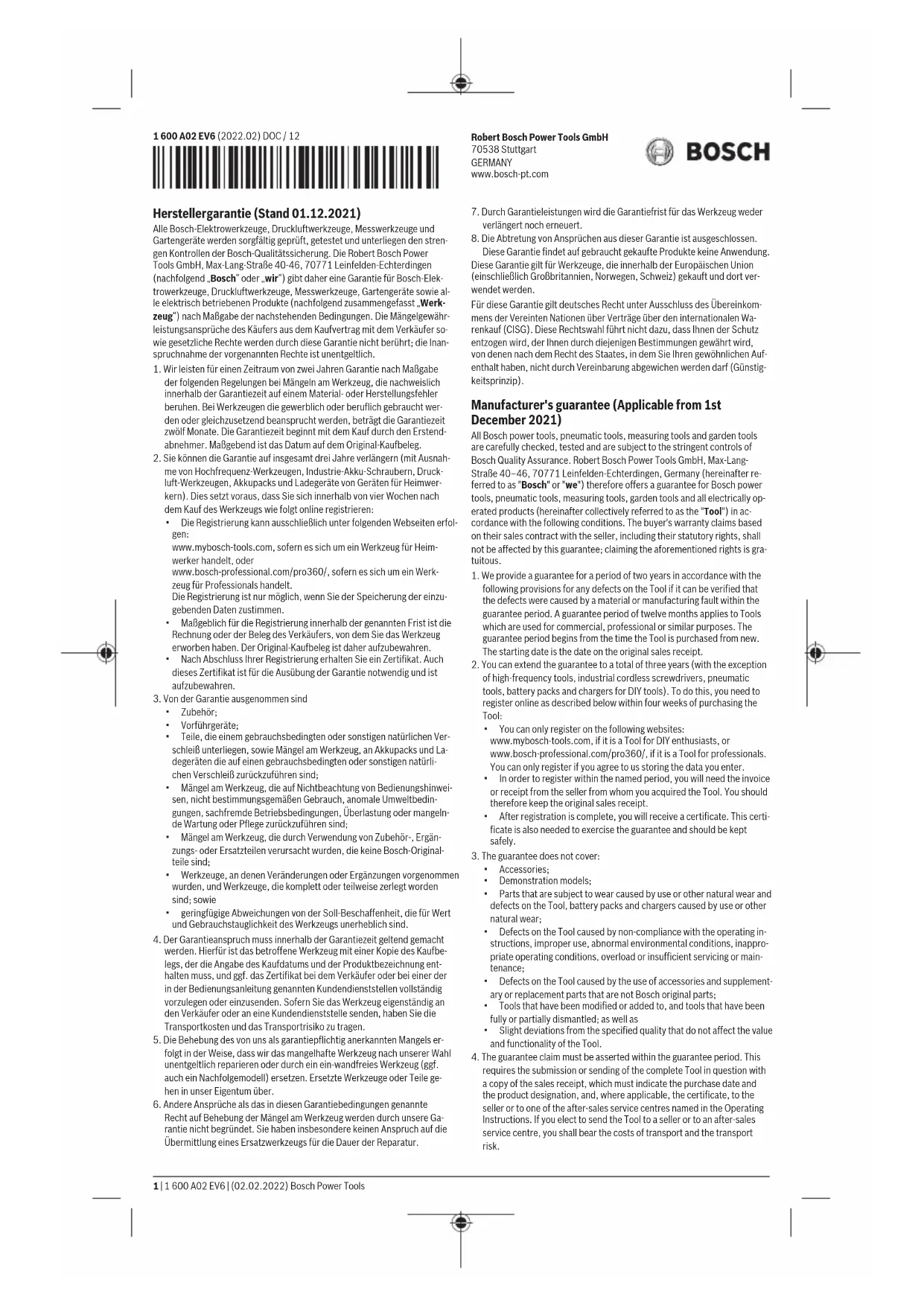 guarantee does not apply to any used products purchased. This guarantee applies to Tools that are purchased within the European Union (including the United Kingdom, Norway and Switzerland) and used within this area. German law shall apply to this guarantee to the exclusion of the United Na- tions Convention on Agreements concerning the International Sale of Goods (CISG). This choice of law shall not deprive you of the protection afforded to you by the provisions from which the law of the country in which you have your habitual residence may not derogate by agreement (favourability prin- ciple). Français Garantie fabricant (état: 01.12.2021) Tous les outils électroportatifs, outils pneumatiques, instruments de mesure et outils de jardin Bosch sont vérifiés et testés avec le plus grand soin; ils su- bissent de rigoureux contrôles par les services qualités Bosch. La societé Robert Bosch Power Tools GmbH, Max-Lang-Straße 40-46, 70771 Leinfel- den-Echterdingen (ci-après «Bosch» ou «nous») accorde pour cette rai- son une garantie pour les outils électroportatifs, outils pneumatiques, ins- truments de mesure, outils de jardin et tous les produits électriques (ci- après «Outils») sous réserve de respect des conditions énoncées ci-après. Les droits à garantie de l’acheteur pour vices cachés, stipulés dans le contrat de vente conclu avec le vendeur, ainsi que les droits légaux ne sont pas restreints par cette garantie; l’exercice des droits précités est gratuit.