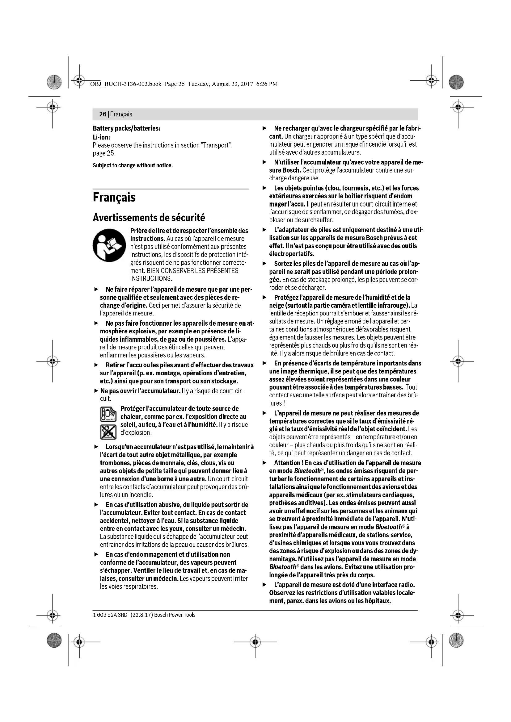 30 5.1 x 3.8 OBJ_BUCH-3136-002.book Page 24 Tuesday, August 22, 2017 6:26 PMEnglish | 25 Bosch Power Tools 1 609 92A 3RD | (22.8.17) Great Britain Robert Bosch Ltd. (B.S.C.) P.O. Box 98 Broadwater Park North Orbital Road Denham Uxbridge UB 9 5HJ At www.bosch-pt.co.uk you can order spare parts or arrange the collection of a product in need of servicing or repair. Tel. Service: (0344) 7360109 E-Mail: boschservicecentre@bosch.com Ireland Origo Ltd. Unit 23 Magna Drive Magna Business Park City West Dublin 24 Tel. Service: (01) 4666700 Fax: (01) 4666888 Australia, New Zealand and Pacific Islands Robert Bosch Australia Pty. Ltd. Power Tools Locked Bag 66 Clayton South VIC 3169 Customer Contact Center Inside Australia: Phone: (01300) 307044 Fax: (01300) 307045 Inside New Zealand: Phone: (0800) 543353 Fax: (0800) 428570 Outside AU and NZ: Phone: +61 3 95415555 www.bosch-pt.com.au www.bosch-pt.co.nz Supplier code ERAC000385 Republic of South Africa Customer service Hotline: (011) 6519600 Gauteng – BSC Service Centre 35 Roper Street, New Centre Johannesburg Tel.: (011) 4939375 Fax: (011) 4930126 E-Mail: bsctools@icon.co.za KZN – BSC Service Centre Unit E, Almar Centre 143 Crompton Street Pinetown Tel.: (031) 7012120 Fax: (031) 7012446 E-Mail: bsc.dur@za.bosch.com Western Cape – BSC Service Centre Democracy Way, Prosperity Park Milnerton Tel.: (021) 5512577 Fax: (021) 5513223 E-Mail: bsc@zsd.co.za Bosch Headquarters Midrand, Gauteng Tel.: (011) 6519600 Fax: (011) 6519880 E-Mail: rbsa-hq.pts@za.bosch.com Transport The usable lithium-ion battery packs are subject to the Dan- gerous Goods Legislation requirements. The user can trans- port the battery packs by road without further requirements. When being transported by third parties (e.g. via air transport or forwarding agency), special requirements on packaging and labelling must be observed. For preparation of the item being shipped, consulting an expert for hazardous material is required. Dispatch battery packs only when the housing is undamaged. Tape or mask off open contacts and pack up the battery pack in such a manner that it cannot move around in the packaging. Please also observe possibly more detailed national regula- tions. Disposal Measuring tools, battery packs/batteries, accesso- ries and packaging should be sorted for environmen- tal-friendly recycling. Do not dispose of measuring tools and batteries/re- chargeable batteries into household waste! Only for EC countries: According to the European Guideline 2012/19/EU, measur- ing tools that are no longer usable, and according to the Euro- pean Guideline 2006/66/EC, defective or used battery packs/batteries, must be collected separately and disposed of in an environmentally correct manner. Batteries no longer suitable for use can be directly returned at: Great Britain Robert Bosch Ltd. (B.S.C.) P.O. Box 98 Broadwater Park North Orbital Road Denham Uxbridge UB 9 5HJ At www.bosch-pt.co.uk you can order spare parts or arrange the collection of a product in need of servicing or repair. Tel. Service: (0344) 7360109 E-Mail: boschservicecentre@bosch.com OBJ_BUCH-3136-002.book Page 25 Tuesday, August 22, 2017 6:26 PM26 | Français 1 609 92A 3RD | (22.8.17) Bosch Power Tools Battery packs/batteries: Li-ion: Please observe the instructions in section “Transport”, page 25. Subject to change without notice. Français Avertissements de sécurité Prière de lire et de respecter l’ensemble des instructions. Au cas où l’appareil de mesure n’est pas utilisé conformément aux présentes instructions, les dispositifs de protection inté- grés risquent de ne pas fonctionner correcte- ment. BIEN CONSERVER LES PRÉSENTES INSTRUCTIONS. Ne faire réparer l’appareil de mesure que par une per- sonne qualifiée et seulement avec des pièces de re- change d’origine. Ceci permet d’assurer la sécurité de l’appareil de mesure. Ne pas faire fonctionner les appareils de mesure en at- mosphère explosive, par exemple en présence de li- quides inflammables, de gaz ou de poussières. L’appa- reil de mesure produit des étincelles qui peuvent enflammer les poussières ou les vapeurs. Retirer l’accu ou les piles avant d’effectuer des travaux sur l’appareil (p. ex. montage, opérations d’entretien, etc.) ainsi que pour son transport ou son stockage. Ne pas ouvrir l’accumulateur. ll y a risque de court-cir- cuit. Protéger l’accumulateur de toute source de chaleur, comme par ex. l’exposition directe au soleil, au feu, à l’eau et à l’humidité. Il y a risque d’explosion. Lorsqu’un accumulateur n’est pas utilisé, le maintenir à l’écart de tout autre objet métallique, par exemple trombones, pièces de monnaie, clés, clous, vis ou autres objets de petite taille qui peuvent donner lieu à une connexion d’une borne à une autre. Un court-circuit entre les contacts d’accumulateur peut provoquer des brû- lures ou un incendie. En cas d’utilisation abusive, du liquide peut sortir de l’accumulateur. Eviter tout contact. En cas de contact accidentel, nettoyer à l’eau. Si la substance liquide entre en contact avec les yeux, consulter un médecin. La substance liquide qui s’échappe de l’accumulateur peut entraîner des irritations de la peau ou causer des brûlures. En cas d’endommagement et d’utilisation non conforme de l’accumulateur, des vapeurs peuvent s’échapper. Ventiler le lieu de travail et, en cas de ma- laises, consulter un médecin. Les vapeurs peuvent irriter les voies respiratoires. Ne recharger qu’avec le chargeur spécifié par le fabri- cant. Un chargeur approprié à un type spécifique d’accu- mulateur peut engendrer un risque d’incendie lorsqu’il est utilisé avec d’autres accumulateurs. N’utiliser l’accumulateur qu’avec votre appareil de me- sure Bosch. Ceci protège l’accumulateur contre une sur- charge dangereuse. Les objets pointus (clou, tournevis, etc.) et les forces extérieures exercées sur le boîtier risq