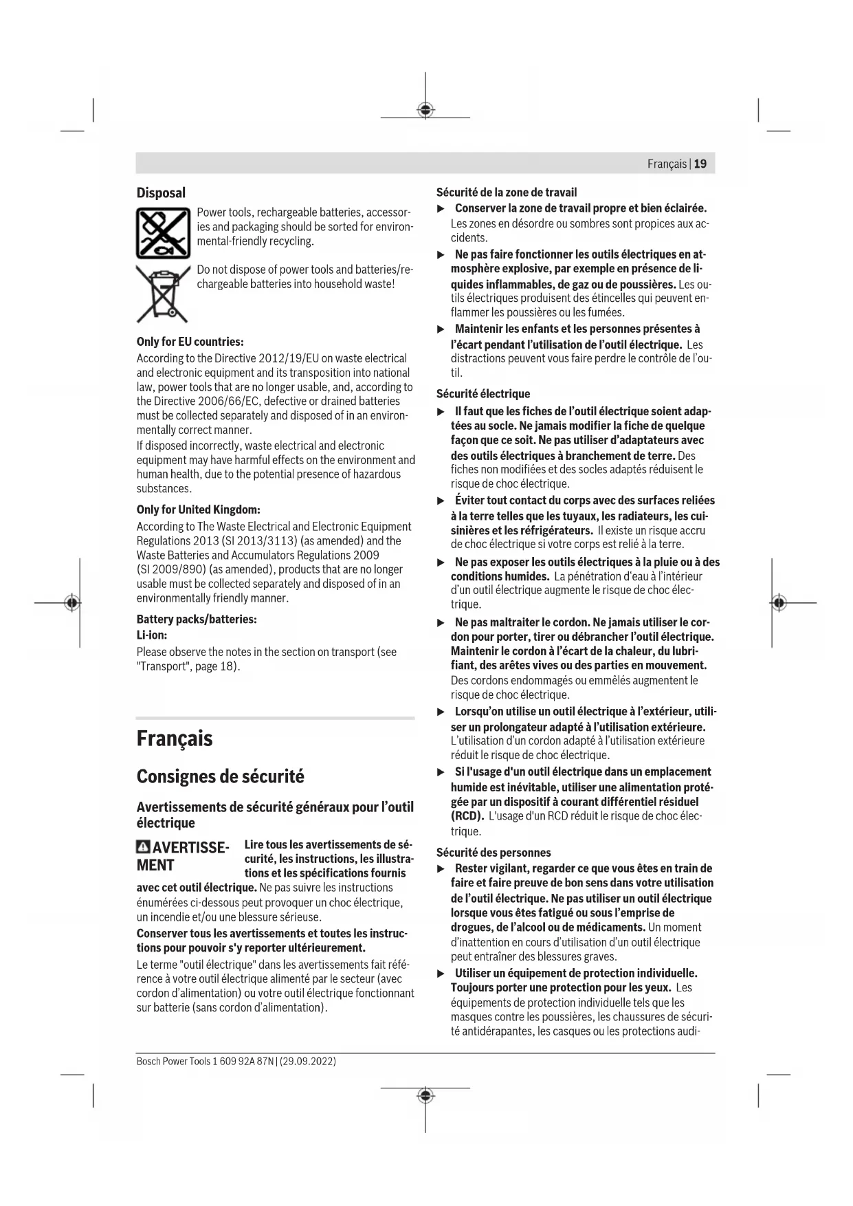 – 1.5 The vibration level and noise emission value given in these instructions have been measured in accordance with a standardised measuring procedure and may be used to com- pare power tools. They may also be used for a preliminary estimation of vibration and noise emissions. The stated vibration level and noise emission value repres- ent the main applications of the power tool. However, if the power tool is used for other applications, with different ap- plication tools or is poorly maintained, the vibration level and noise emission value may differ. This may significantly increase the vibration and noise emissions over the total working period. To estimate vibration and noise emissions accurately, the times when the tool is switched off or when it is running but not actually being used should also be taken into account. This may significantly reduce vibration and noise emissions over the total working period. Implement additional safety measures to protect the oper- ator from the effects of vibration, such as servicing the power tool and application tools, keeping their hands warm, and organising workflows correctly. Assembly u Remove the battery from the power tool before carry- ing out work on the power tool (e.g. maintenance, changing tool, etc.). The battery should also be re- moved for transport and storage. There is risk of injury from unintentionally pressing the on/off switch. Charging the Battery u Use only the chargers listed in the technical data. Only these chargers are matched to the lithium-ion battery of your power tool. Note: The battery is supplied partially charged. To ensure full battery capacity, fully charge the battery in the charger before using your power tool for the first time. The lithium-ion battery can be charged at any time without reducing its service life. Interrupting the charging process does not damage the battery. The lithium-ion battery is protected against deep discharge by the "Electronic Cell Protection (ECP)". When the battery is discharged, the power tool is switched off by means of a protective circuit: The application tool no longer rotates. u Do not continue to press the On/Off switch after the power tool has automatically switched off. The battery can be damaged. Removing the Battery The battery (7) is equipped with two locking levels to pre- vent the battery from falling out when pushing the battery re- lease button (8) unintentionally. As long as the battery is in- serted in the power tool, it is held in position by means of a spring. To remove the battery (7), press the release button (8) and pull the battery out of the power tool. Do not use force to do this. 1 609 92A 87N | (29.09.2022) Bosch Power ToolsEnglish | 17 Battery charge indicator The green LEDs on the battery charge indicator indicate the state of charge of the battery. For safety reasons, it is only possible to check the state of charge when the power tool is not in operation. Press the button for the battery charge indicator or to show the state of charge. This is also possible when the bat- tery is removed. If no LED lights up after pressing the button for the battery charge indicator, then the battery is defective and must be replaced. Battery model GBA 18V... LEDs Capacity 3× continuous green light 60−100% 2× continuous green light 30−60% 1× continuous green light 5−30% 1× flashing green light 0−5% Battery model ProCORE18V... LEDs Capacity 5× continuous green light 80−100% 4× continuous green light 60−80% 3× continuous green light 40−60% 2× continuous green light 20−40% 1× continuous green light 5−20% 1× flashing green light 0−5% Changing the tool (see figure A) u Remove the battery from the power tool before carry- ing out work on the power tool (e.g. maintenance, changing tool, etc.). The battery should also be re- moved for transport and storage. There is risk of injury from unintentionally pressing the on/off switch. Open the keyless chuck (2) by turning it in the direction of rotation ➊ until the tool can be inserted. Insert the tool. Firmly tighten the keyless chuck (2) by turning it by hand in the direction of rotation ➋. This will automatically lock the drill chuck. Dust/Chip Extraction Dust from materials such as lead-containing coatings, some wood types, minerals and metal can be harmful to one’s health. Touching or breathing-in the dust can cause allergic reactions and/or lead to respiratory infections of the user or bystanders. Certain dust, such as oak or beech dust, is considered carci- nogenic, especially in connection with wood-treatment ad- ditives (chromate, wood preservative). Materials containing asbestos may only be worked by specialists. – Provide for good ventilation of the working place. – It is recommended to wear a P2 filter-class respirator. Observe the relevant regulations in your country for the ma- terials to be worked. u Avoid dust accumulation at the workplace. Dust can easily ignite. Operation Starting Operation Inserting the battery Note: The use of batteries unsuitable for your power tool can lead to malfunctions or damage to the power tool. Set the rotational direction switch (10) to the middle posi- tion to avoid unintentionally switching it on. Insert the charged battery (7) into the handle until you feel it engage and it is flush with the handle. Setting the rotational direction (see figure B) The rotational direction switch (10) is used to change the ro- tational direction of the power tool. However, this is not pos- sible while the on/off switch (11) is being pressed. Right rotation: To drill and to drive in screws, press the ro- tational direction switch (10) through to the left stop. Left rotation: To loosen and unscrew screws and nuts, press the rotational direction switch (10) through to the left stop. Setting the operating mode Drilling GSR 18V-21 Set the torque presetting ring(3) to the "drilling" symbol. GSB 18V-21 Set the operating mode presetting ring(4) to the "drilling" symbo