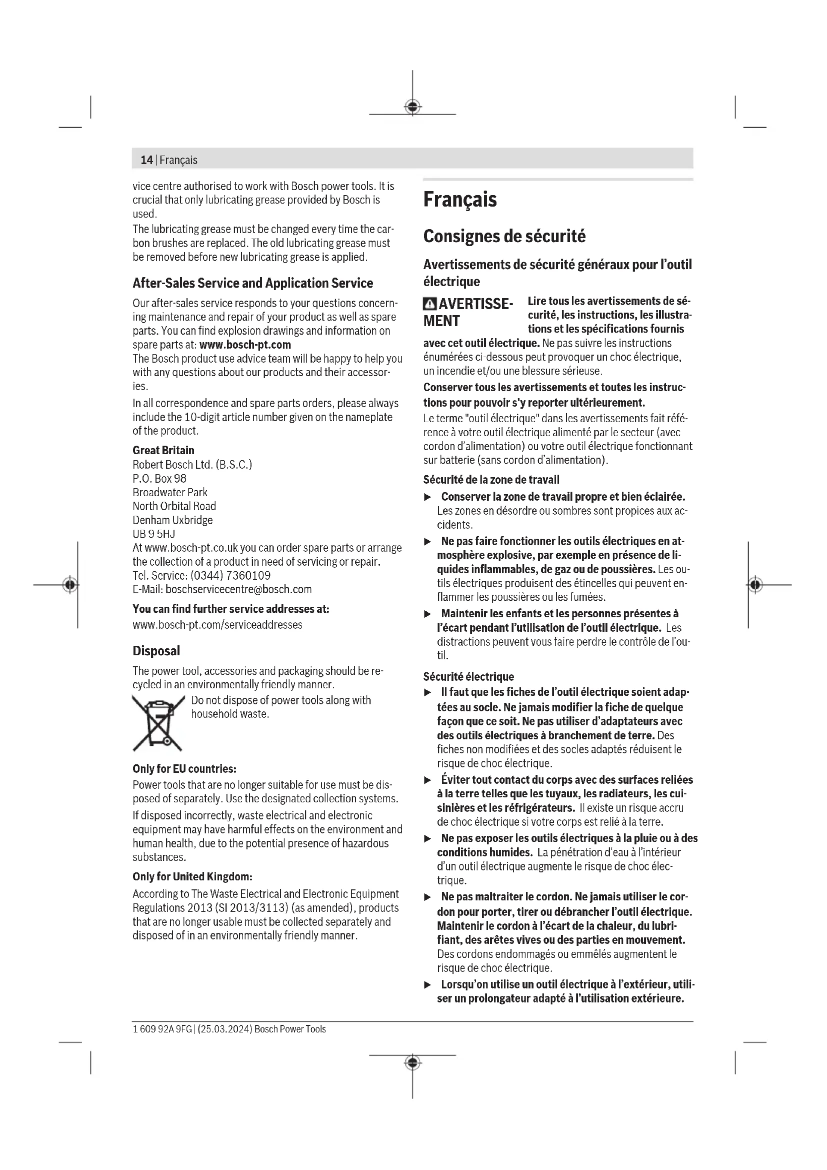 You can lock the chisel in 12 different positions, allowing you to select the optimum working position for each task. – Insert the chisel into the tool holder. – Push the chisel adjustment ring (3) forwards and turn the chisel to the required position with the chisel adjustment ring (3). – Release the chisel adjustment ring (3) and turn the chisel until it audibly clicks into place. Working Advice Sharpening Chisels Only sharp chiselling tools will produce good results, there- fore sharpen your chiselling tools in good time before use. This will ensure a long service life for the tools and good work results. Re-sharpening Grind chiselling tools against sanding discs, e.g. aluminium oxide, under a steady stream of water. Make sure that the cutting edges show no annealing colours; this will impair the hardness of the chiselling tools. To forge a chisel, heat it to 850–1050 °C (pale red to yel- low). To harden a chisel, heat it to approx. 900 °C and quench in oil. Then, leave it in an oven for approx. one hour at 320 °C (annealing colour: pale blue). Maintenance and Service Maintenance and Cleaning u Pull the plug out of the socket before carrying out any work on the power tool. u To ensure safe and efficient operation, always keep the power tool and the ventilation slots clean. In order to avoid safety hazards, if the power supply cord needs to be replaced, this must be done by Bosch or by an after-sales service centre that is authorised to repair Bosch power tools. u Replace a damaged dust protection cap immediately. It is recommended that you have use an after-sales service for this. Lubrication The power tool is lubricated with grease and is ready for im- mediate use. The lubricating grease should only be changed during main- tenance or commissioning carried out by an after-sales ser- Bosch Power Tools 1 609 92A 9FG | (25.03.2024)14 | Français vice centre authorised to work with Bosch power tools. It is crucial that only lubricating grease provided by Bosch is used. The lubricating grease must be changed every time the car- bon brushes are replaced. The old lubricating grease must be removed before new lubricating grease is applied. After-Sales Service and Application Service Our after-sales service responds to your questions concern- ing maintenance and repair of your product as well as spare parts. You can find explosion drawings and information on spare parts at: www.bosch-pt.com The Bosch product use advice team will be happy to help you with any questions about our products and their accessor- ies. In all correspondence and spare parts orders, please always include the 10‑digit article number given on the nameplate of the product. Great Britain Robert Bosch Ltd. (B.S.C.) P.O. Box 98 Broadwater Park North Orbital Road Denham Uxbridge UB 9 5HJ At www.bosch-pt.co.uk you can order spare parts or arrange the collection of a product in need of servicing or repair. Tel. Service: (0344) 7360109 E-Mail: boschservicecentre@bosch.com You can find further service addresses at: www.bosch-pt.com/serviceaddresses Disposal The power tool, accessories and packaging should be re- cycled in an environmentally friendly manner. Do not dispose of power tools along with household waste. Only for EU countries: Power tools that are no longer suitable for use must be dis- posed of separately. Use the designated collection systems. If disposed incorrectly, waste electrical and electronic equipment may have harmful effects on the environment and human health, due to the potential presence of hazardous substances. Only for United Kingdom: According to The Waste Electrical and Electronic Equipment Regulations 2013 (SI 2013/3113) (as amended), products that are no longer usable must be collected separately and disposed of in an environmentally friendly manner. Français Consignes de sécurité Avertissements de sécurité généraux pour l’outil électrique AVERTISSE- MENT Lire tous les avertissements de sé- curité, les instructions, les illustra- tions et les spécifications fournis avec cet outil électrique. Ne pas suivre les instructions énumérées ci-dessous peut provoquer un choc électrique, un incendie et/ou une blessure sérieuse. Conserver tous les avertissements et toutes les instruc- tions pour pouvoir s'y reporter ultérieurement. Le terme "outil électrique" dans les avertissements fait réfé- rence à votre outil électrique alimenté par le secteur (avec cordon d’alimentation) ou votre outil électrique fonctionnant sur batterie (sans cordon d’alimentation). Sécurité de la zone de travail u Conserver la zone de travail propre et bien éclairée. Les zones en désordre ou sombres sont propices aux ac- cidents. u Ne pas faire fonctionner les outils électriques en at- mosphère explosive, par exemple en présence de li- quides inflammables, de gaz ou de poussières. Les ou- tils électriques produisent des étincelles qui peuvent en- flammer les poussières ou les fumées. u Maintenir les enfants et les personnes présentes à l’écart pendant l’utilisation de l’outil électrique. Les distractions peuvent vous faire perdre le contrôle de l’ou- til. Sécurité électrique u Il faut que les fiches de l’outil électrique soient adap- tées au socle. Ne jamais modifier la fiche de quelque façon que ce soit. Ne pas utiliser d’adaptateurs avec des outils électriques à branchement de terre. Des fiches non modifiées et des socles adaptés réduisent le risque de choc électrique. u Éviter tout contact du corps avec des surfaces reliées à la terre telles que les tuyaux, les radiateurs, les cui- sinières et les réfrigérateurs. Il existe un risque accru de choc électrique si votre corps est relié à la terre. u Ne pas exposer les outils électriques à la pluie ou à des conditions humides. La pénétration d‘eau à l’intérieur d’un outil électrique augmente le risque de choc élec- trique. u Ne pas maltraiter le cordon. Ne jamais utiliser le cor- do