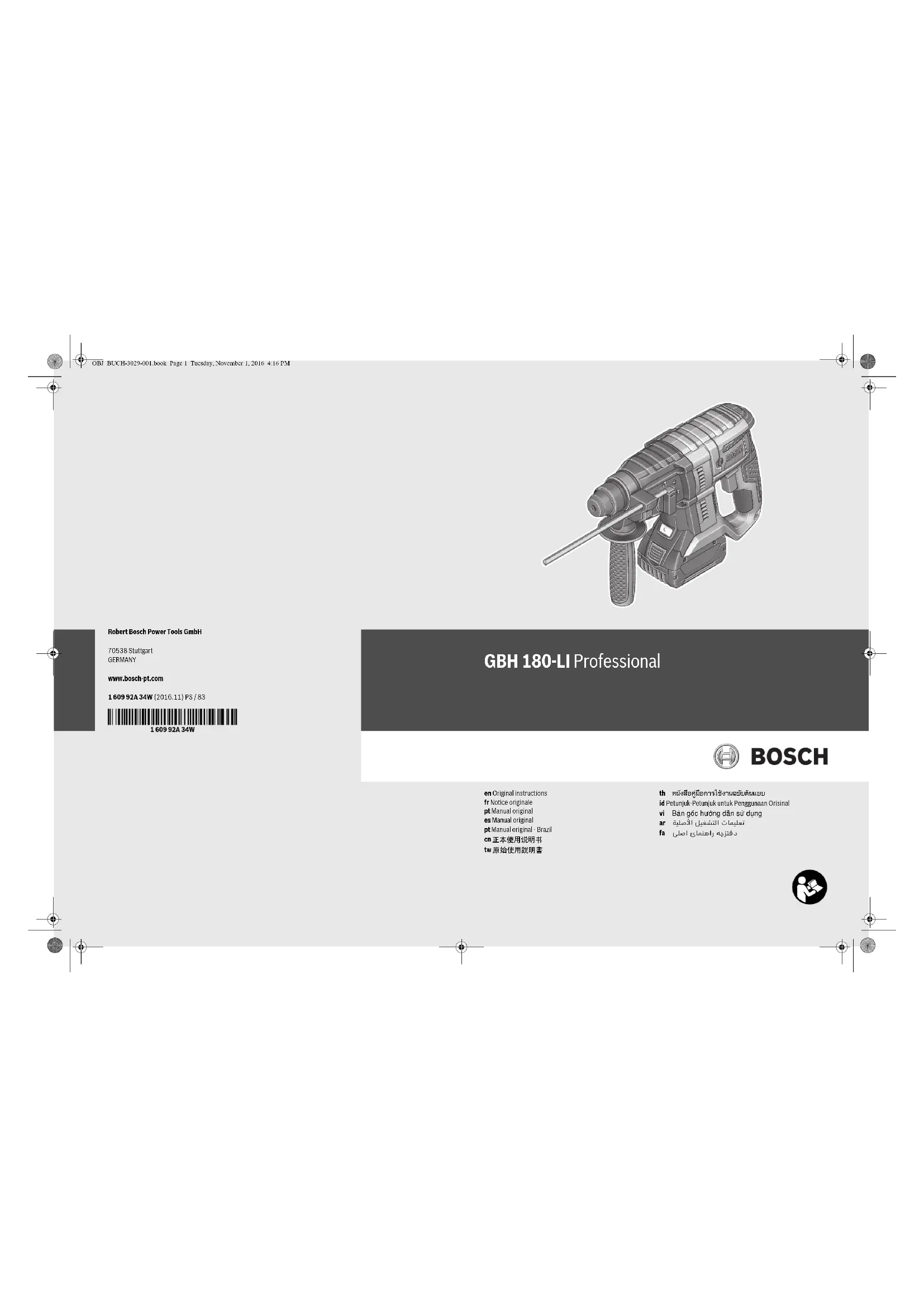 Floor Jl. RA Kartini II-S Kaveling 6 Sek II Pondok Pinang, Kebayoran Lama Jakarta Selatan 12310 Indonesia Tel.: (021) 3005 5800 Fax: (021) 3005 5801 E-Mail: boschpowertools@id.bosch.com www.bosch-pt.co.id Philippines Robert Bosch, Inc. 28th Floor Fort Legend Towers, 3rd Avenue corner 31st Street, Fort Bonifacio Global City, 1634 Taguig City, Philippines Tel.: (02) 8703871 Fax: (02) 8703870 matheus.contiero@ph.bosch.com www.bosch-pt.com.ph Bosch Service Center: 9725-27 Kamagong Street San Antonio Village Makati City, Philippines Tel.: (02) 8999091 Fax: (02) 8976432 E-Mail: rosalie.dagdagan@ph.bosch.com Malaysia Robert Bosch Sdn. Bhd. No. 8A, Jalan 13/6 G.P.O. Box 10818 46200 Petaling Jaya Selangor, Malaysia Tel.: (03) 79663194 Fax: (03) 79583838 E-Mail: cheehoe.on@my.bosch.com Toll-Free: 1800 880188 www.bosch-pt.com.my Thailand Robert Bosch Ltd. Liberty Square Building No. 287, 11 Floor Silom Road, Bangrak Bangkok 10500 Tel.: 02 6393111 Fax: 02 2384783 Robert Bosch Ltd., P. O. Box 2054 Bangkok 10501, Thailand www.bosch.co.th Bosch Service – Training Centre La Salle Tower Ground Floor Unit No.2 10/11 La Salle Moo 16 Srinakharin Road Bangkaew, Bang Plee Samutprakarn 10540 Thailand Tel.: 02 7587555 Fax: 02 7587525 Singapore Powerwell Service Centre Ptd Ltd 65 Ubi Crescent, #06-03 Hola Centre Singapore 408559 Tel.: 6746 9770/71 Fax: 6746 9760 E-Mail: powerwellsc@gmail.com Toll-Free: 1800 3338333 www.bosch-pt.com.sg Vietnam Robert Bosch Vietnam Co. Ltd 13th Floor , 194 Golden Building 473 Dien Bien Phu Street Ward 25, Binh Thanh District 84 Ho Chi Minh City Vietnam Tel.: (08) 6258 3690 Fax: (08) 6258 3692 Hotline: (08) 6250 8555 E-Mail: tuvankhachhang-pt@vn.bosch.com www.bosch-pt.com.vn www.baohanhbosch-pt.com.vn OBJ_BUCH-3029-001.book Page 8 Tuesday, November 1, 2016 4:16 PMFrançais | 9 Bosch Power Tools 1 609 92A 34W | (1.11.16) Australia, New Zealand and Pacific Islands Robert Bosch Australia Pty. Ltd. Power Tools Locked Bag 66 Clayton South VIC 3169 Customer Contact Center Inside Australia: Phone: (01300) 307044 Fax: (01300) 307045 Inside New Zealand: Phone: (0800) 543353 Fax: (0800) 428570 Outside AU and NZ: Phone: +61 3 95415555 www.bosch-pt.com.au www.bosch-pt.co.nz Egypt Unimar 20 Markaz kadmat El tagmoa EL Aoul – New Cairo Tel: +2 02 224 76091 - 95 / + 2 02 224 78072 - 73 Fax:+2 02 224 78075 E-Mail: adelzaki@unimaregypt.com Ethiopia Forever plc Kebele 2,754, BP 4806, Addis Ababa , Ethiopia Tel: +251 111 560 600, +251 111 560 600 E-Mail: foreverplc@ethionet.et Nigeria C. Woermann Ltd. P.O. Box 318 6, Badejo Kalesanwo Street Matori Industrial Estate Lagos, Nigeria Tel: +234 17 736 498, +234 17 730 904 E-Mail: d.kornemann@woermann-nigeria.com Republic of South Africa Customer service Hotline: (011) 6519600 Gauteng – BSC Service Centre 35 Roper Street, New Centre Johannesburg Tel.: (011) 4939375 Fax: (011) 4930126 E-Mail: bsctools@icon.co.za KZN – BSC Service Centre Unit E, Almar Centre 143 Crompton Street Pinetown Tel.: (031) 7012120 Fax: (031) 7012446 E-Mail: bsc.dur@za.bosch.com Western Cape – BSC Service Centre Democracy Way, Prosperity Park Milnerton Tel.: (021) 5512577 Fax: (021) 5513223 E-Mail: bsc@zsd.co.za Bosch Headquarters Midrand, Gauteng Tel.: (011) 6519600 Fax: (011) 6519880 E-Mail: rbsa-hq.pts@za.bosch.com Transport The contained lithium-ion batteries are subject to the Danger- ous Goods Legislation requirements. The user can transport the batteries by road without further requirements. When being transported by third parties (e. g.: air transport or forwarding agency), special requirements on packaging and labelling must be observed. For preparation of the item being shipped, consulting an expert for hazardous material is re- quired. Dispatch batteries only when the housing is undamaged. Tape or mask off open contacts and pack up the battery in such a manner that it cannot move around in the packaging. Please also observe possibly more detailed national regula- tions. Disposal The machine, rechargeable batteries, accessories and packaging should be sorted for environmental- friendly recycling. Do not dispose of power tools and batteries/rechargeable batteries into household waste! Battery packs/batteries: Li-ion: Please observe the instructions in sec- tion “Transport”, page 9. Subject to change without notice. Français Avertissements de sécurité généraux pour l’outil Lire tous les avertissements de sécurité et toutes les ins- tructions. Ne pas suivre les avertissements et instructions peut donner lieu à un choc électrique, un incendie et/ou une blessure sérieuse. Conserver tous les avertissements et toutes les instruc- tions pour pouvoir s’y reporter ultérieurement. AVERTISSEMENT OBJ_BUCH-3029-001.book Page 9 Tuesday, November 1, 2016 4:16 PM10 | Français 1 609 92A 34W | (1.11.16) Bosch Power Tools Le terme « outil » dans les avertissements fait référence à votre outil électrique alimenté par le secteur (avec cordon d’alimentation) ou votre outil fonctionnant sur batterie (sans cordon d’alimentation). Sécurité de la zone de travail Conserver la zone de travail propre et bien éclairée. Les zones en désordre ou sombres sont propices aux acci- dents. Ne pas faire fonctionner les outils électriques en at- mosphère explosive, par exemple en présence de li- quides inflammables, de gaz ou de poussières. Les ou- tils électriques produisent des étincelles qui peuvent enflammer les poussières ou les fumées. Maintenir les enfants et les personnes présentes à l’écart pendant l’utilisation de l’outil. Les distractions peuvent vous faire perdre le contrôle de l’outil. Sécurité électrique Il faut que les fiches de l’outil électrique soient adap- tées au socle. Ne jamais modifier la fiche de quelque fa- çon que ce soit. Ne pas utiliser d’adaptateurs avec des outils à branchement de terre. Des fiches non modifiées et des socles adaptés réduiront le risque de choc élec- trique. Eviter tout contact du corps av