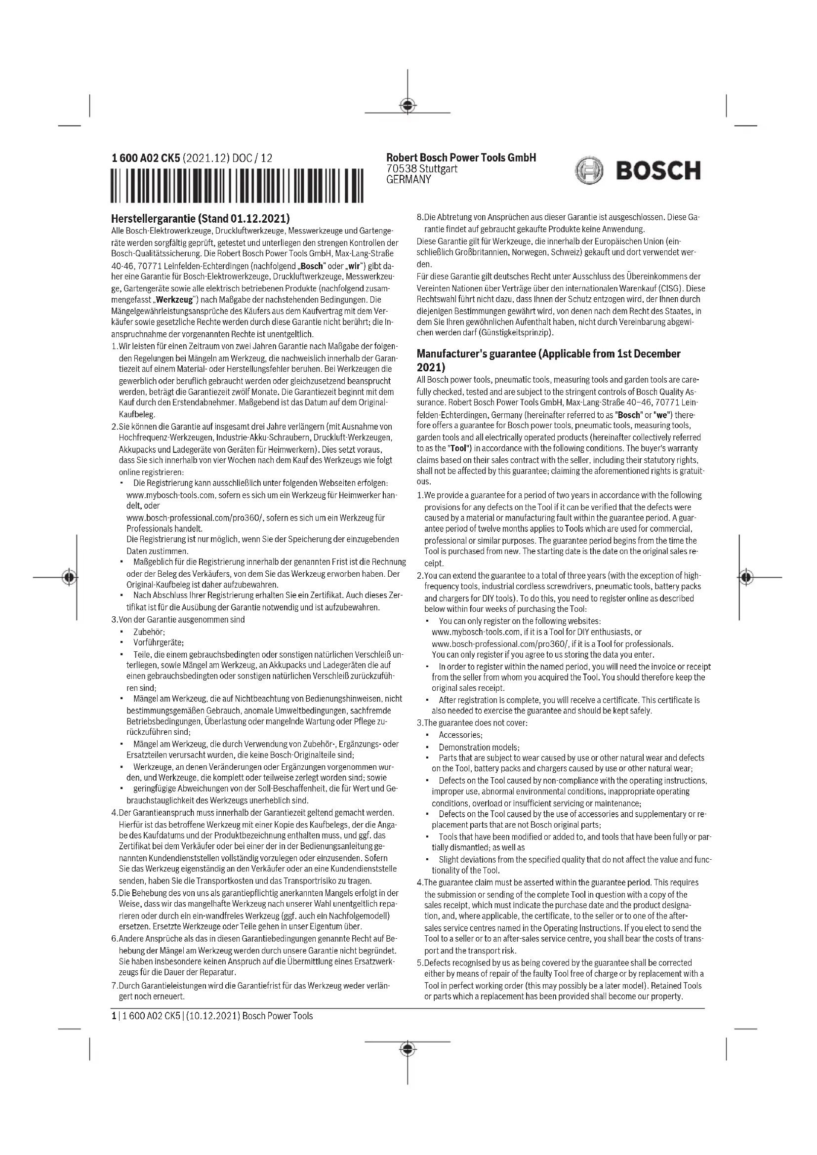 Robert Bosch Power Tools GmbH 70538 Stuttgart GERMANY6.Claims other than the right to correction of defects in the Tool named in these guarantee conditions are not covered by our guarantee. In particular, you shall not be entitled to receive a replacement Tool for the duration of the repair. 7.Services provided under guarantee do not lengthen or renew the guarantee period for the Tool. 8.The assignment of rights covered by this guarantee is excluded. This guarantee does not apply to any used products purchased. This guarantee applies to Tools that are purchased within the European Union (in- cluding the United Kingdom, Norway and Switzerland) and used within this area. German law shall apply to this guarantee to the exclusion of the United Nations Con- vention on Agreements concerning the International Sale of Goods (CISG). This choice of law shall not deprive you of the protection afforded to you by the provi- sions from which the law of the country in which you have your habitual residence may not derogate by agreement (favourability principle). Français Garantie fabricant (état: 01.12.2021) Tous les outils électroportatifs, outils pneumatiques, instruments de mesure et ou- tils de jardin Bosch sont vérifiés et testés avec le plus grand soin; ils subissent de ri- goureux contrôles par les services qualités Bosch. La societé Robert Bosch Power Tools GmbH, Max-Lang-Straße 40-46, 70771 Leinfelden-Echterdingen (ci-après «Bosch» ou «nous») accorde pour cette raison une garantie pour les outils électro- portatifs, outils pneumatiques, instruments de mesure, outils de jardin et tous les produits électriques (ci-après «Outils») sous réserve de respect des conditions énoncées ci-après. Les droits à garantie de l’acheteur pour vices cachés, stipulés dans le contrat de vente conclu avec le vendeur, ainsi que les droits légaux ne sont pas restreints par cette garantie; l’exercice des droits précités est gratuit. 1.Nous accordons, moyennant respect des dispositions qui suivent, une garantie de 2 ans pour les défauts de l’outil imputables de manière incontestable à un vice de de fabrication ou défaut de matériaux pendant la période de garantie. Pour les ou- tils à usage professionnel ou commercial ou soumis aux mêmes contraintes, la du- rée de garantie est de 12 mois. La période de la garantie commence le jour de l’achat par l’utilisateur final. La date faisant foi est celle figurant sur l’original de la preuve d’achat. 2.Vous avez la possibilité d’étendre à maximum 3 ans la durée de garantie de ces outils (à l’exception des outils haute fréquence, visseuses sans fil industrielles, outils pneumatiques, batteries et chargeurs pour outils de la gamme Grand Pu- blic). Pour cela, vous devez vous inscrire en ligne dans les 4 semaines qui suivent l’achat de l’outil en procédant comme suit :