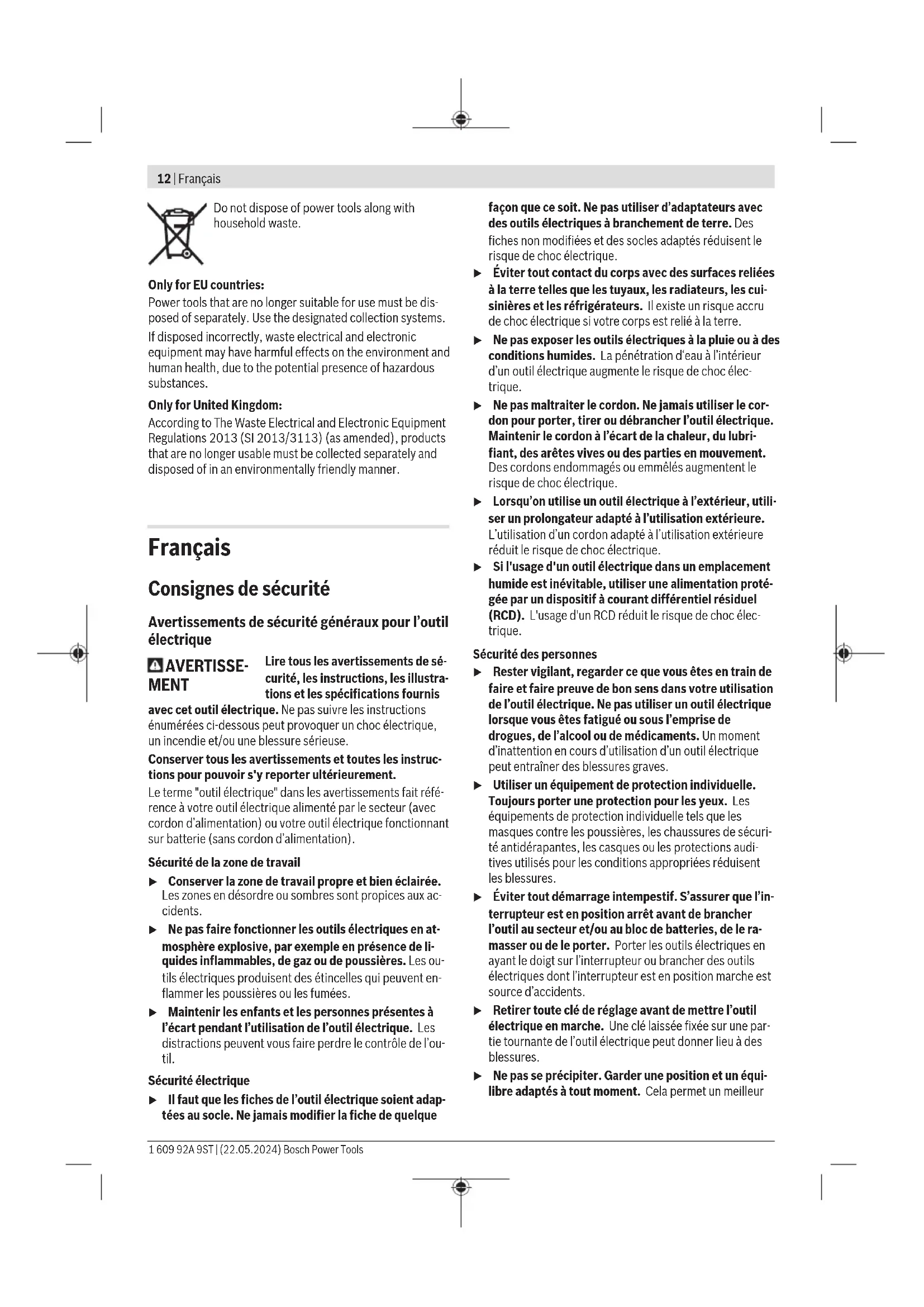Lubricating/cooling the punch To extend the service life of the punch(6), a lubricating agent with good cooling properties (e.g. cutting oil) should be used. Apply a line of lubricant to the top side of the metal sheet along the intended cutting line. Cutting along a cutting mark or with a guide Straight cuts are carried out easier when the power tool is guided alongside a rule. Contours can be cut by guiding the power tool along a tem- plate. For inside cuts, a hole with a diameter of 21mm must be pre-drilled. Maintenance and Service Maintenance and Cleaning u Pull the plug out of the socket before carrying out any work on the power tool. u To ensure safe and efficient operation, always keep the power tool and the ventilation slots clean. In order to avoid safety hazards, if the power supply cord needs to be replaced, this must be done by Bosch or by an after-sales service centre that is authorised to repair Bosch power tools. Clean and lubricate the punch(6) and die(7) every three operating hours. Change the punch and die in good time when worn. Only sharp tools produce a good cutting quality and make the power tool last longer. The punch(6) and the die(7) may not be resharpened. Changing the die Unscrew the knurled screw(9) from the die holder(5). Take out the die(7). If necessary, clean the die holder(5). Put a new, well greased die(7) into the die holder. Pay attention to the alignment of the flat side. Screw back on the knurled screw(9) with the rubber ring(8) attached. Use a hex key to tighten the screw against the resistance of the rubber ring (3–4Nm). Changing the punch Loosen the die holder screw(2) and pull the die holder(5) completely out of the housing. Slide the punch(6) sideways out of the mounting and pull it out in a downward motion. Put a new, well greased punch(6) in the groove of the mounting and centre it. Push the die holder(5) carefully over the punch and back into the housing. Turn the die holder into one of the three possible positions depending on the cutting direction re- quired. Firmly tighten the die holder screw(2). After-Sales Service and Application Service Our after-sales service responds to your questions concern- ing maintenance and repair of your product as well as spare parts. You can find explosion drawings and information on spare parts at: www.bosch-pt.com The Bosch product use advice team will be happy to help you with any questions about our products and their accessor- ies. In all correspondence and spare parts orders, please always include the 10‑digit article number given on the nameplate of the product. Great Britain Robert Bosch Ltd. (B.S.C.) P.O. Box 98 Broadwater Park North Orbital Road Denham Uxbridge UB 9 5HJ At www.bosch-pt.co.uk you can order spare parts or arrange the collection of a product in need of servicing or repair. Tel. Service: (0344) 7360109 E-Mail: boschservicecentre@bosch.com You can find further service addresses at: www.bosch-pt.com/serviceaddresses Disposal The power tool, accessories and packaging should be re- cycled in an environmentally friendly manner. Bosch Power Tools 1 609 92A 9ST | (22.05.2024)12 | Français Do not dispose of power tools along with household waste. Only for EU countries: Power tools that are no longer suitable for use must be dis- posed of separately. Use the designated collection systems. If disposed incorrectly, waste electrical and electronic equipment may have harmful effects on the environment and human health, due to the potential presence of hazardous substances. Only for United Kingdom: According to The Waste Electrical and Electronic Equipment Regulations 2013 (SI 2013/3113) (as amended), products that are no longer usable must be collected separately and disposed of in an environmentally friendly manner. Français Consignes de sécurité Avertissements de sécurité généraux pour l’outil électrique AVERTISSE- MENT Lire tous les avertissements de sé- curité, les instructions, les illustra- tions et les spécifications fournis avec cet outil électrique. Ne pas suivre les instructions énumérées ci-dessous peut provoquer un choc électrique, un incendie et/ou une blessure sérieuse. Conserver tous les avertissements et toutes les instruc- tions pour pouvoir s'y reporter ultérieurement. Le terme "outil électrique" dans les avertissements fait réfé- rence à votre outil électrique alimenté par le secteur (avec cordon d’alimentation) ou votre outil électrique fonctionnant sur batterie (sans cordon d’alimentation). Sécurité de la zone de travail u Conserver la zone de travail propre et bien éclairée. Les zones en désordre ou sombres sont propices aux ac- cidents. u Ne pas faire fonctionner les outils électriques en at- mosphère explosive, par exemple en présence de li- quides inflammables, de gaz ou de poussières. Les ou- tils électriques produisent des étincelles qui peuvent en- flammer les poussières ou les fumées. u Maintenir les enfants et les personnes présentes à l’écart pendant l’utilisation de l’outil électrique. Les distractions peuvent vous faire perdre le contrôle de l’ou- til. Sécurité électrique u Il faut que les fiches de l’outil électrique soient adap- tées au socle. Ne jamais modifier la fiche de quelque façon que ce soit. Ne pas utiliser d’adaptateurs avec des outils électriques à branchement de terre. Des fiches non modifiées et des socles adaptés réduisent le risque de choc électrique. u Éviter tout contact du corps avec des surfaces reliées à la terre telles que les tuyaux, les radiateurs, les cui- sinières et les réfrigérateurs. Il existe un risque accru de choc électrique si votre corps est relié à la terre. u Ne pas exposer les outils électriques à la pluie ou à des conditions humides. La pénétration d‘eau à l’intérieur d’un outil électrique augmente le risque de choc élec- trique. u Ne pas maltraiter le cordon. Ne jamais utiliser le cor- don pour porter, tirer ou débrancher l