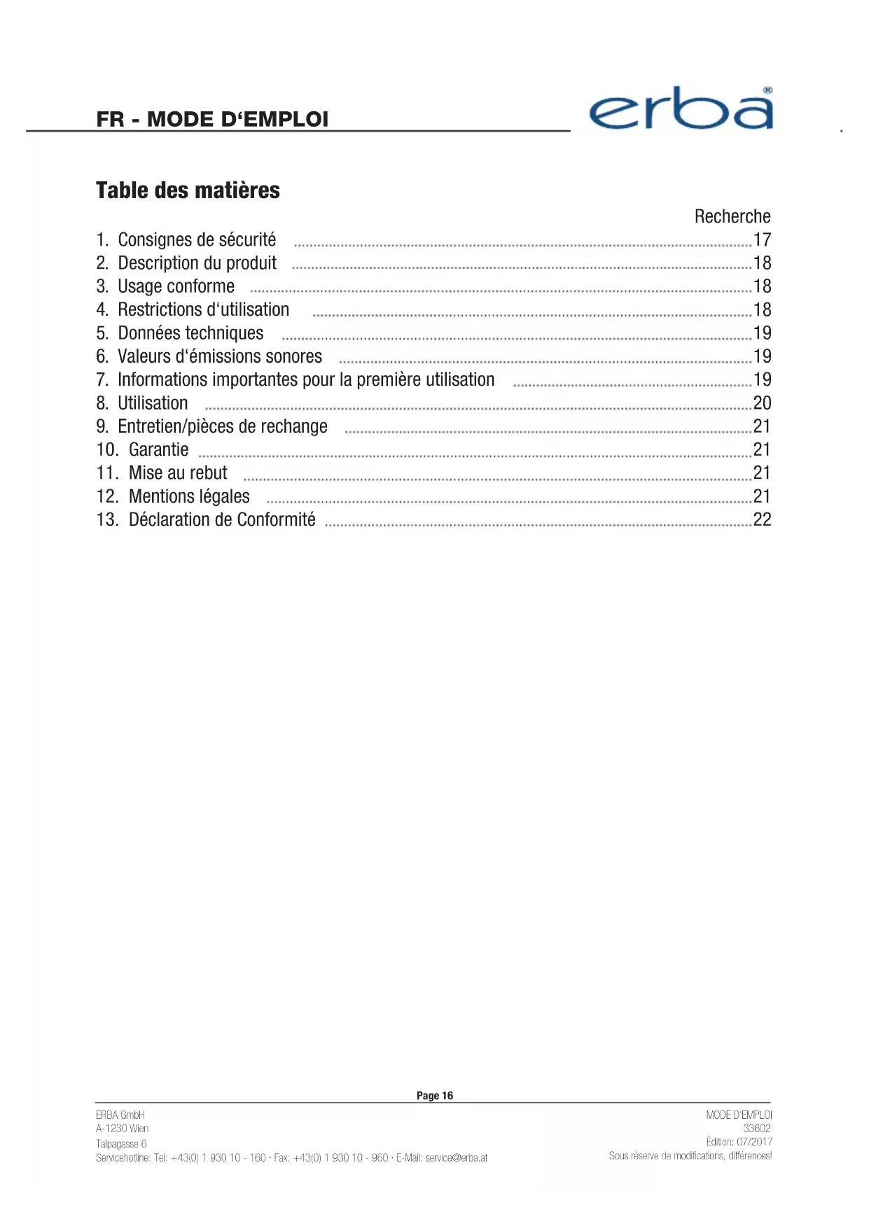 Retrouvez gratuitement la notice de l'appareil 33602 Erba au format PDF.
