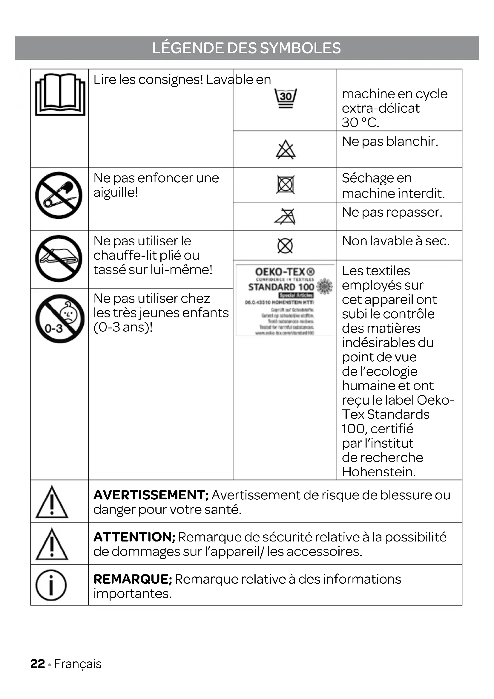 ![]() | Ne pas utiliser le chauffe-lit plié ou tassé sur lui-même! | ![]() | Non lavable à sec. |