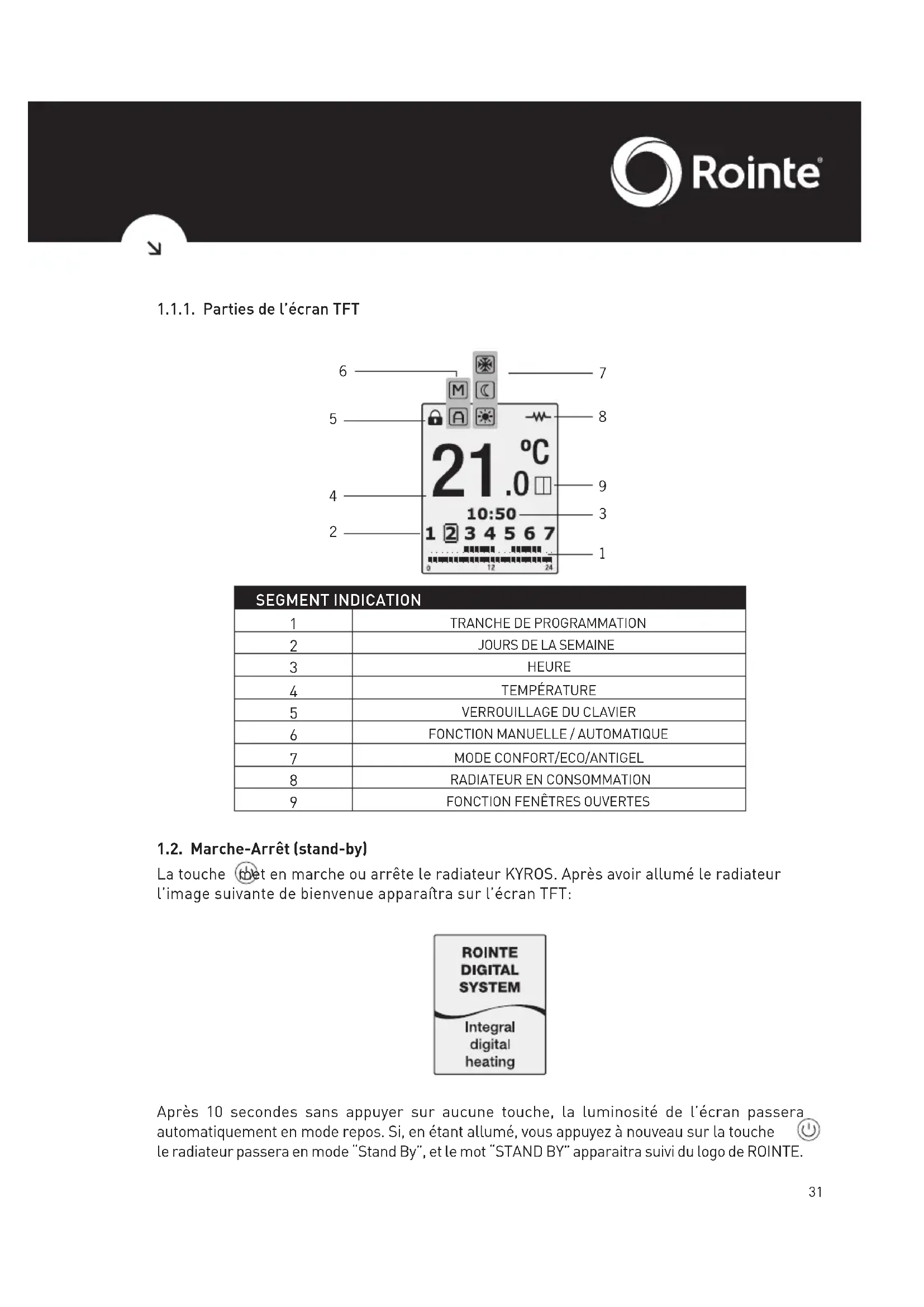 Après 10 secondes sans appuyer sur aucune touche, la luminosité de l'écran passera automatiquement en mode repos. Si, en étant allumé, vous appuyez à nouveau sur la touche le radiateur passera en mode "Stand By", et le mot "STAND BY" apparaitra suivi du logo de RoinTE.
