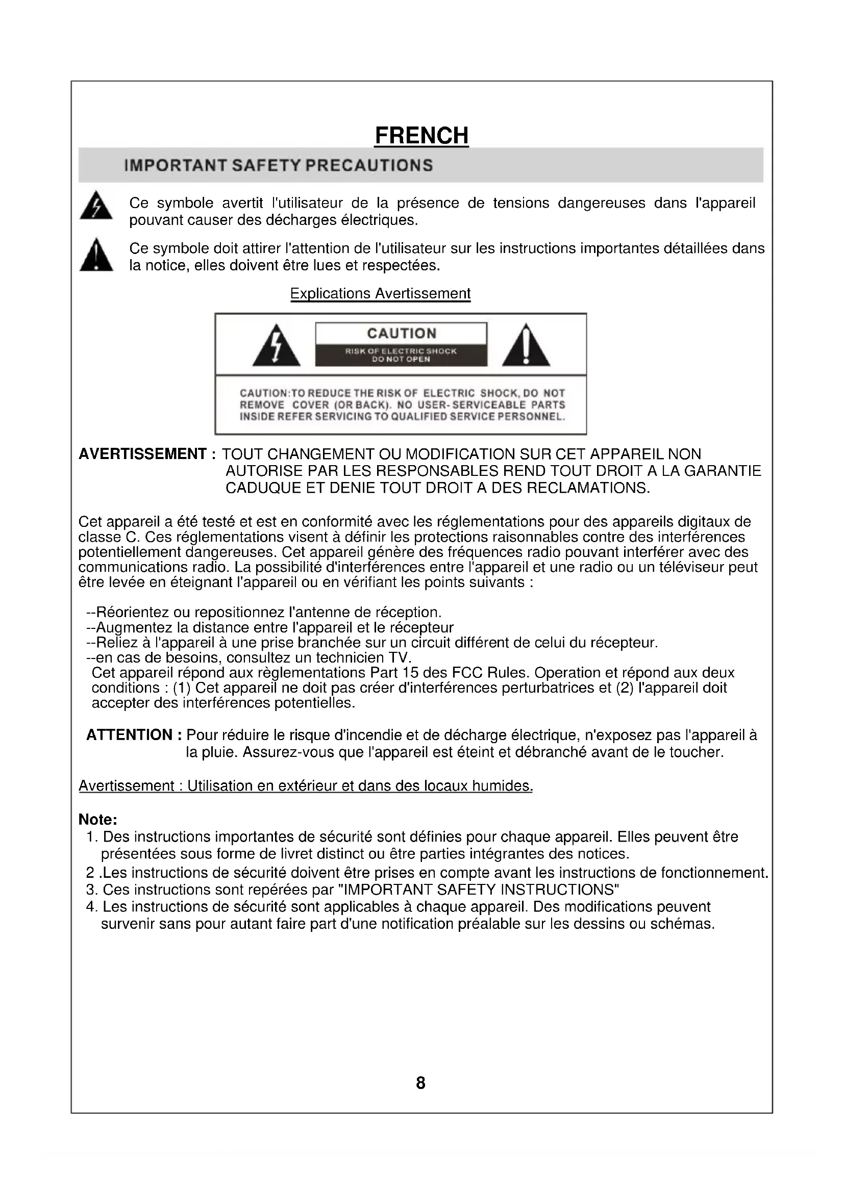 AVERTISSEMENT : TOUT CHANGESMENT OU MODIFICATION SUR CET APPAREIL NON AutorISE PAR LES RESPONSABLES REND TOUT DROIT A LA GARANTIE CADUQUE ET DENIE TOUT DROIT A DES RECLAMATIONS.