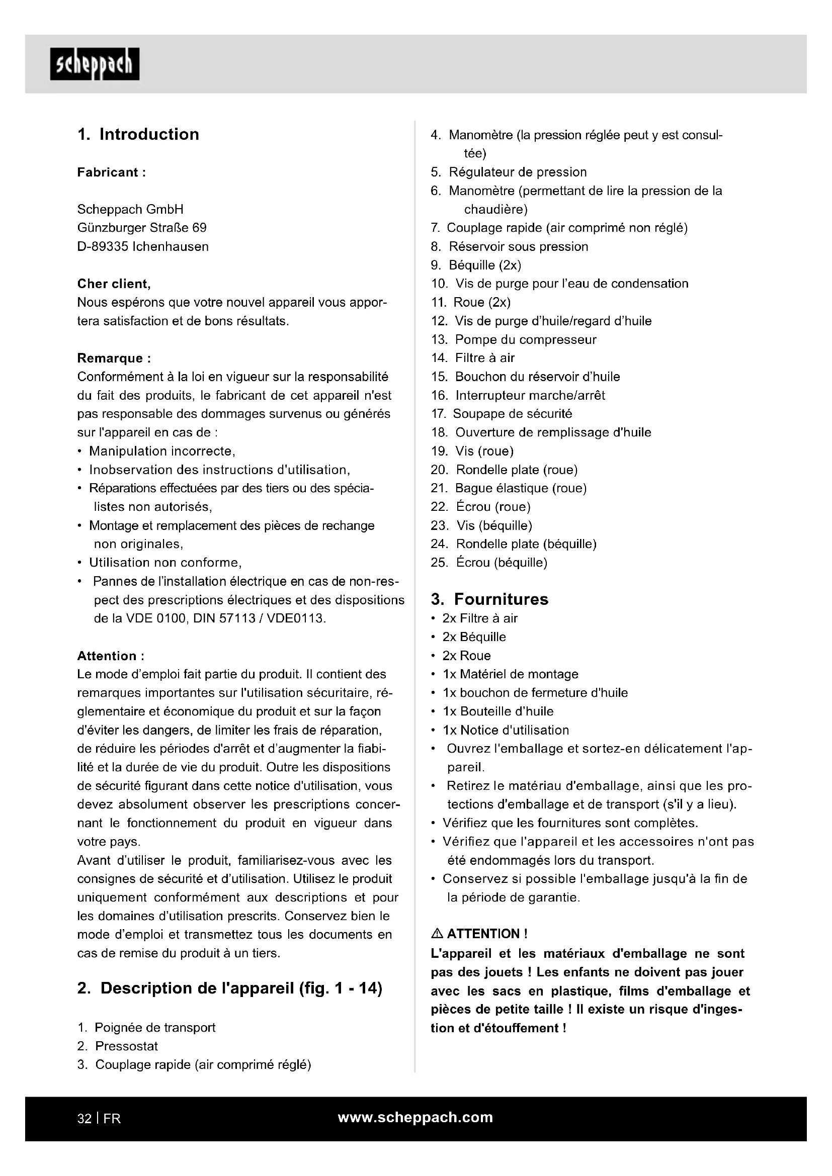 Fabricant : Scheppach GmbH Günzburger Straße 69 D-89335 Ichenhausen Cher client, Nous espérons que votre nouvel appareil vous appor- tera satisfaction et de bons résultats. Remarque : Conformément à la loi en vigueur sur la responsabilité du fait des produits, le fabricant de cet appareil n'est pas responsable des dommages survenus ou générés sur l'appareil en cas de :