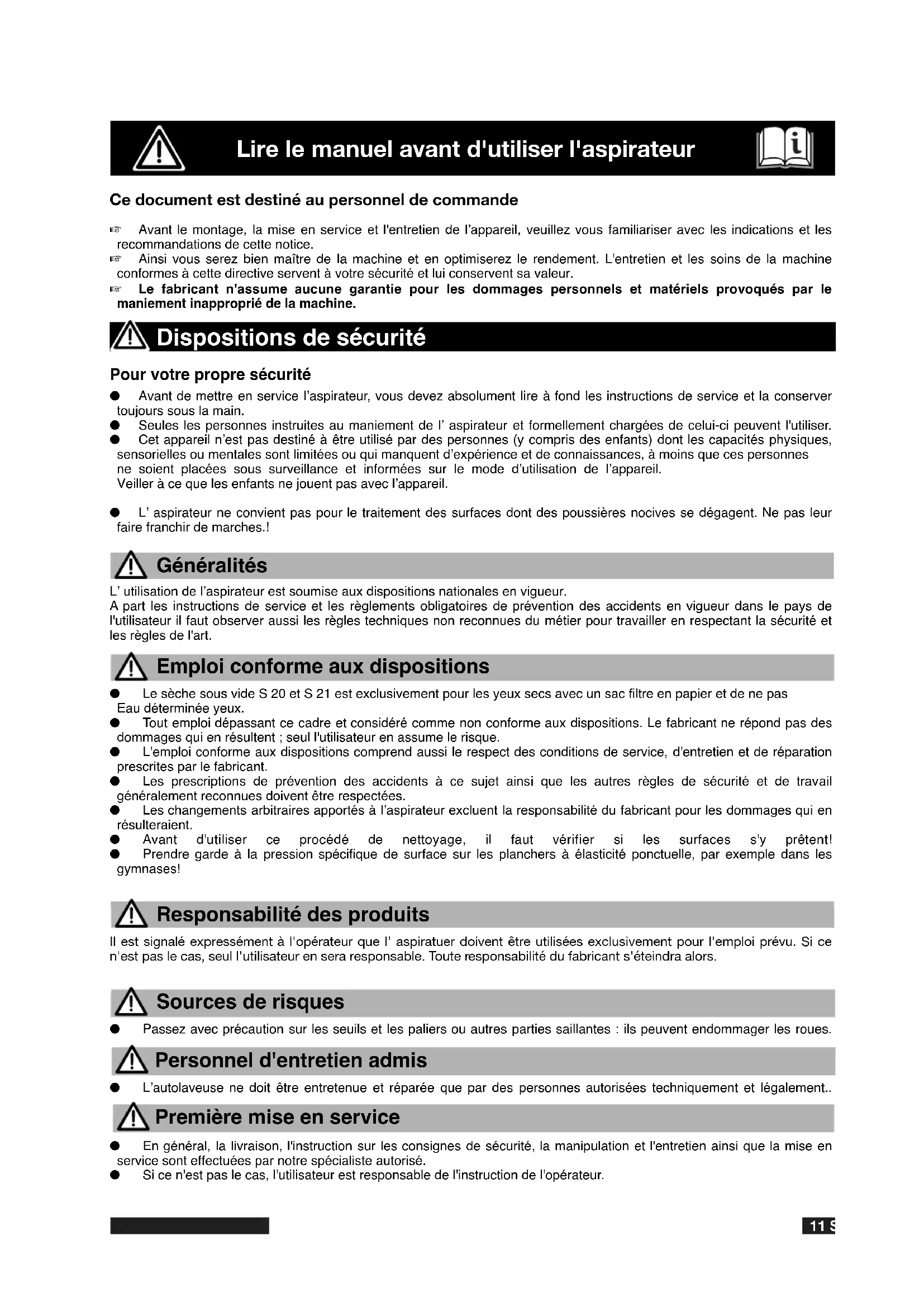 Il est signale exprésément à l'opérateur que I' aspiratuer doit être utilisées exclusivement pour I'emploi prévu. Si ce n'est pas le case, seul l'utilisateur en sera responsable. Toute responsabilité du fabricant s'eteindra alors.