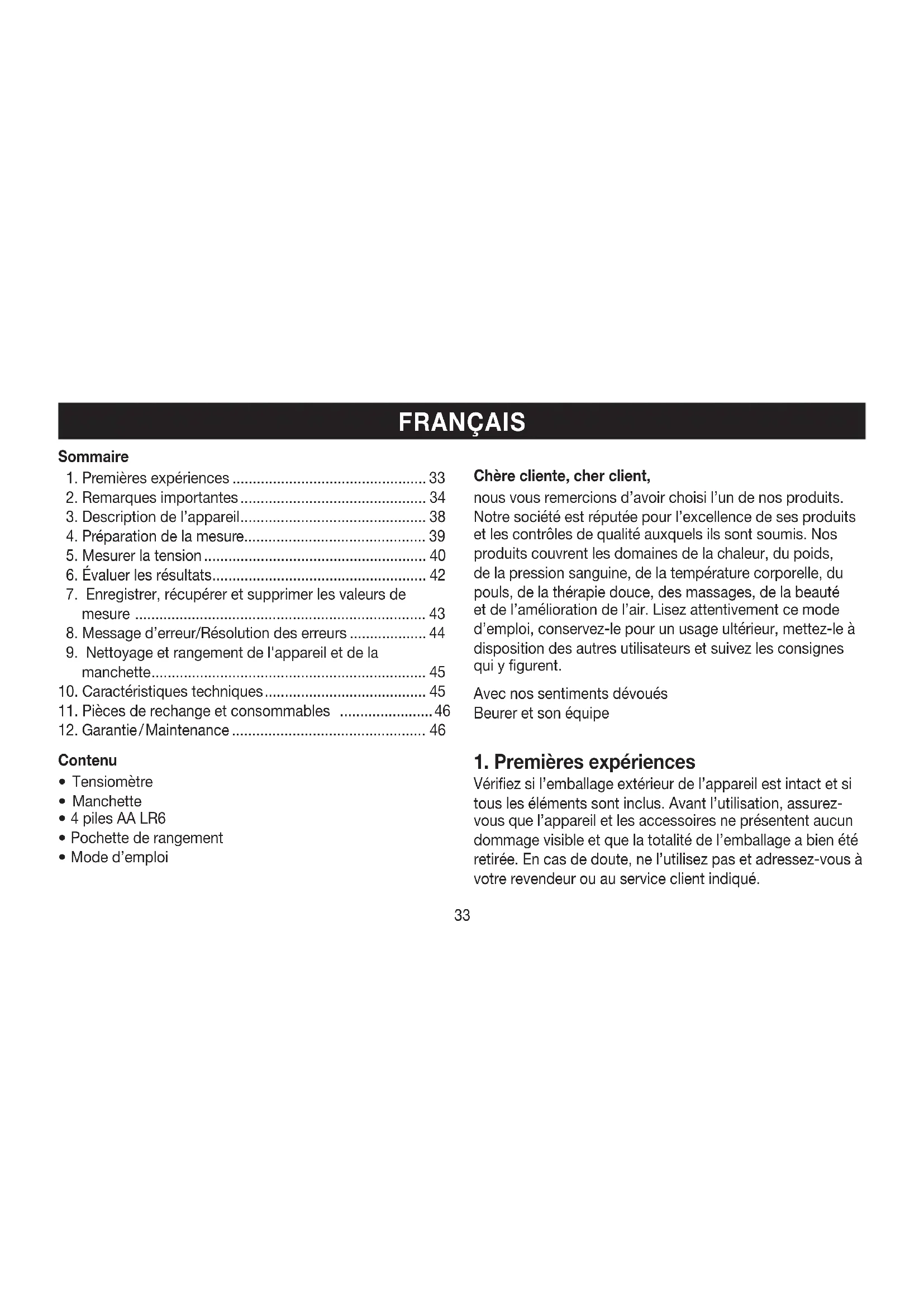 Mode d’emploi Chère cliente, cher client, nous vous remercions d’avoir choisi l’un de nos produits. Notre société est réputée pour l’excellence de ses produits et les contrôles de qualité auxquels ils sont soumis. Nos produits couvrent les domaines de la chaleur, du poids, de la pression sanguine, de la température corporelle, du pouls, de la thérapie douce, des massages, de la beauté et de l’amélioration de l’air. Lisez attentivement ce mode d’emploi, conservez-le pour un usage ultérieur, mettez-le à disposition des autres utilisateurs et suivez les consignes qui y figurent. Avec nos sentiments dévoués Beurer et son équipe
