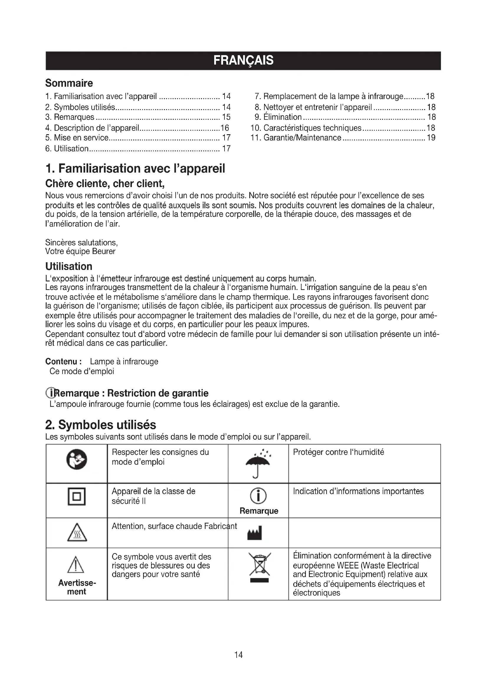 Chère cliente, cher client, Nous vous remercions d’avoir choisi l’un de nos produits. Notre société est réputée pour l’excellence de ses produits et les contrôles de qualité auxquels ils sont soumis. Nos produits couvrent les domaines de la chaleur, du poids, de la tension artérielle, de la température corporelle, de la thérapie douce, des massages et de l’amélioration de l’air. Sincères salutations, Votre équipe Beurer Utilisation L‘exposition à l‘émetteur infrarouge est destiné uniquement au corps humain. Les rayons infrarouges transmettent de la chaleur à l‘organisme humain. L‘irrigation sanguine de la peau s‘en trouve activée et le métabolisme s‘améliore dans le champ thermique. Les rayons infrarouges favorisent donc la guérison de l‘organisme; utilisés de façon ciblée, ils participent aux processus de guérison. Ils peuvent par exemple être utilisés pour accompagner le traitement des maladies de l‘oreille, du nez et de la gorge, pour amé- liorer les soins du visage et du corps, en particulier pour les peaux impures. Cependant consultez tout d‘abord votre médecin de famille pour lui demander si son utilisation présente un inté- rêt médical dans ce cas particulier. Contenu: Lampe à infrarouge Ce mode d’emploi Remarque: Restriction de garantie L’ampoule infrarouge fournie (comme tous les éclairages) est exclue de la garantie.