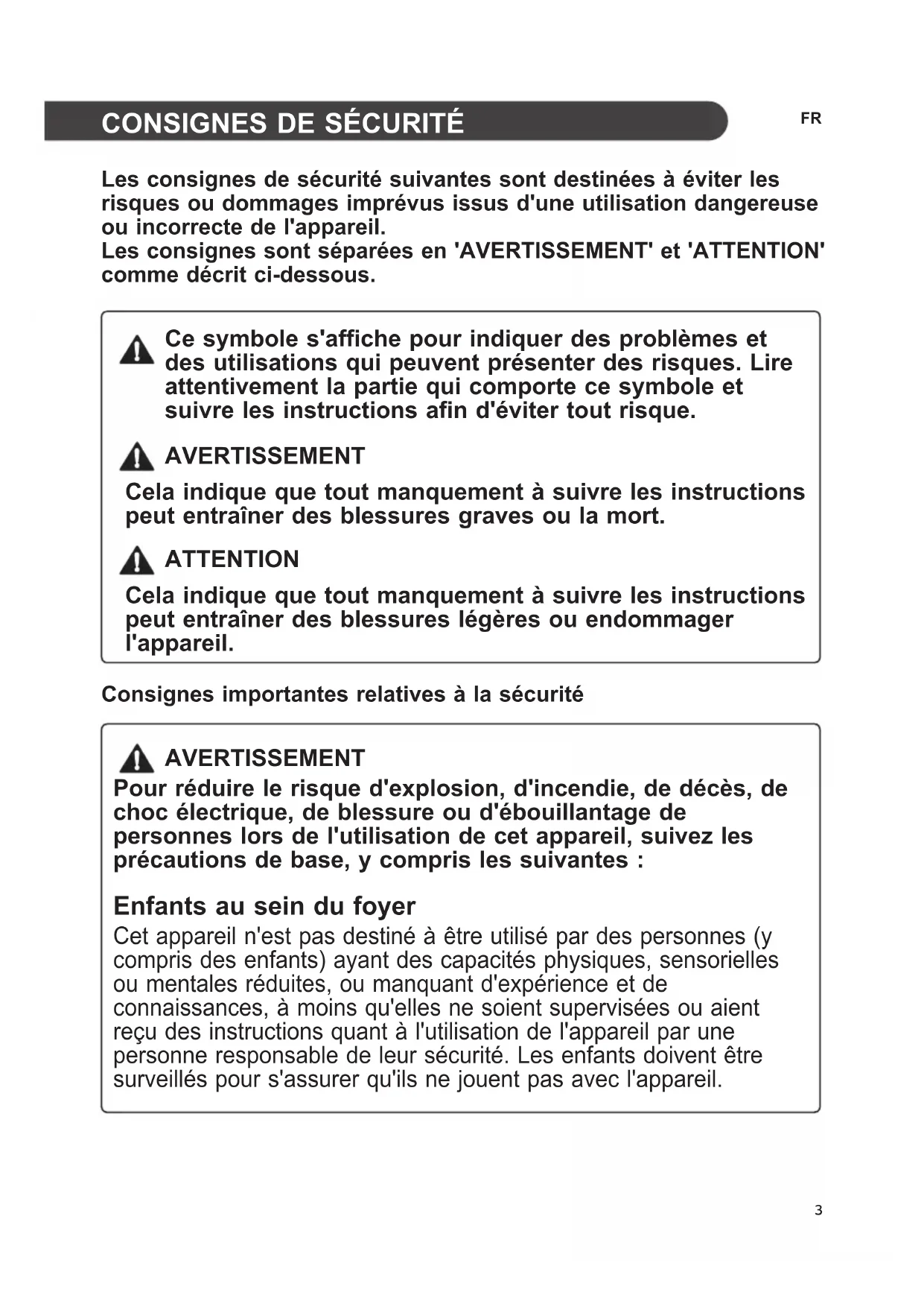 Les consignes de sécurité suivantes sont destinées à éviter les risques ou dommages imprévus issus d'une utilisation dangereuse ou incorrecte de l'appareil. Les consignes sont séparées en 'AVERTISSEMENT' et 'ATTENTION' comme décrit ci-dessous. Ce symbole s'affiche pour indiquer des problèmes et des utilisations qui peuvent présenter des risques. Lire attentivement la partie qui comporte ce symbole et suivre les instructions afin d'éviter tout risque. AVERTISSEMENT Cela indique que tout manquement à suivre les instructions peut entraîner des blessures graves ou la mort. ATTENTION Cela indique que tout manquement à suivre les instructions peut entraîner des blessures légères ou endommager l'appareil. Consignes importantes relatives à la sécurité AVERTISSEMENT Pour réduire le risque d'explosion, d'incendie, de décès, de choc électrique, de blessure ou d'ébouillantage de personnes lors de l'utilisation de cet appareil, suivez les précautions de base, y compris les suivantes : Enfants au sein du foyer Cet appareil n'est pas destiné à être utilisé par des personnes (y compris des enfants) ayant des capacités physiques, sensorielles ou mentales réduites, ou manquant d'expérience et de connaissances, à moins qu'elles ne soient supervisées ou aient reçu des instructions quant à l'utilisation de l'appareil par une personne responsable de leur sécurité. Les enfants doivent être surveillés pour s'assurer qu'ils ne jouent pas avec l'appareil.4