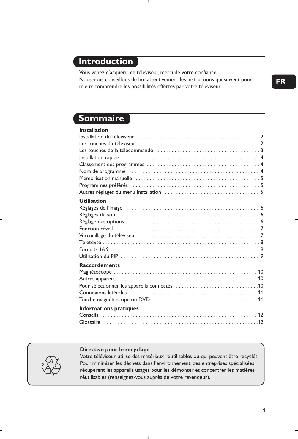 Installation Installation du téléviseur . . . . . . . . . . . . . . . . . . . . . . . . . . . . . . . . . . . . . . . . . . . . . 2 Les touches du téléviseur . . . . . . . . . . . . . . . . . . . . . . . . . . . . . . . . . . . . . . . . . . . . 2 Les touches de la télécommande . . . . . . . . . . . . . . . . . . . . . . . . . . . . . . . . . . . . . . 3 Installation rapide . . . . . . . . . . . . . . . . . . . . . . . . . . . . . . . . . . . . . . . . . . . . . . . . . . .4 Classement des programmes . . . . . . . . . . . . . . . . . . . . . . . . . . . . . . . . . . . . . . . . . 4 Nom de programme . . . . . . . . . . . . . . . . . . . . . . . . . . . . . . . . . . . . . . . . . . . . . . . .4 Mémorisation manuelle . . . . . . . . . . . . . . . . . . . . . . . . . . . . . . . . . . . . . . . . . . . . . 5 Programmes préférés . . . . . . . . . . . . . . . . . . . . . . . . . . . . . . . . . . . . . . . . . . . . . . . 5 Autres réglages du menu Installation . . . . . . . . . . . . . . . . . . . . . . . . . . . . . . . . . . .5 Utilisation Réglages de l’image . . . . . . . . . . . . . . . . . . . . . . . . . . . . . . . . . . . . . . . . . . . . . . . . .6 Réglages du son . . . . . . . . . . . . . . . . . . . . . . . . . . . . . . . . . . . . . . . . . . . . . . . . . . . .6 Réglage des options . . . . . . . . . . . . . . . . . . . . . . . . . . . . . . . . . . . . . . . . . . . . . . . . .6 Fonction réveil . . . . . . . . . . . . . . . . . . . . . . . . . . . . . . . . . . . . . . . . . . . . . . . . . . . . .7 Verrouillage du téléviseur . . . . . . . . . . . . . . . . . . . . . . . . . . . . . . . . . . . . . . . . . . . .7 Télétexte . . . . . . . . . . . . . . . . . . . . . . . . . . . . . . . . . . . . . . . . . . . . . . . . . . . . . . . . . 8 Formats 16:9 . . . . . . . . . . . . . . . . . . . . . . . . . . . . . . . . . . . . . . . . . . . . . . . . . . . . . .9 Utilisation du PIP . . . . . . . . . . . . . . . . . . . . . . . . . . . . . . . . . . . . . . . . . . . . . . . . . . .9 Raccordements Magnétoscope . . . . . . . . . . . . . . . . . . . . . . . . . . . . . . . . . . . . . . . . . . . . . . . . . . . . 10 Autres appareils . . . . . . . . . . . . . . . . . . . . . . . . . . . . . . . . . . . . . . . . . . . . . . . . . . 10 Pour sélectionner les appareils connectés . . . . . . . . . . . . . . . . . . . . . . . . . . . . . .10 Connexions latérales . . . . . . . . . . . . . . . . . . . . . . . . . . . . . . . . . . . . . . . . . . . . . . .11 Touche magnétoscope ou DVD . . . . . . . . . . . . . . . . . . . . . . . . . . . . . . . . . . . . . .11 Informations pratiques Conseils . . . . . . . . . . . . . . . . . . . . . . . . . . . . . . . . . . . . . . . . . . . . . . . . . . . . . . . . 12 Glossaire . . . . . . . . . . . . . . . . . . . . . . . . . . . . . . . . . . . . . . . . . . . . . . . . . . . . . . . .12