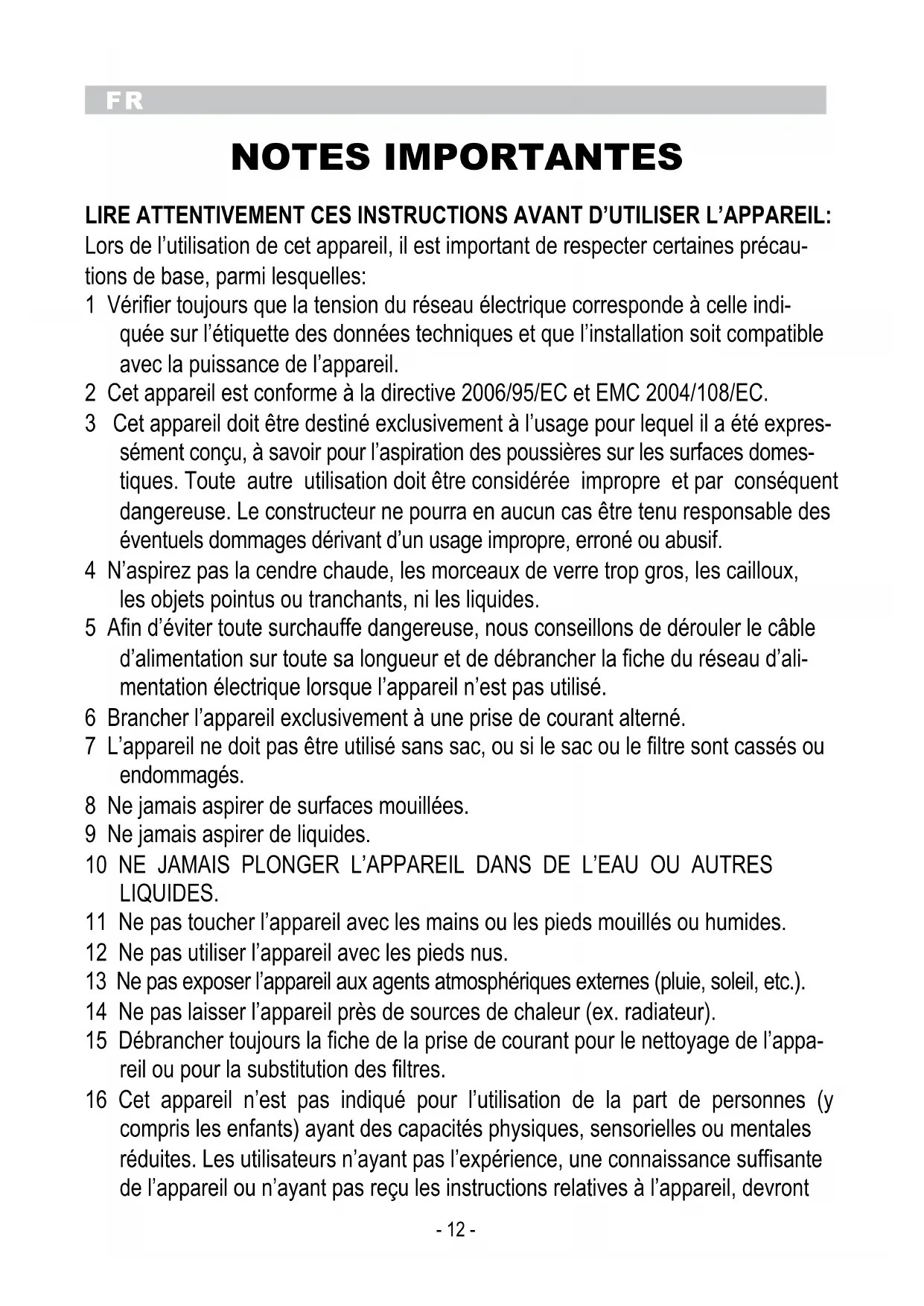 NOTES IMPORTANTES LIRE ATTENTIVEMENT CES INSTRUCTIONS AVANT D’UTILISER L’APPAREIL: Lors de l’utilisation de cet appareil, il est important de respecter certaines précau- tions de base, parmi lesquelles: 1 Vérifier toujours que la tension du réseau électrique corresponde à celle indi- quée sur l’étiquette des données techniques et que l’installation soit compatible avec la puissance de l’appareil. 2 Cet appareil est conforme à la directive 2006/95/EC et EMC 2004/108/EC. 3 Cet appareil doit être destiné exclusivement à l’usage pour lequel il a été expres- sément conçu, à savoir pour l’aspiration des poussières sur les surfaces domes- tiques. Toute autre utilisation doit être considérée impropre et par conséquent dangereuse. Le constructeur ne pourra en aucun cas être tenu responsable des éventuels dommages dérivant d’un usage impropre, erroné ou abusif. 4 N’aspirez pas la cendre chaude, les morceaux de verre trop gros, les cailloux, les objets pointus ou tranchants, ni les liquides. 5 Afin d’éviter toute surchauffe dangereuse, nous conseillons de dérouler le câble d’alimentation sur toute sa longueur et de débrancher la fiche du réseau d’ali- mentation électrique lorsque l’appareil n’est pas utilisé. 6 Brancher l’appareil exclusivement à une prise de courant alterné. 7 L’appareil ne doit pas être utilisé sans sac, ou si le sac ou le filtre sont cassés ou endommagés. 8 Ne jamais aspirer de surfaces mouillées. 9 Ne jamais aspirer de liquides. 10 NE JAMAIS PLONGER L’APPAREIL DANS DE L’EAU OU AUTRES LIQUIDES. 11 Ne pas toucher l’appareil avec les mains ou les pieds mouillés ou humides. 12 Ne pas utiliser l’appareil avec les pieds nus. 13 Ne pas exposer l’appareil aux agents atmosphériques externes (pluie, soleil, etc.). 14 Ne pas laisser l’appareil près de sources de chaleur (ex. radiateur). 15 Débrancher toujours la fiche de la prise de courant pour le nettoyage de l’appa- reil ou pour la substitution des filtres. 16 Cet appareil n’est pas indiqué pour l’utilisation de la part de personnes (y compris les enfants) ayant des capacités physiques, sensorielles ou mentales réduites. Les utilisateurs n’ayant pas l’expérience, une connaissance suffisante de l’appareil ou n’ayant pas reçu les instructions relatives à l’appareil, devrontFR