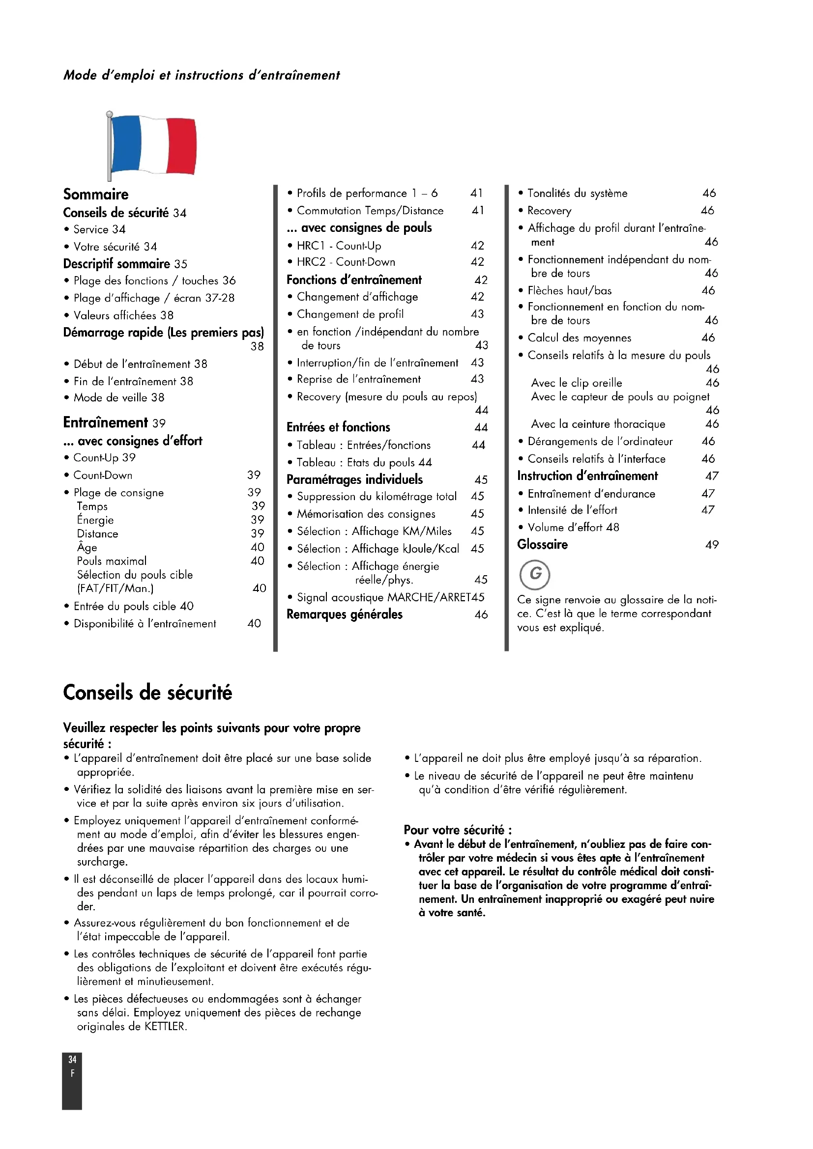 - Avant le début de l’entraînement, n’oubliez pas de faire con-trôler par votre médecin si vous êtes apte à l’entraînementavec cet appareil. Le résultat du contrôle médical doit consti-tuer la base de l’organisation de votre programme d’entraî-nement. Un entraînement inapproprié ou exagéré peut nuireà votre santé. Sommaire Conseils de sécurité 34