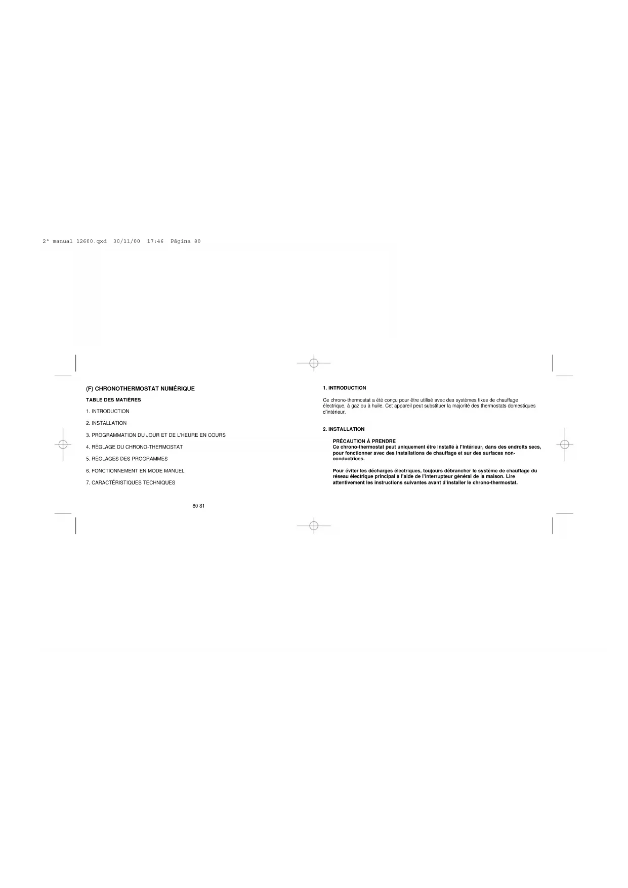 2º manual 12600.qxd 30/11/00 17:46 Página 781. INTRODUCTION Ce chrono-thermostat a été conçu pour être utilisé avec des systèmes fixes de chauffage électrique, à gaz ou à huile. Cet appareil peut substituer la majorité des thermostats domestiques d'intérieur.