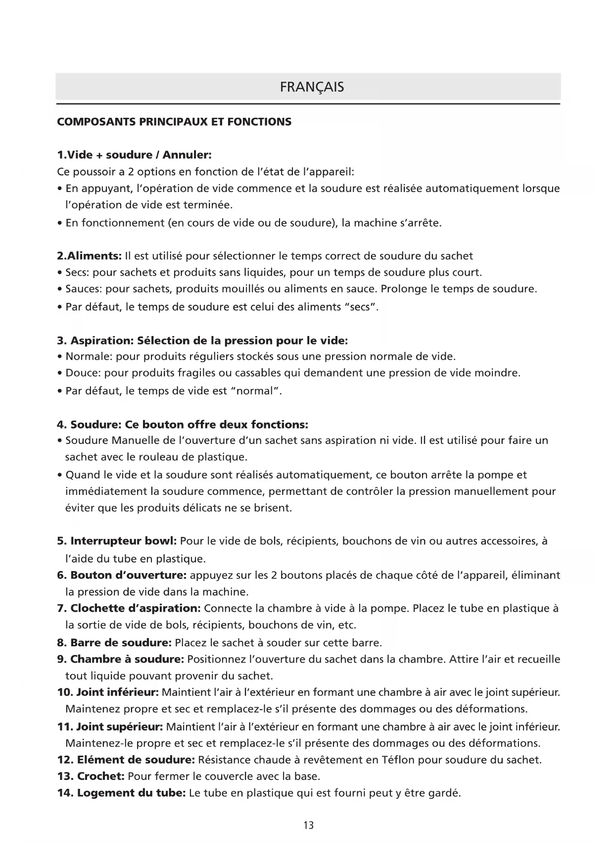 - Pour un meilleur effet de soudure, il est préférable de laisser refroidir la machine durant 1 minute avant de la réutiliser. Eliminez le reste de liquide ou aliment de la chambre à vide avant de réaliser une autre mise en paquet.