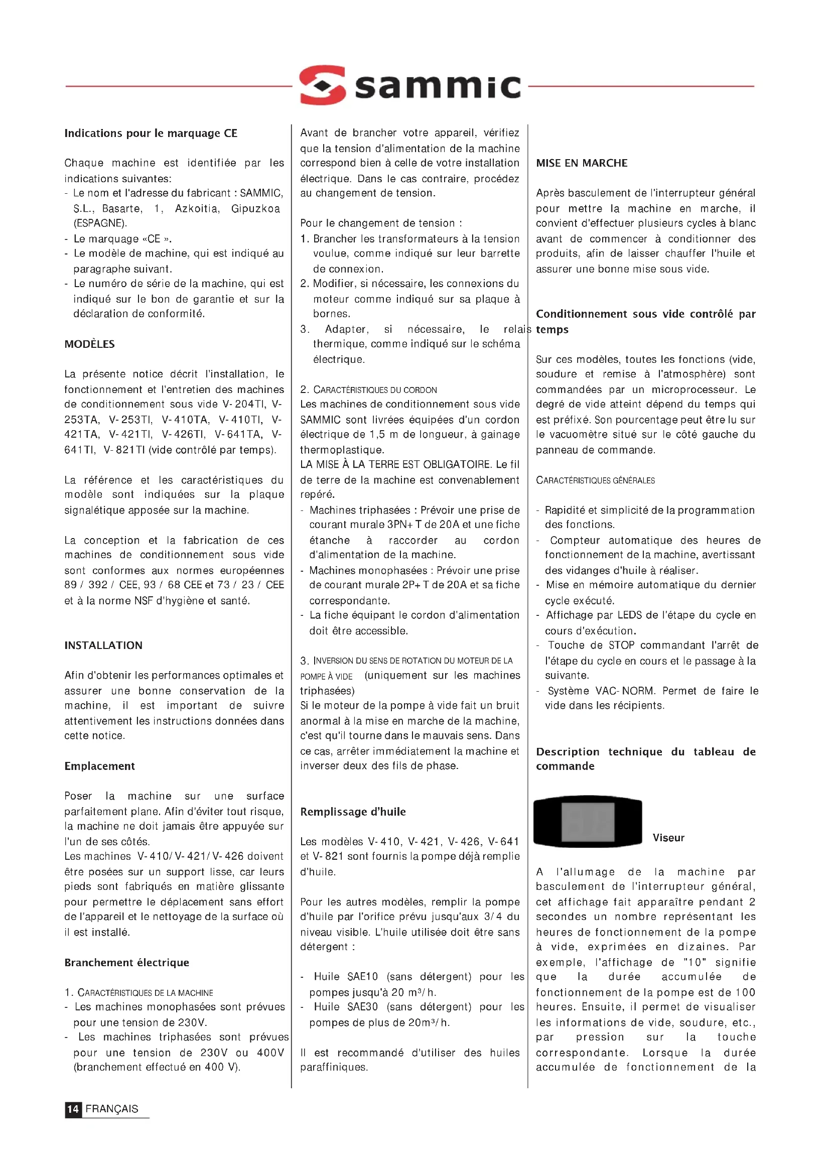 DEUTSCH GRUNDKENNTNISSE ÜBER DAS VAKUUMABPACKENIndications pour le marquage CE Chaque machine est identifiée par les indications suivantes: - Le nom et l'adresse du fabricant : SAMMIC, S.L., Basarte, 1, Azkoitia, Gipuzkoa (ESPAGNE). - Le marquage «CE ». - Le modèle de machine, qui est indiqué au paragraphe suivant. - Le numéro de série de la machine, qui est indiqué sur le bon de garantie et sur la déclaration de conformité. MODÈLES La présente notice décrit l'installation, le fonctionnement et l'entretien des machines de conditionnement sous vide V-204TI, V- 253TA, V-253TI, V-410TA, V-410TI, V- 421TA, V-421TI, V-426TI, V-641TA, V- 641TI, V-821TI (vide contrôlé par temps). La référence et les caractéristiques du modèle sont indiquées sur la plaque signalétique apposée sur la machine. La conception et la fabrication de ces machines de conditionnement sous vide sont conformes aux normes européennes 89 / 392 / CEE, 93 / 68 CEE et 73 / 23 / CEE et à la norme NSF d'hygiène et santé. INSTALLATION Afin d'obtenir les performances optimales et assurer une bonne conservation de la machine, il est important de suivre attentivement les instructions données dans cette notice. Emplacement Poser la machine sur une surface parfaitement plane. Afin d'éviter tout risque, la machine ne doit jamais être appuyée sur l'un de ses côtés. Les machines V-410/V-421/V-426 doivent être posées sur un support lisse, car leurs pieds sont fabriqués en matière glissante pour permettre le déplacement sans effort de l'appareil et le nettoyage de la surface où il est installé. Branchement électrique