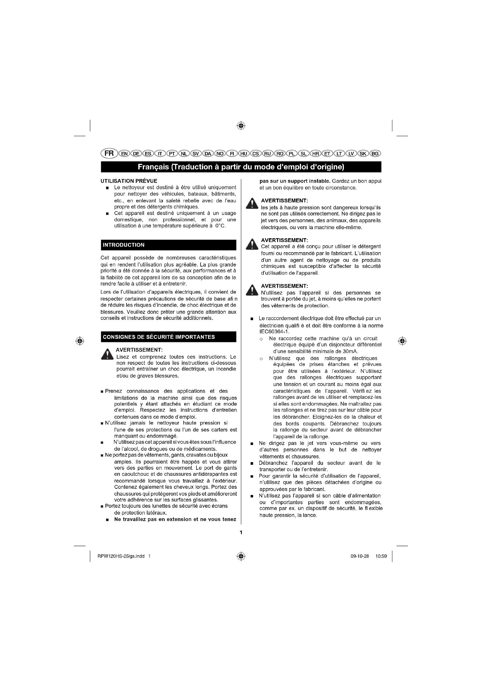 RPW130HS - Nettoyeur haute pressio RYOBI - Notice d'utilisation et mode d'emploi gratuit