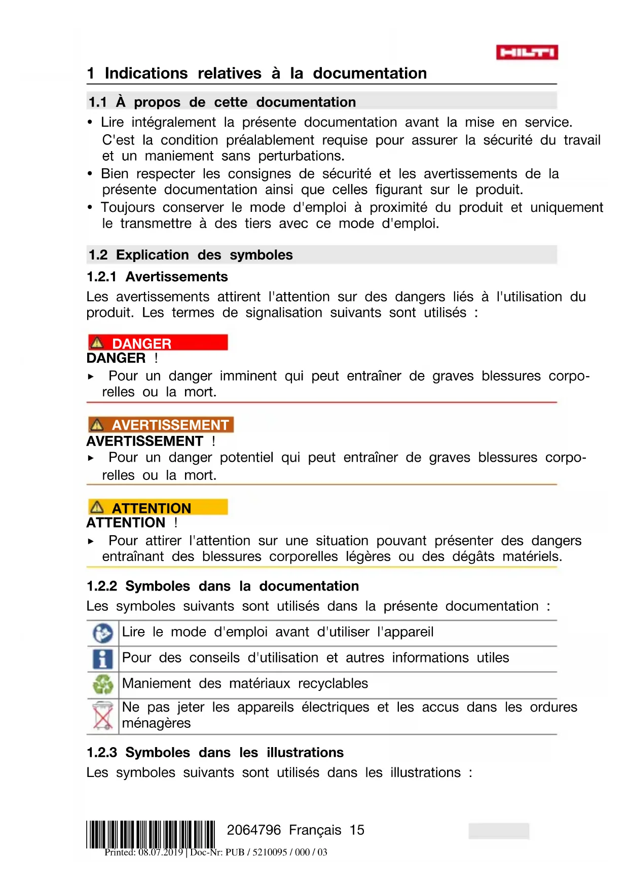 Nous déclarons sous notre seule et unique responsabilité que le produit décrit ici est conforme aux directives et normes en vigueur. Une copie de l'attestation délivrée par l'organisme de certification se trouve en fin de la présente documentation. Pour obtenir les documentations techniques, s'adresser à : Printed: 08.07.2019 | Doc-Nr: PUB / 5210095 / 000 / 03*2064796* 2064796 Français 17 Hilti Entwicklungsgesellschaft mbH | Zulassung Geräte | Hiltistraße 6 | 86916 Kaufering, DE 2 Sécurité