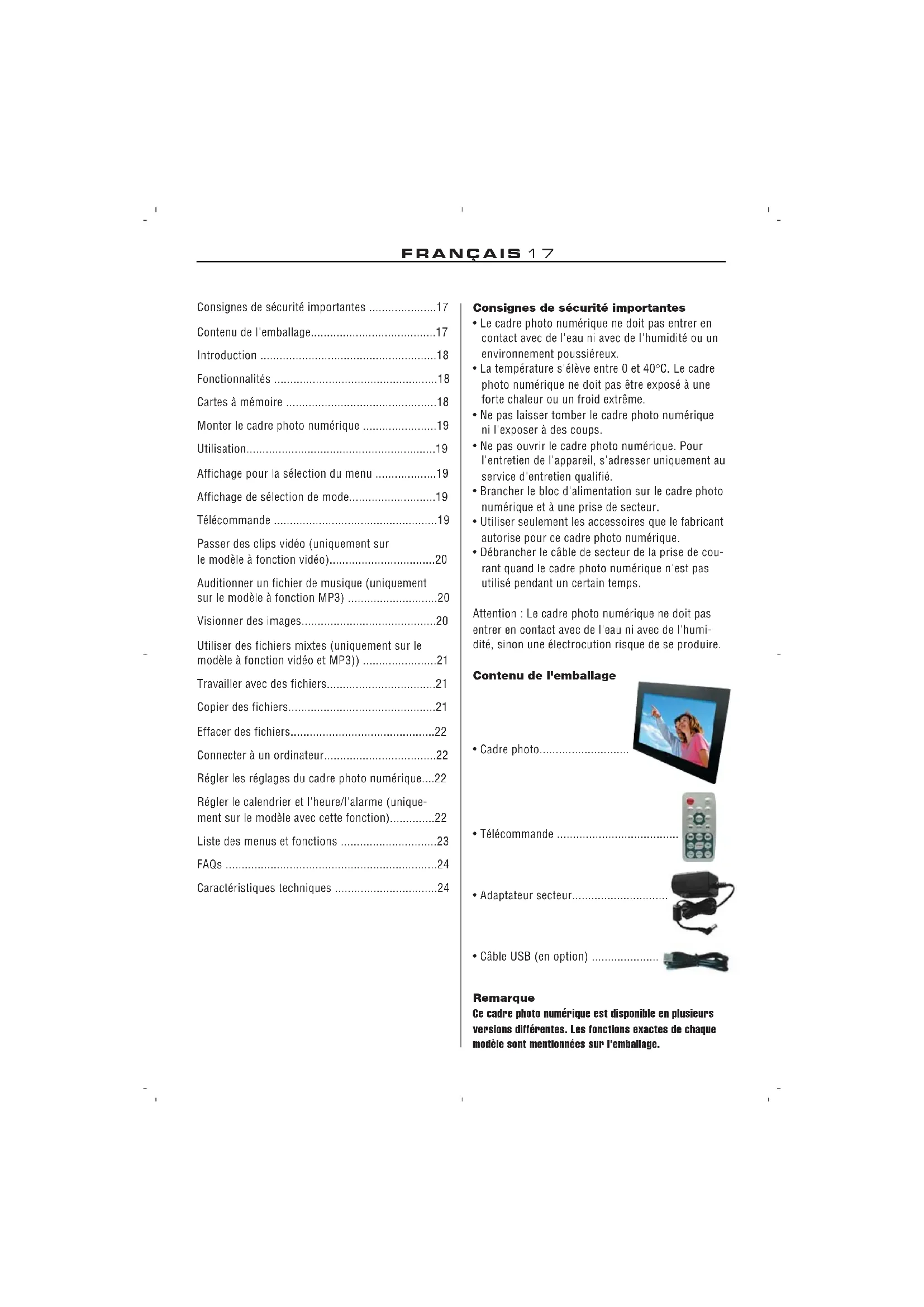 - Câble USB (en option) ......................................... Remarque Ce cadre photo numérique est disponible en plusieurs versions différentes. Les fonctions exactes de chaque modèle sont mentionnées sur l'emballage.FRANÇAIS18 Introduction Vous venez d'acheter DigiFrame, félicitations pour vot- re choix. Cet appareil vous permet de visionner vos images numériques directement à partir d'une carte à mémoi- re, sans avoir recours à un ordinateur. Il vous suffit d'introduire une carte à mémoire dans DigiFrame et de le mettre en marche pour regarder vos images en diaporama. C'est tout simple ! Avec DigiFrame, vous avez la possibilité de visionner des images individuelles, de passer des clips vidéo ou de la musique de fond avec un diaporama (unique- ment sur les modèles à fonction vidéo et MP3). Lisez attentivement ce mode d'emploi pour décou- vrir toutes les fonctions de votre nouveau DigiFra- me et apprendre à l'utiliser. Remarque DigiFrame existe en différentes versions. Les fonctions exactes de chaque modèle DigiFrame sont mentionnées sur l'emballage. Fonctionnalités: