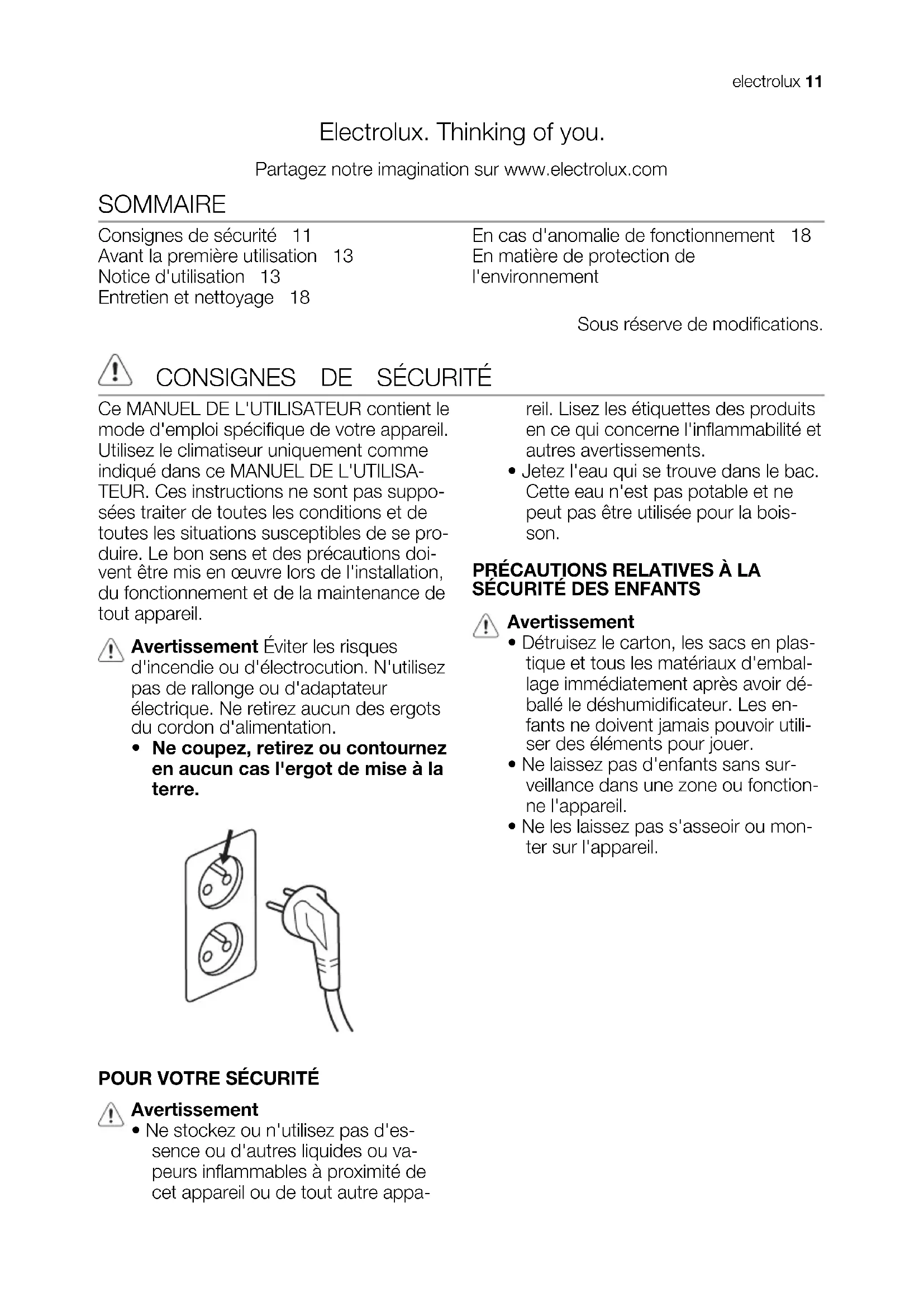 - Ce déshumidificateur contient des pièces qui ne peuvent pas être répa- rées l'utilisateur. Faites toujours ap- pel à un réparateur agréé par Elec- trolux pour les réparations.