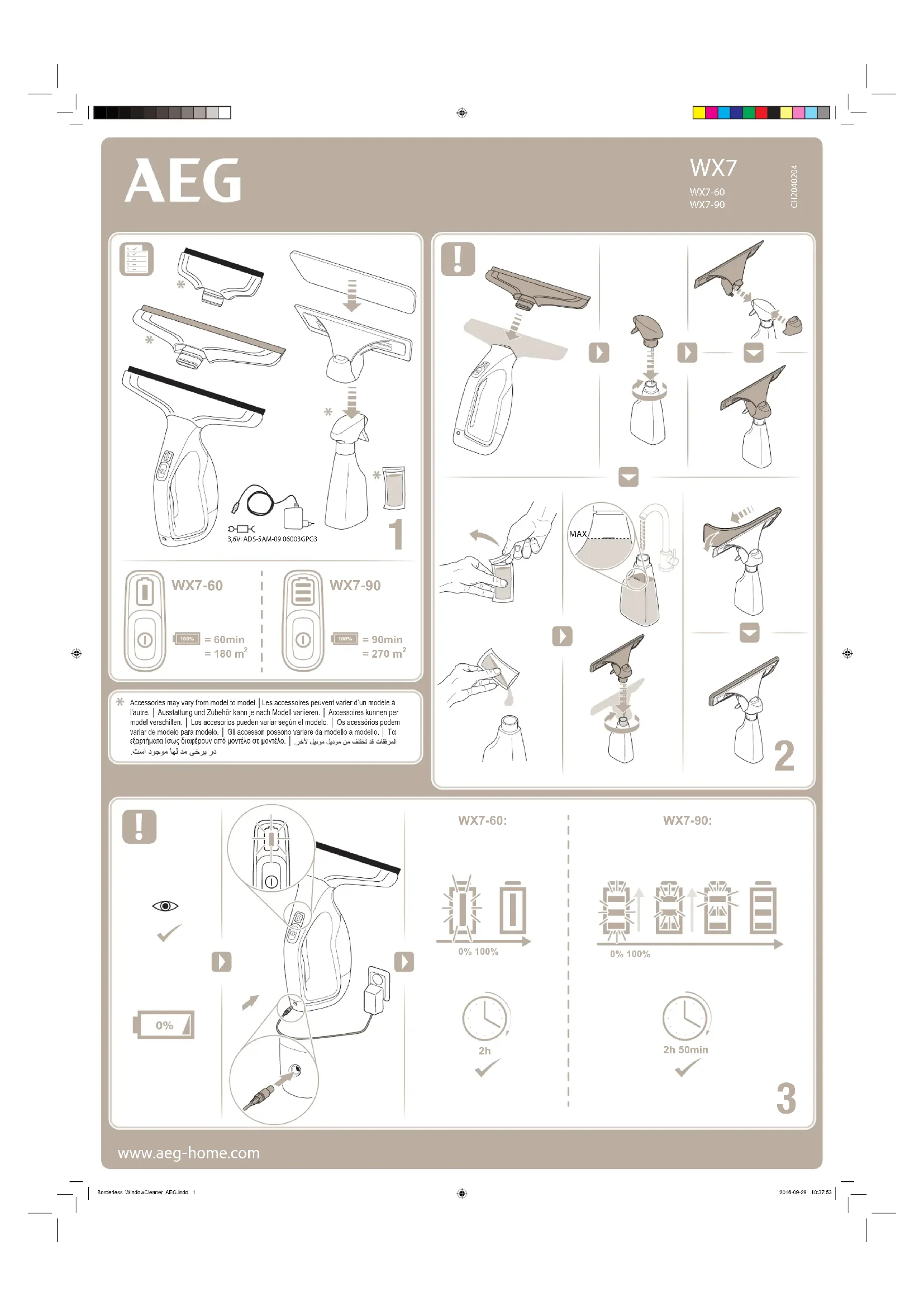 - Empty the water tank regularly. Never exceed the “MAX” water level indicated on the water tank. Using the appliance in the above circumstances may cause serious personal injury or damage to the product. Such injury or damage is not covered by the warranty or by AEG. This warranty does not cover reduction in battery runtime due to battery age or use, as the life of the battery depends upon the amount and nature of use. Français Merci d'avoir choisi un nettoyeur de vitres AEG WX7. Le WX7 est un nettoyeur de vitres rechargeable destiné à un usage accessoires et pièces de rechange AEG. Ils ont été spécialement conçus pour votre nettoyeur de vitres. Précautions de sécurité par des personnes ayant des capacités physiques, sensorielles ou mentales réduites, ou par des personnes manquant d'expérience ou de connaissances, à condition d'être surveillés, ou d'avoir reçu des instructions concernant l'utilisation de l'appareil en toute sécurité et de comprendre les risques encourus. Les enfants ne doivent pas jouer avec l'appareil. sans surveillance. d'entretien. L'appareil ne doit être utilisé que dans un environnement domestique normal. Veillez à ranger l'appareil dans un endroit sec. Toutes les opérations de maintenance et réparations doivent être une opération de maintenance. Ne laissez pas les matériaux d'emballage, comme les sachets en plastique, la tension de votre alimentation électrique est identique à la tension indiquée sur la plaque signalétique apposée sur le chargeur. Utilisez uniquement le chargeur d'origine conçu pour le nettoyeur de vitres WX7 d'AEG.