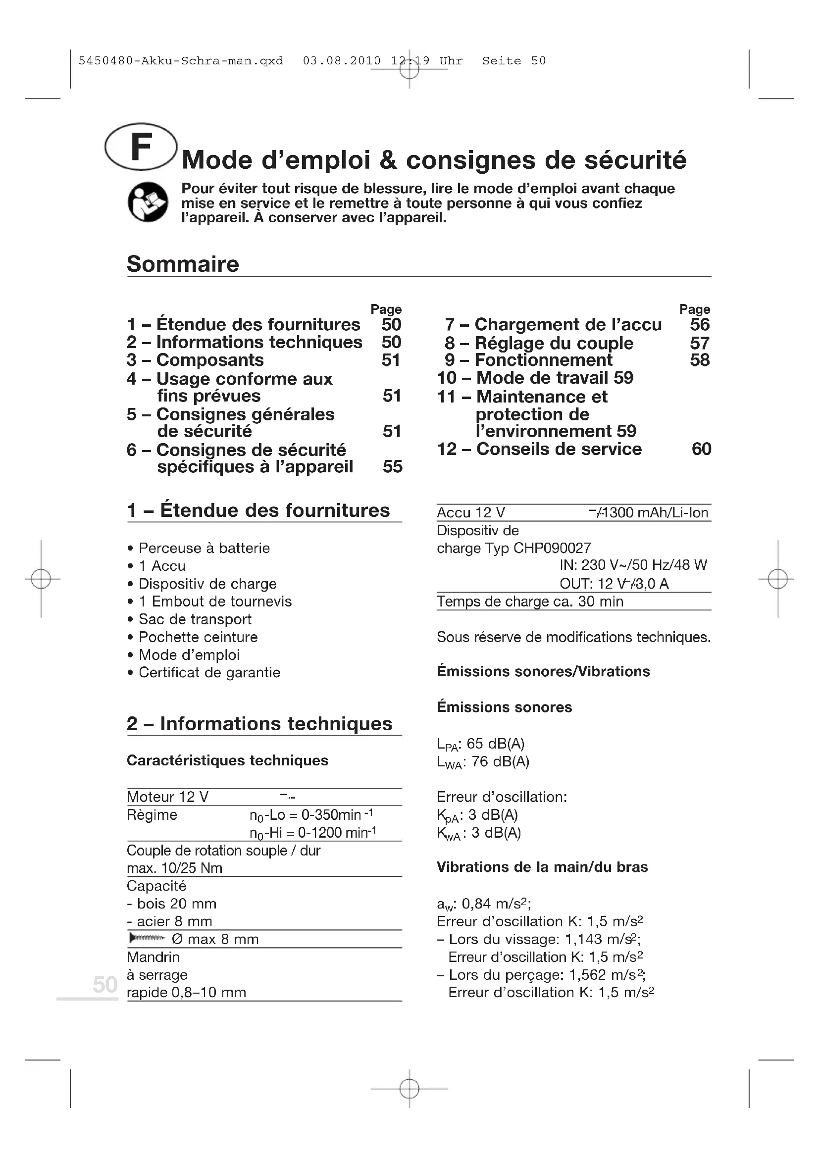ATTENTION! L'accu quitte nos usines non complètement charge. L'accu doit être charge avant la première utilisation.