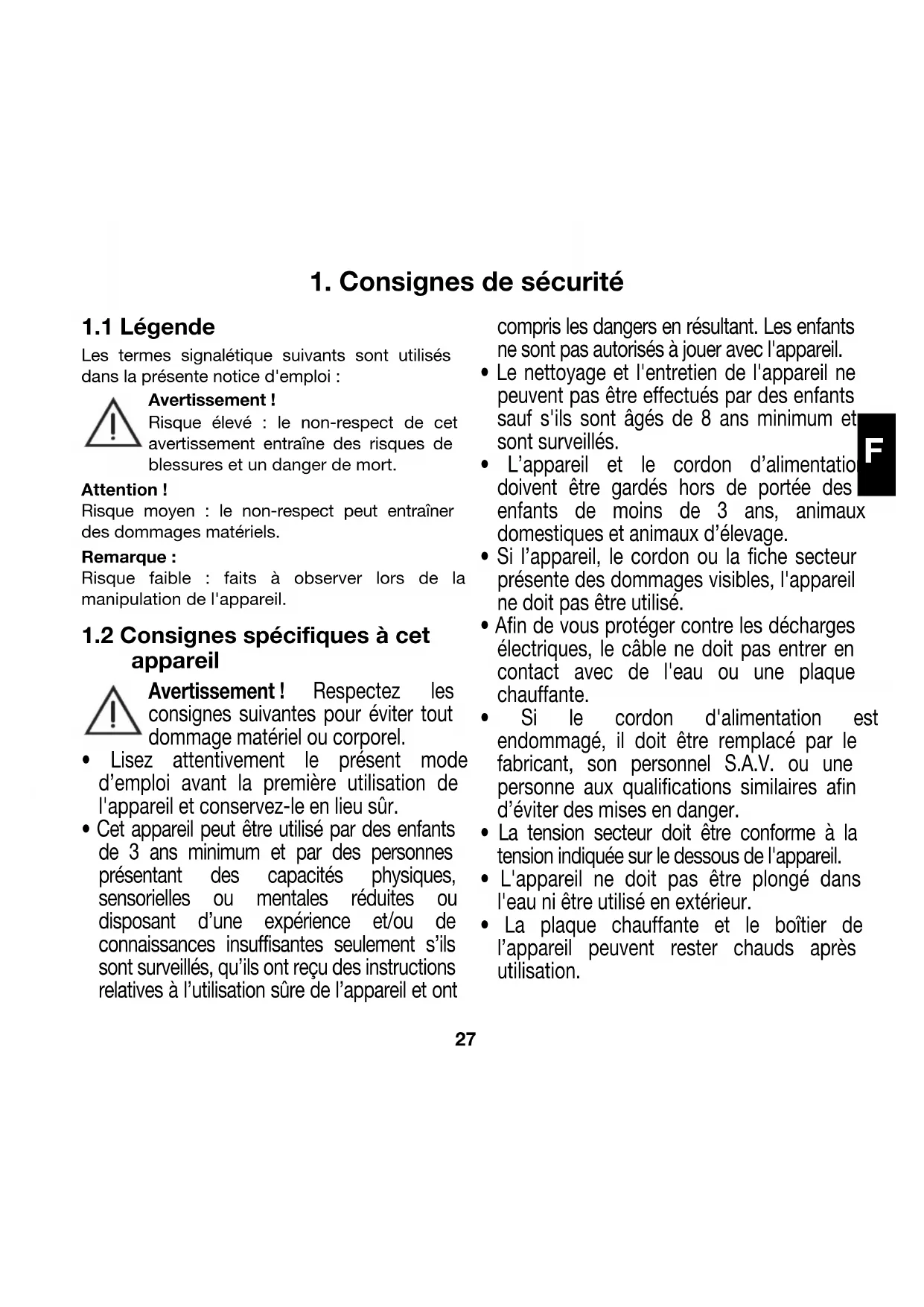- Cet appareil peut être utilisé par des enfants de 3 ans minimum et par des personnes présentant des capacités physiques, sensorielles ou mentales réduites ou disposant d’une expérience et/ou de connaissances insuffisantes seulement s’ils sont surveillés, qu’ils ont reçu des instructions relatives à l’utilisation sûre de l’appareil et ont compris les dangers en résultant. Les enfants ne sont pas autorisés à jouer avec l'appareil.